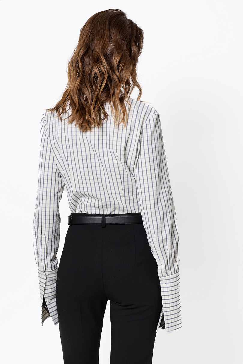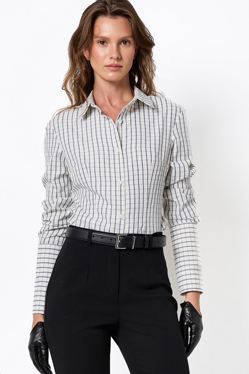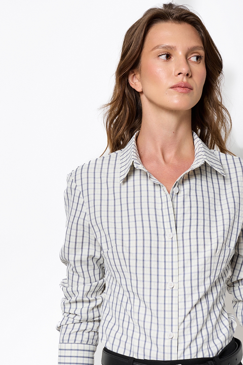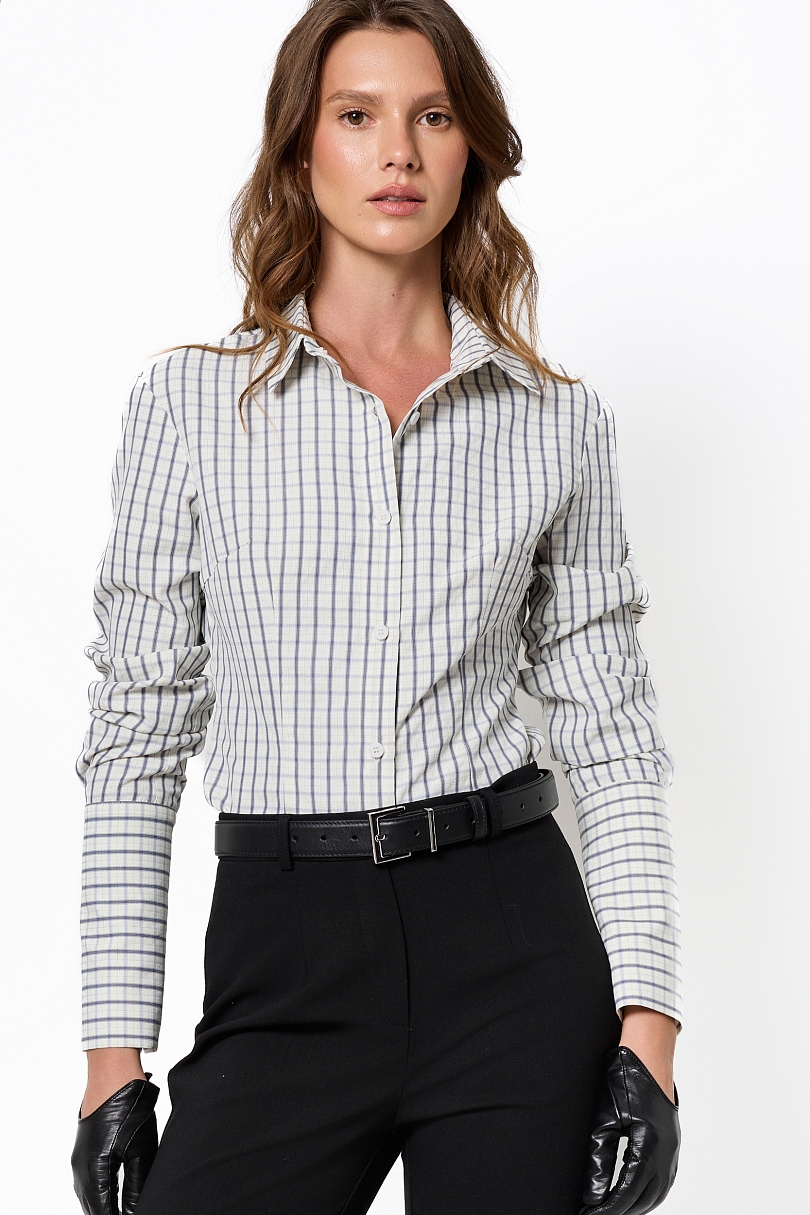 Яркая рубашка приталенного кроя в классическую бело-голубую клетку — идеальный акцент для динамичных образов! Удачно подчеркивает фигуру, с острым воротником и длинными рукавами, где акцентные манжеты с контрастной отделкой добавляют характера. Застежка на пуговицы, эластичный хлопок с вискозой обеспечивает комфорт и легкую драпировку.