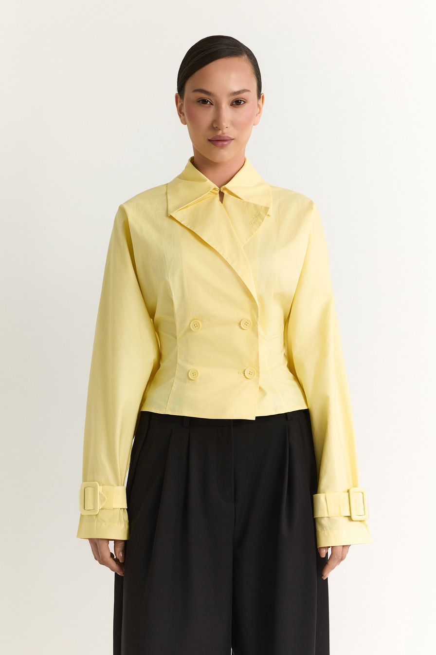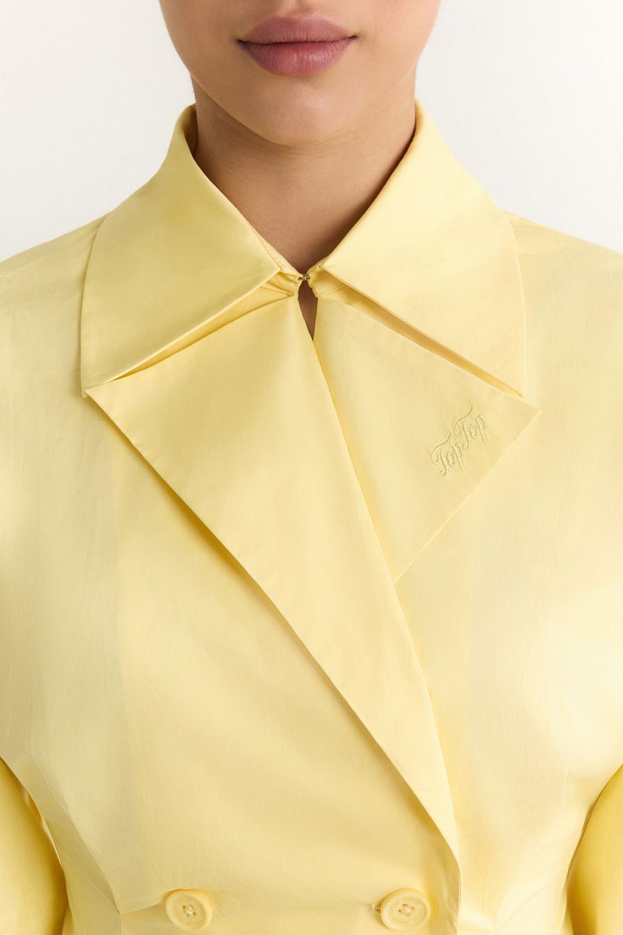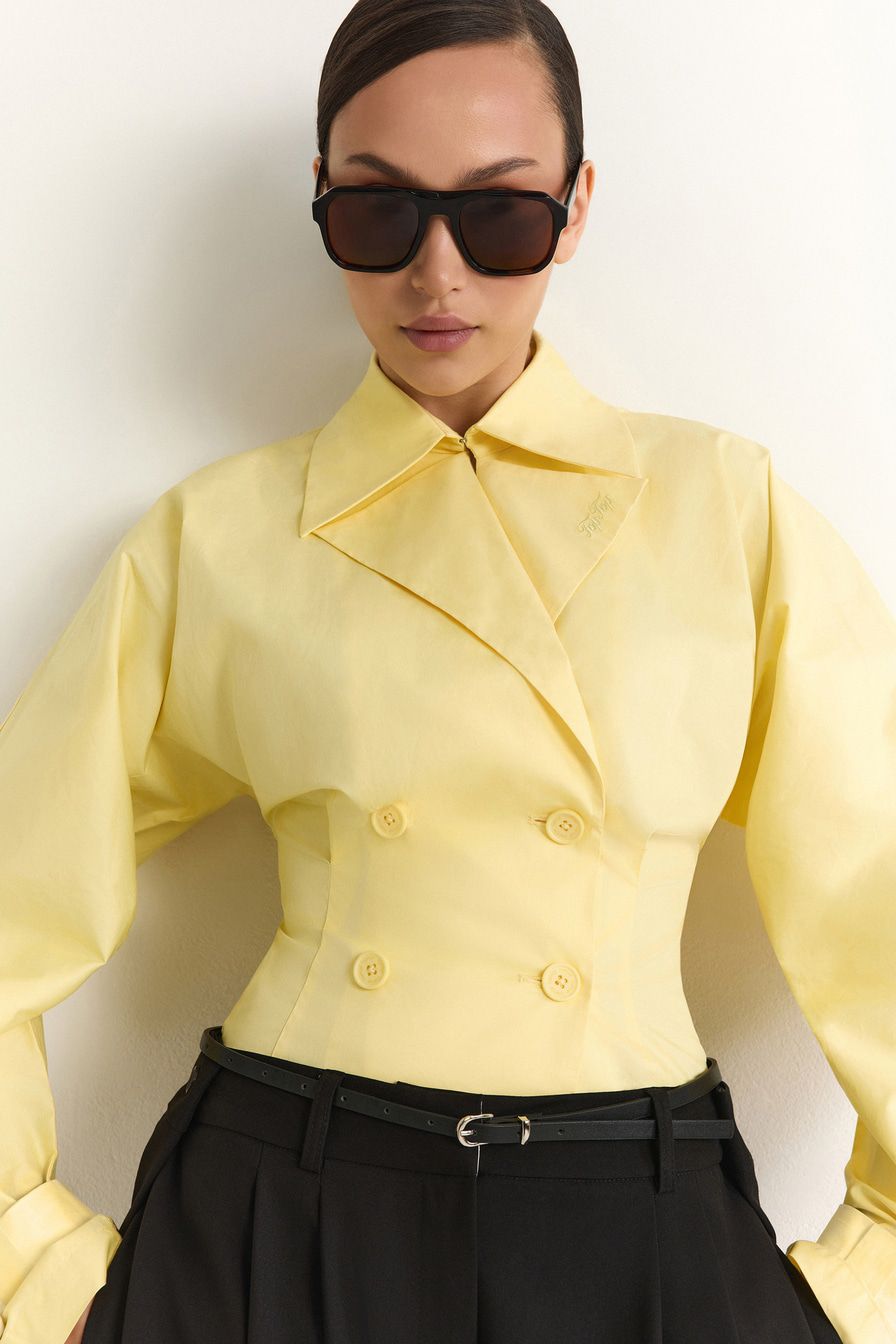 Желтая рубашка из 100% хлопка – модель двубортного приталенного кроя, имитирующая жакет. Рубашка дополнена широкими лацканами, отложным воротником и ремешками на манжетах.