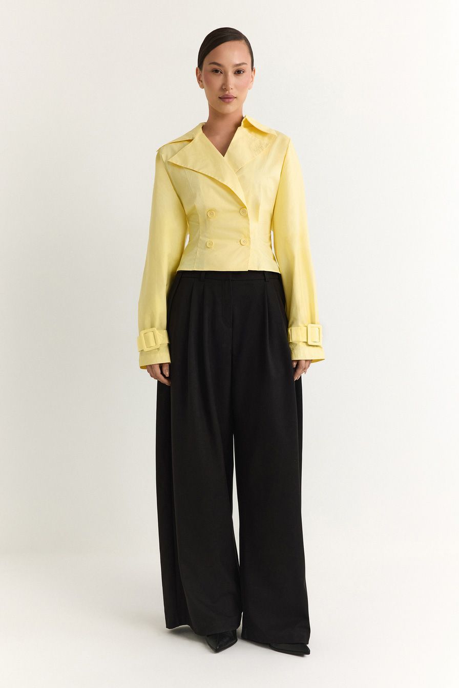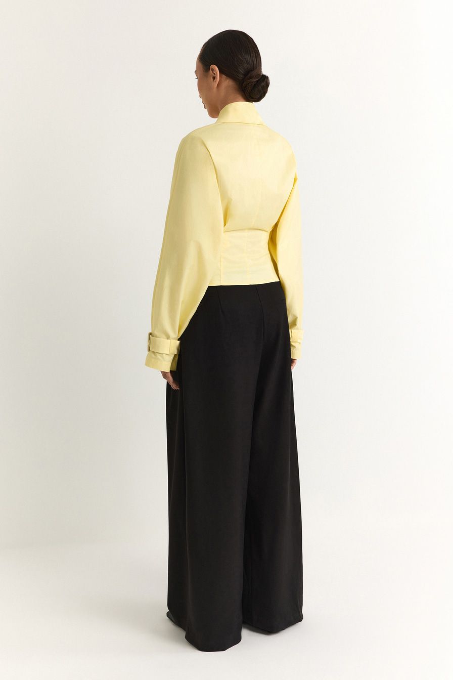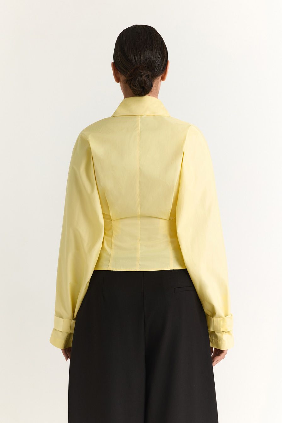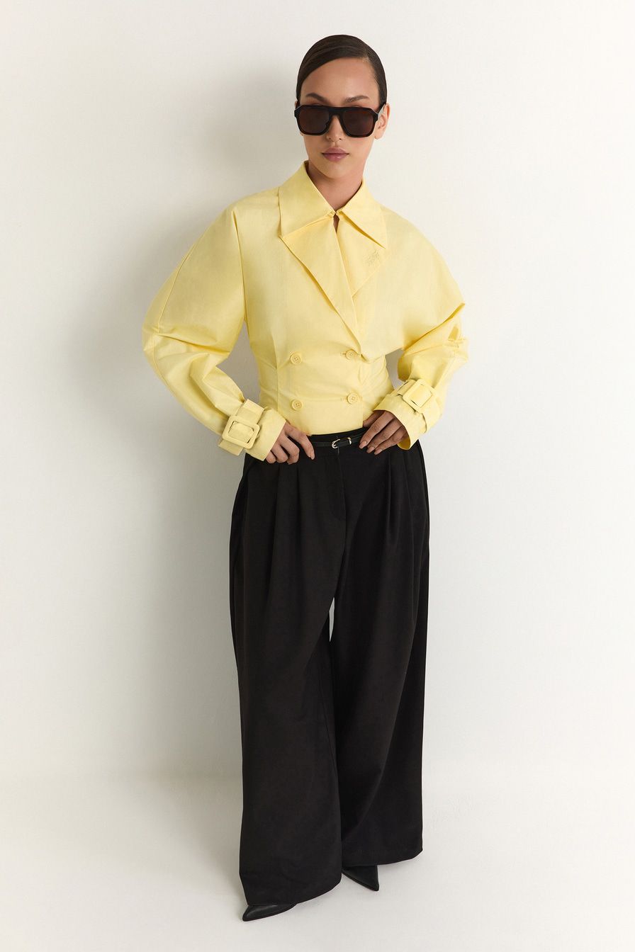 Желтая рубашка из 100% хлопка – модель двубортного приталенного кроя, имитирующая жакет. Рубашка дополнена широкими лацканами, отложным воротником и ремешками на манжетах.