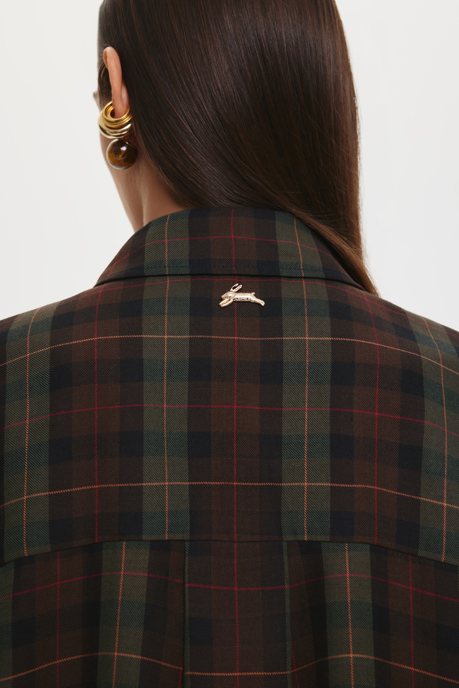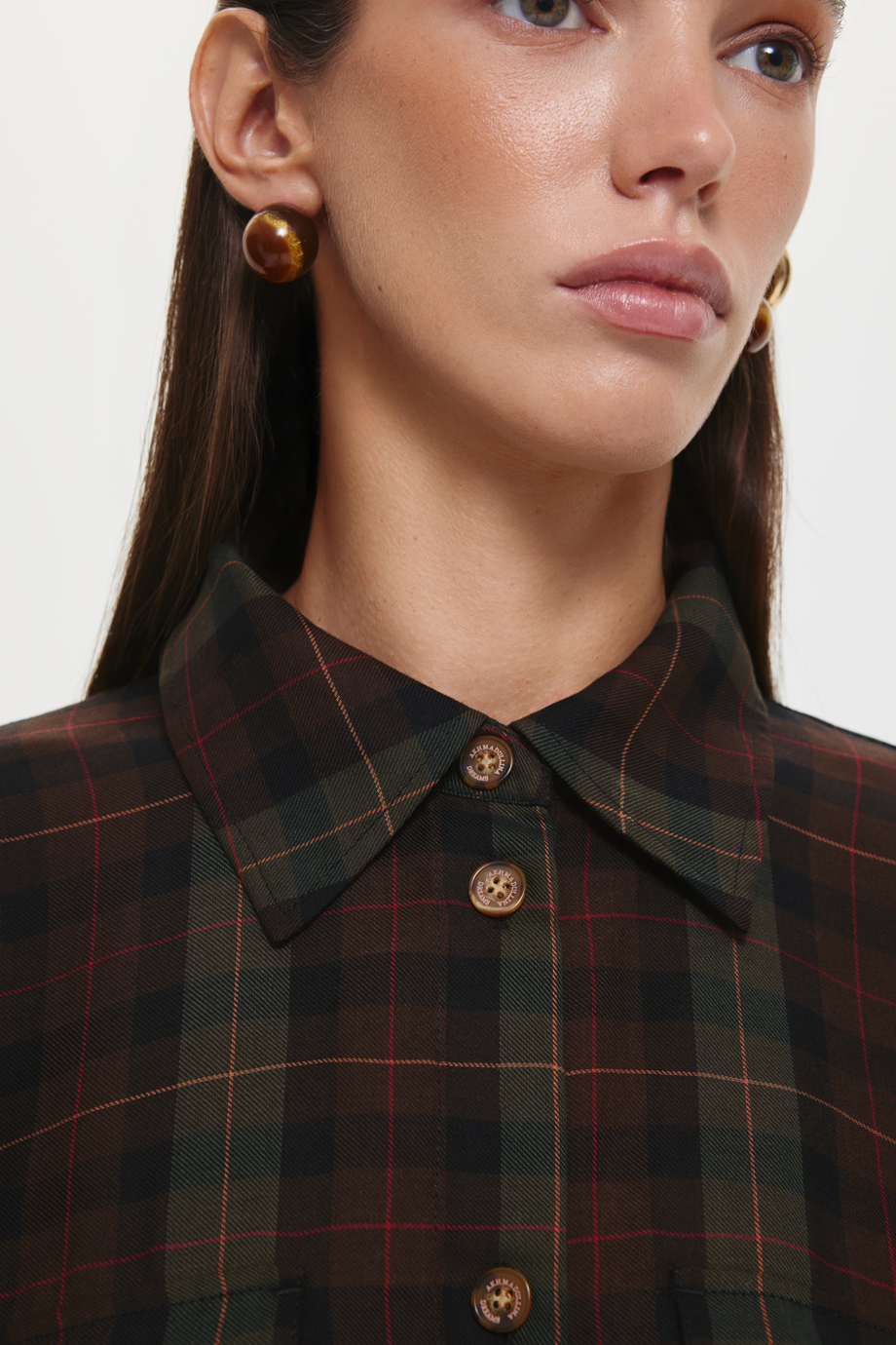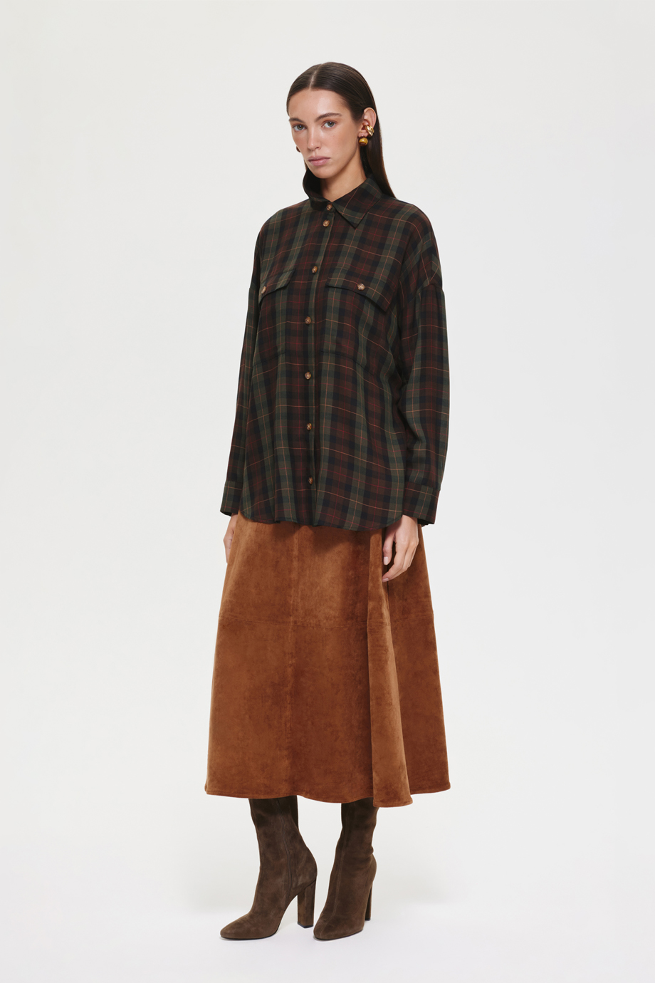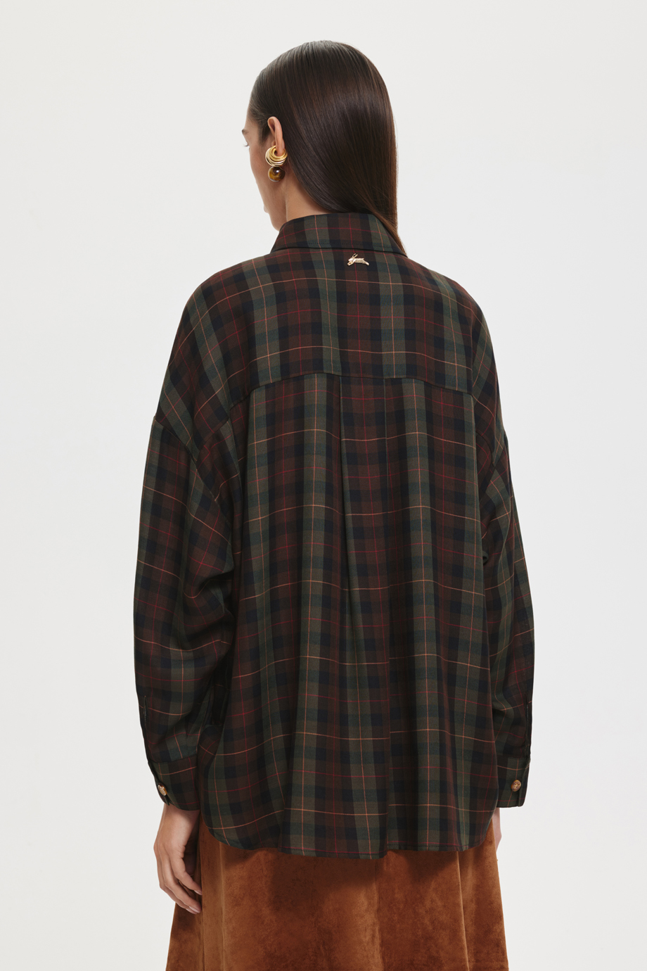 Тёмные тона клетки придают рубашке изысканность и элегантность. Рубашка может стать основой для создания различных образов — от деловых до более расслабленных. Прекрасно сочетается с джинсами, брюками или юбками. Такая рубашка подойдёт для офиса, встреч с друзьями или прогулок по городу.