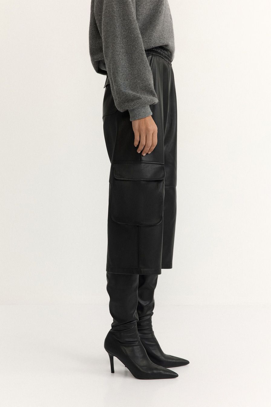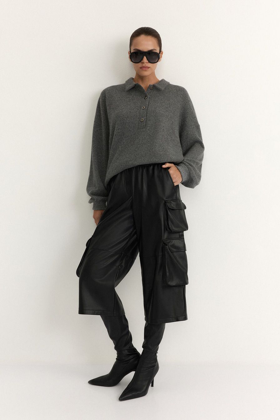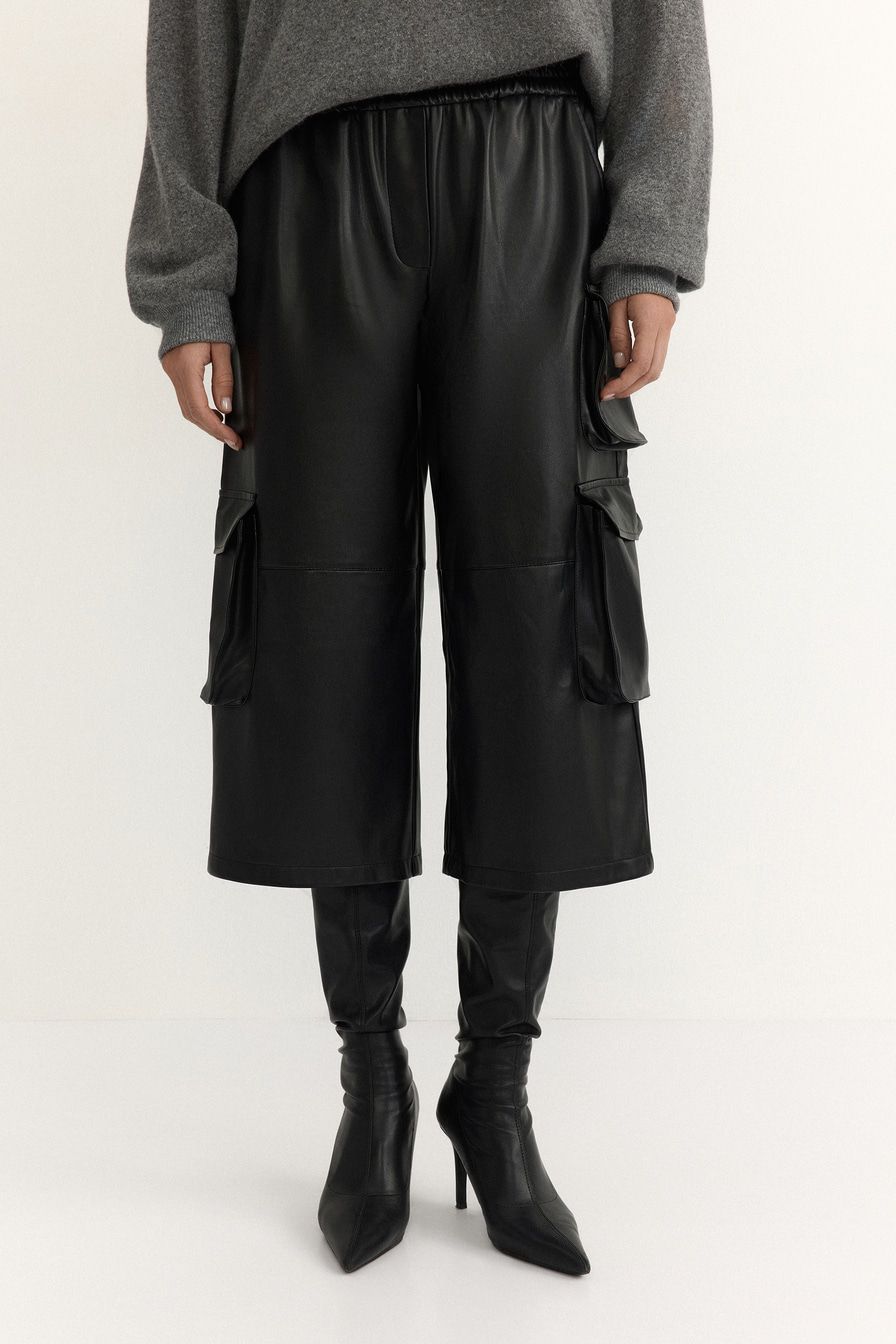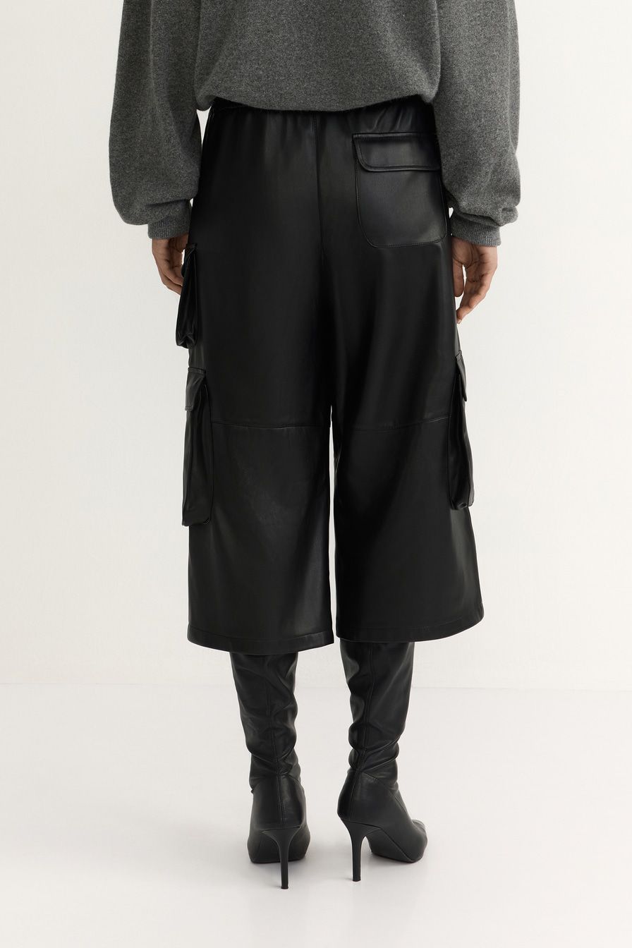 Черные шорты-миди из экокожи – модель свободного кроя. Шорты дополнены крупными накладными карманами и резинкой на поясе.