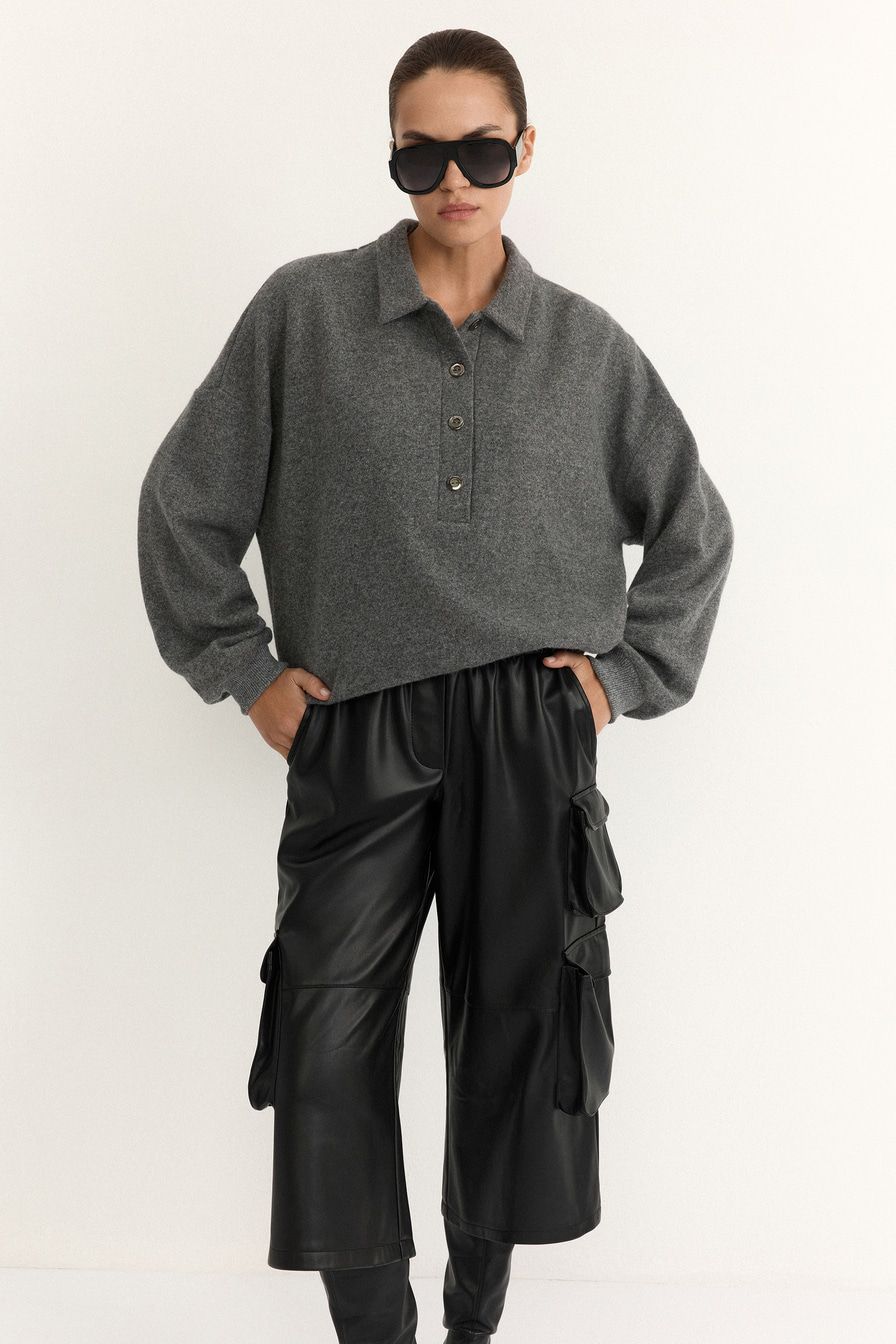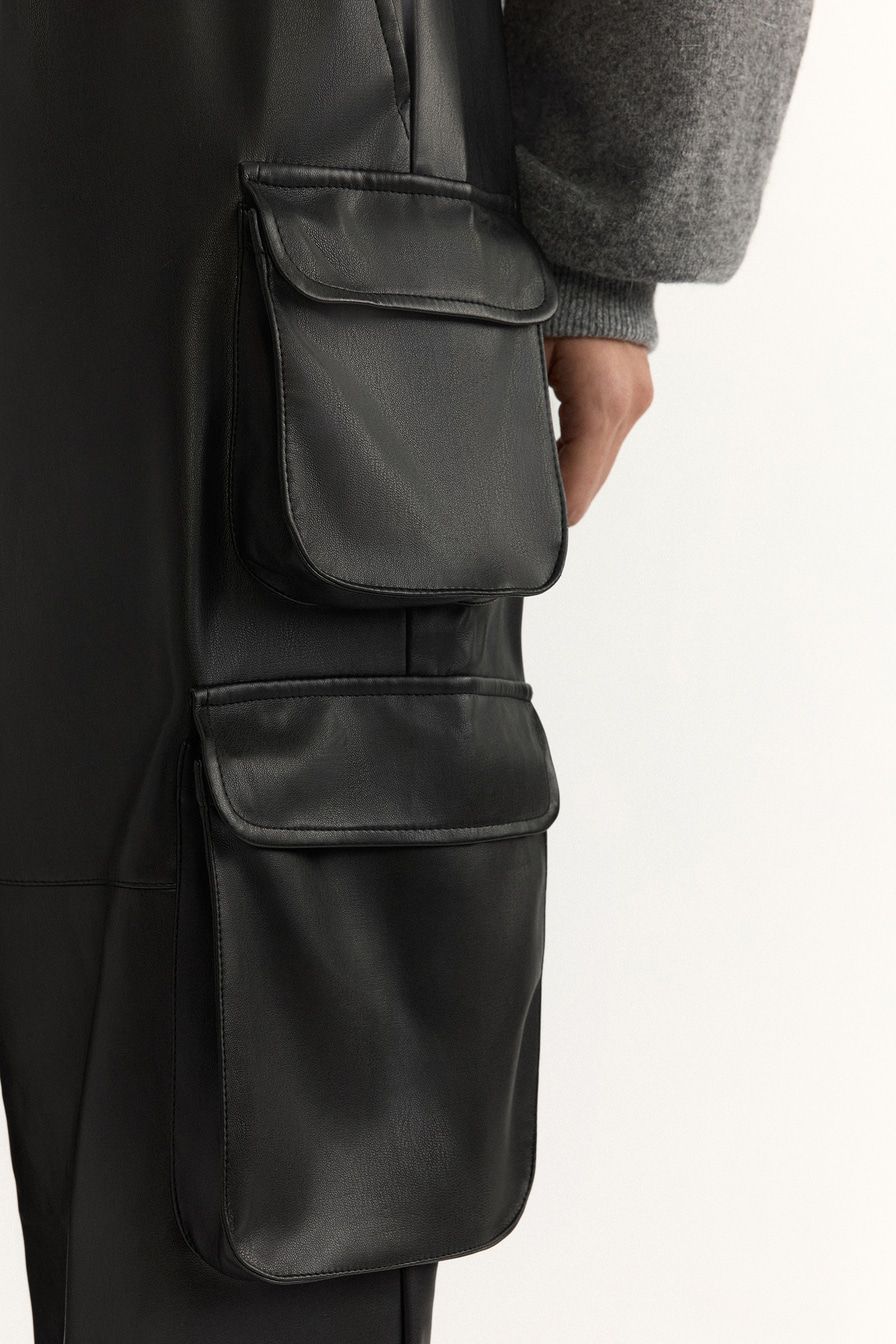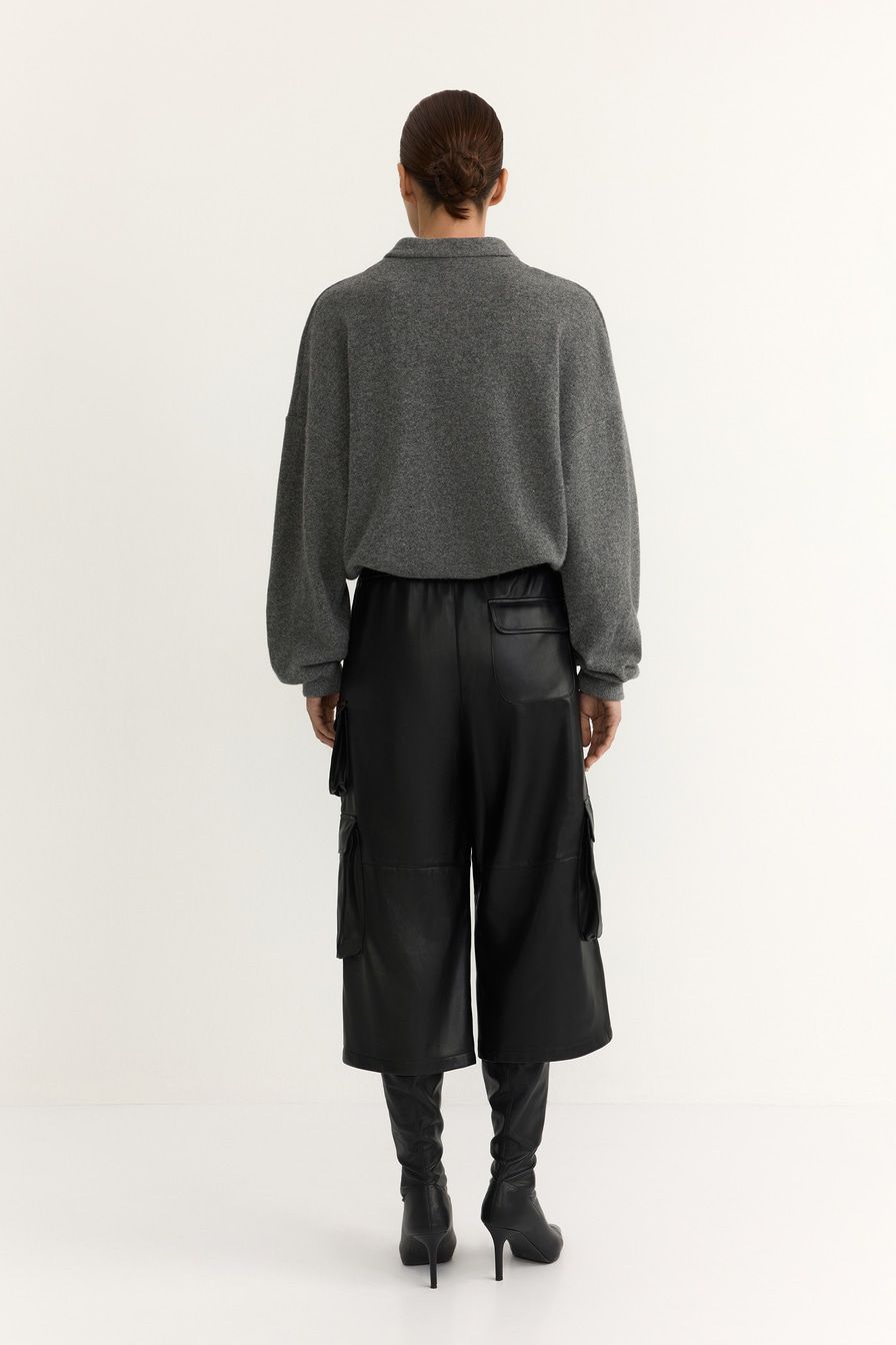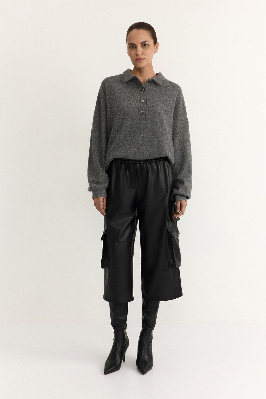 Черные шорты-миди из экокожи – модель свободного кроя. Шорты дополнены крупными накладными карманами и резинкой на поясе.