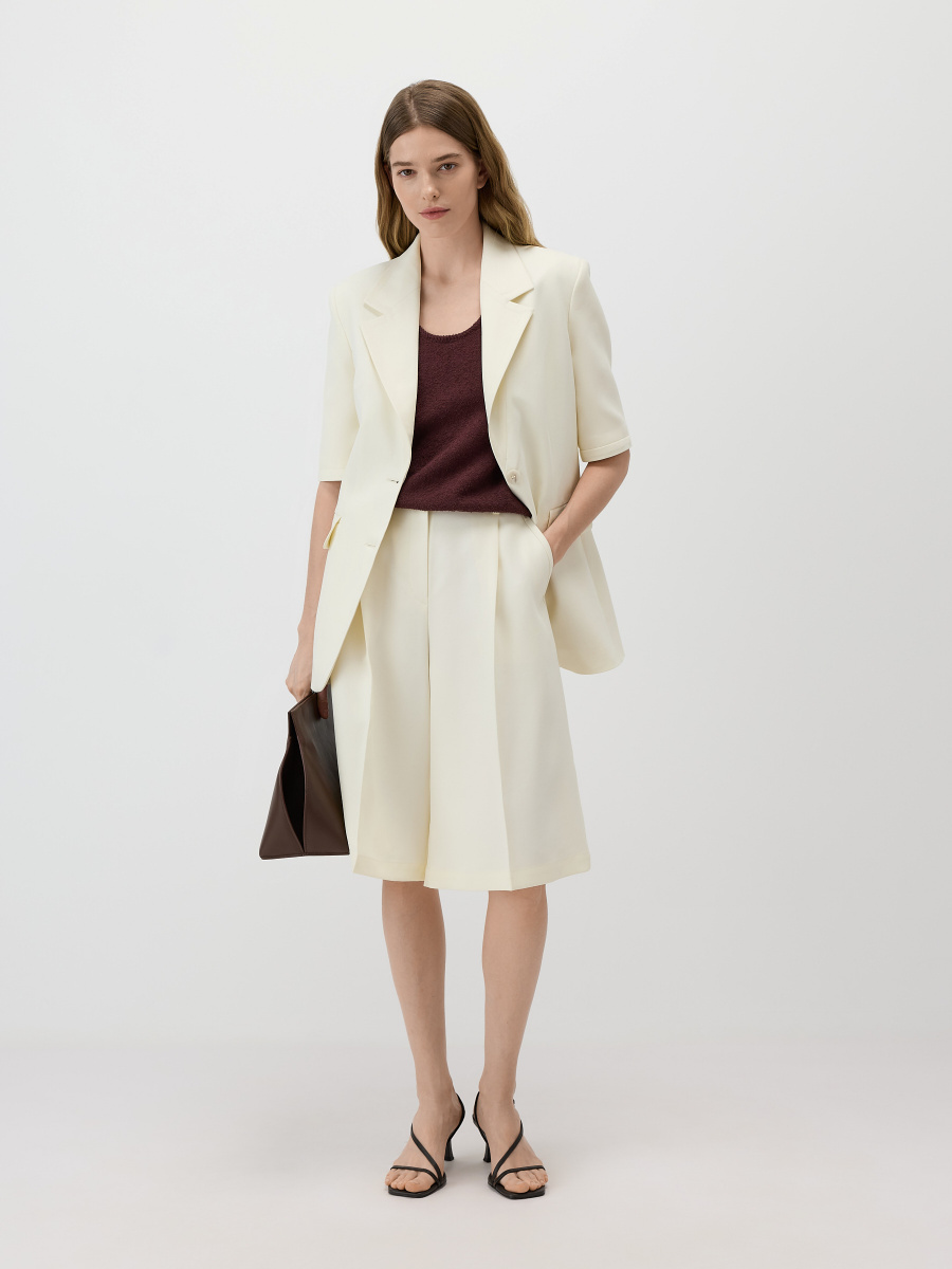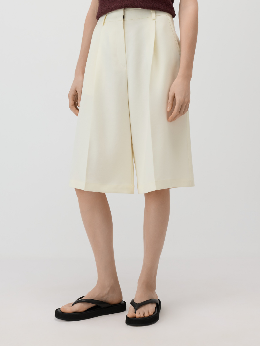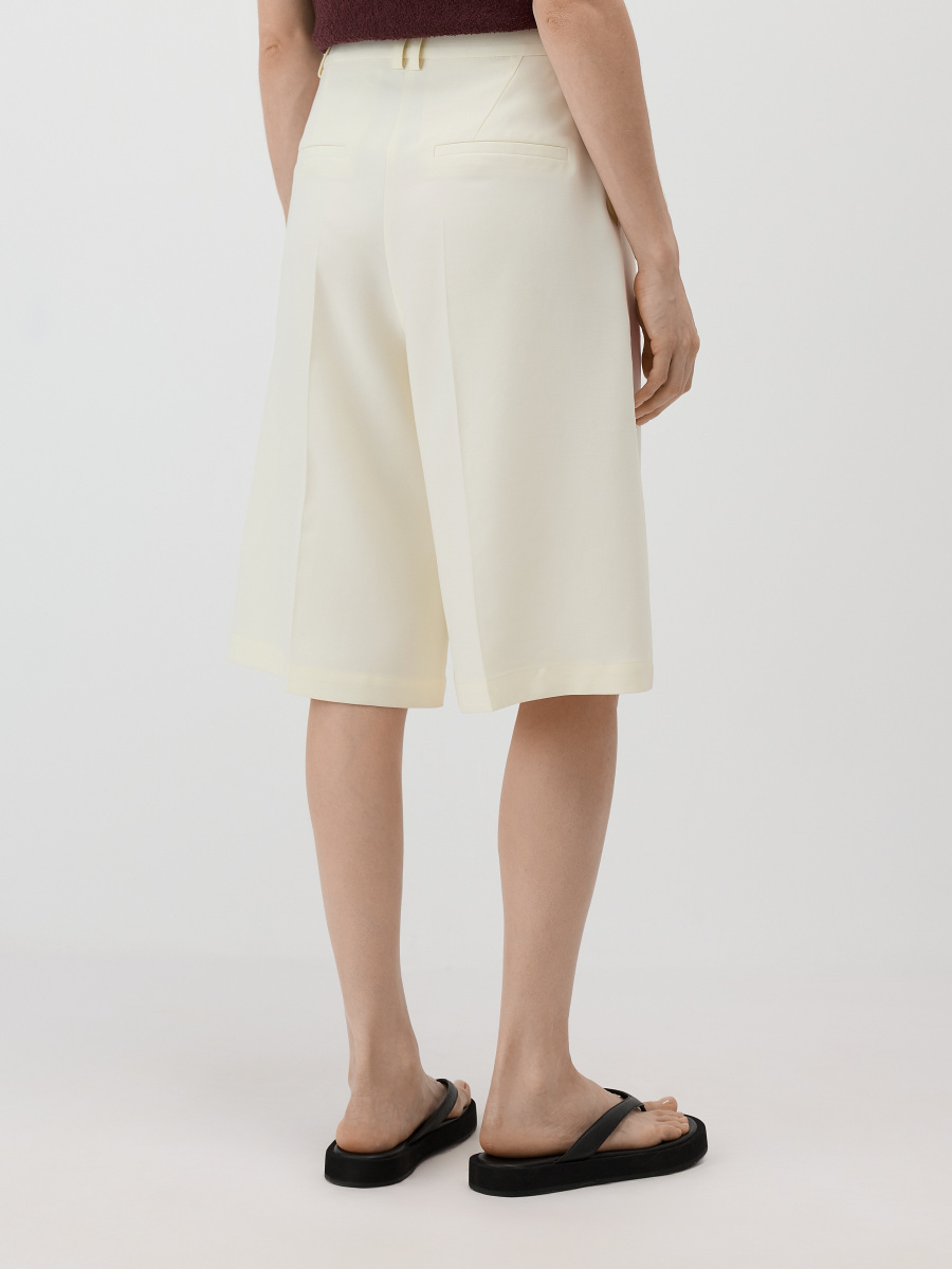 Шорты-бермуды с заутюженными стрелками — слегка расклешенные, умеренно свободные, со средней посадкой и длиной до колена. Передние карманы интегрированы в боковые швы, а задние выполнены в виде «обманки», как отсылка к классическому стилю. Декоративная отстрочка по боковым швам и передним карманам добавляет графичности. 100% натуральная ткань на основе «эвкалиптового шелка» лиоцелла — не мнется, пропускает воздух и ложится оформленными складками.