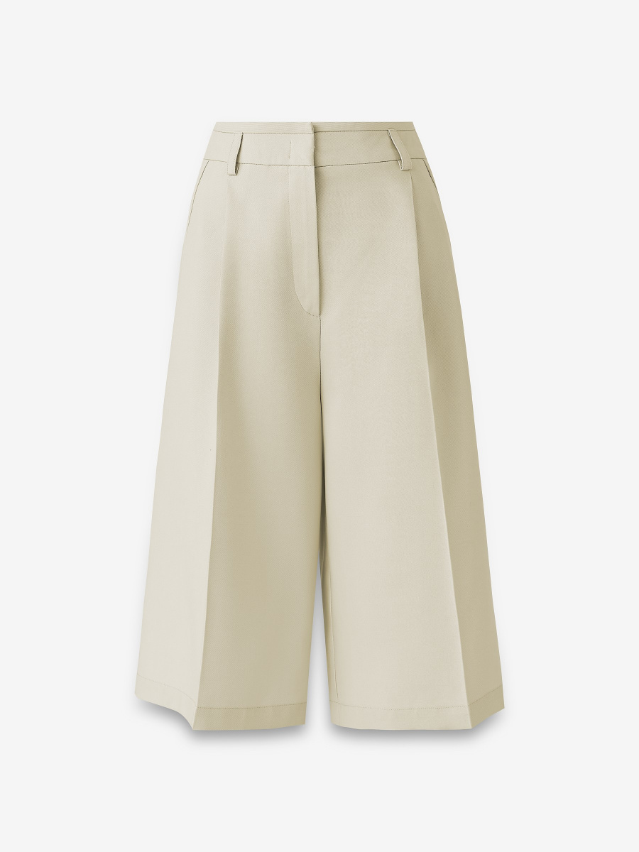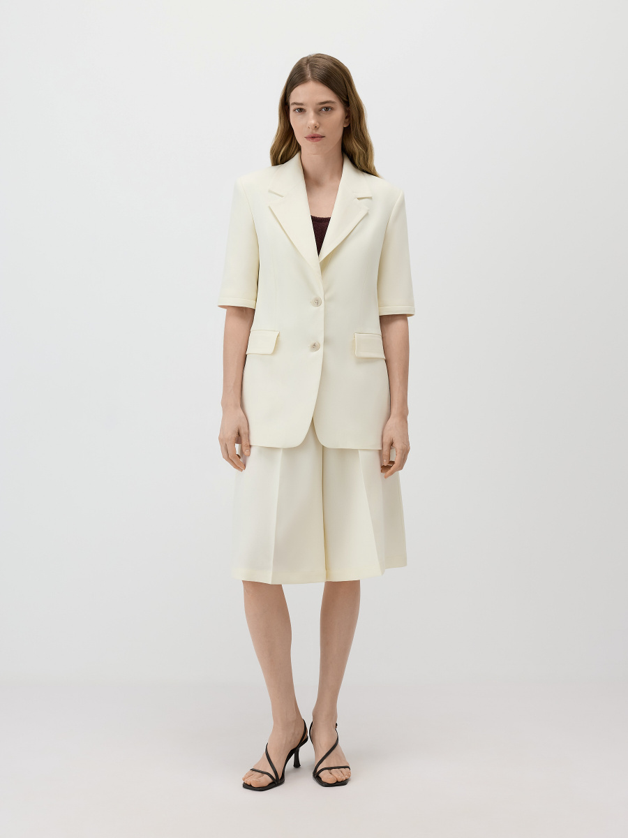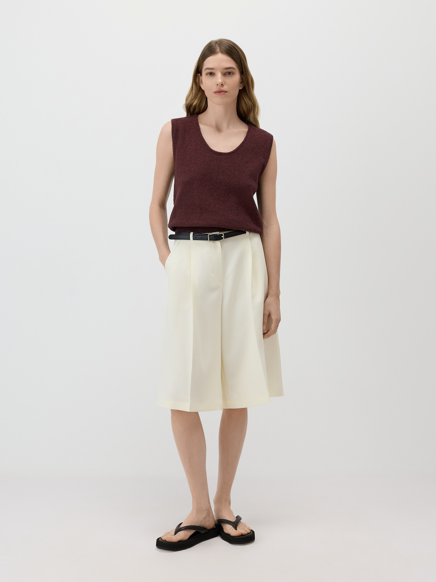 Шорты-бермуды с заутюженными стрелками — слегка расклешенные, умеренно свободные, со средней посадкой и длиной до колена. Передние карманы интегрированы в боковые швы, а задние выполнены в виде «обманки», как отсылка к классическому стилю. Декоративная отстрочка по боковым швам и передним карманам добавляет графичности. 100% натуральная ткань на основе «эвкалиптового шелка» лиоцелла — не мнется, пропускает воздух и ложится оформленными складками.