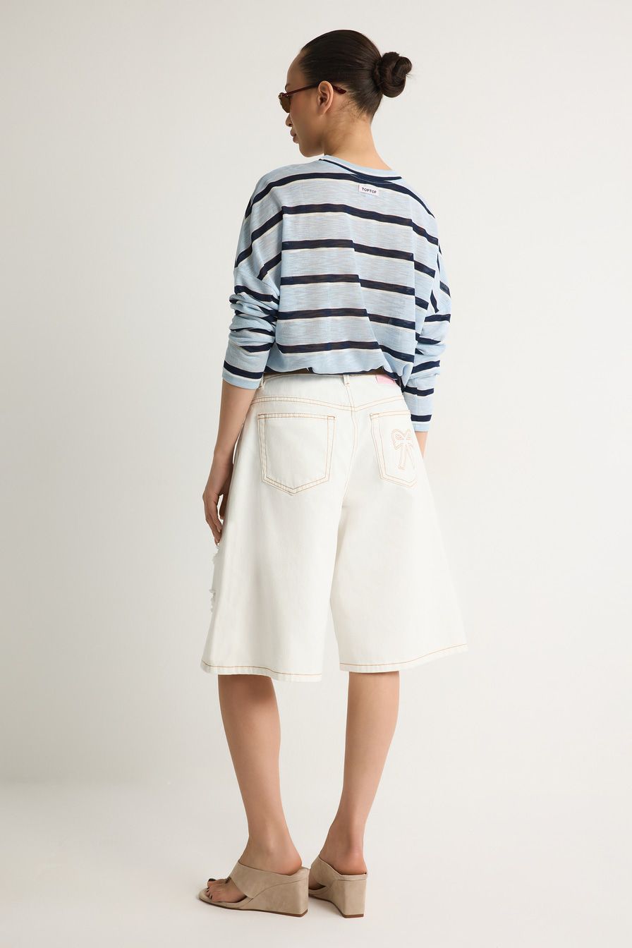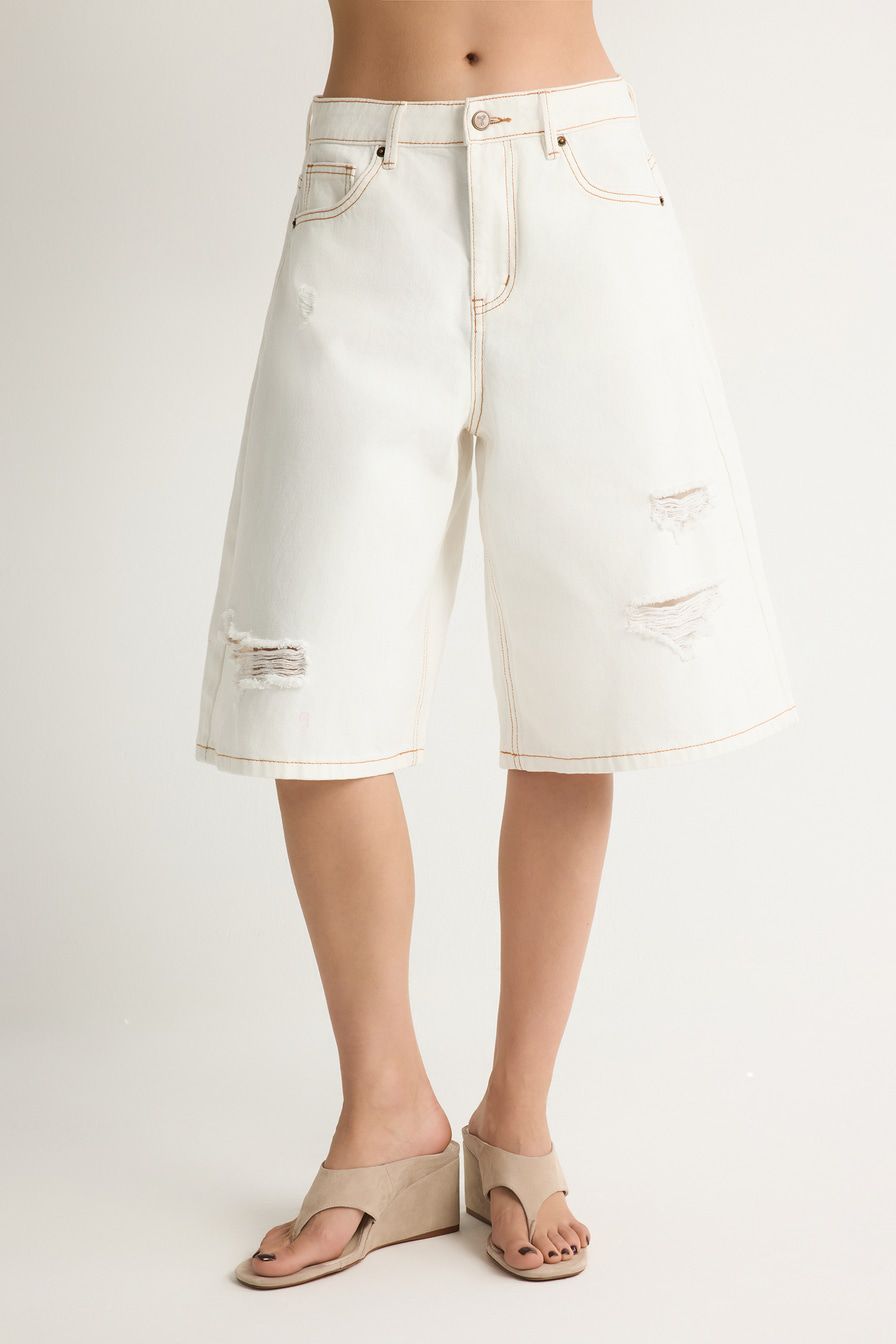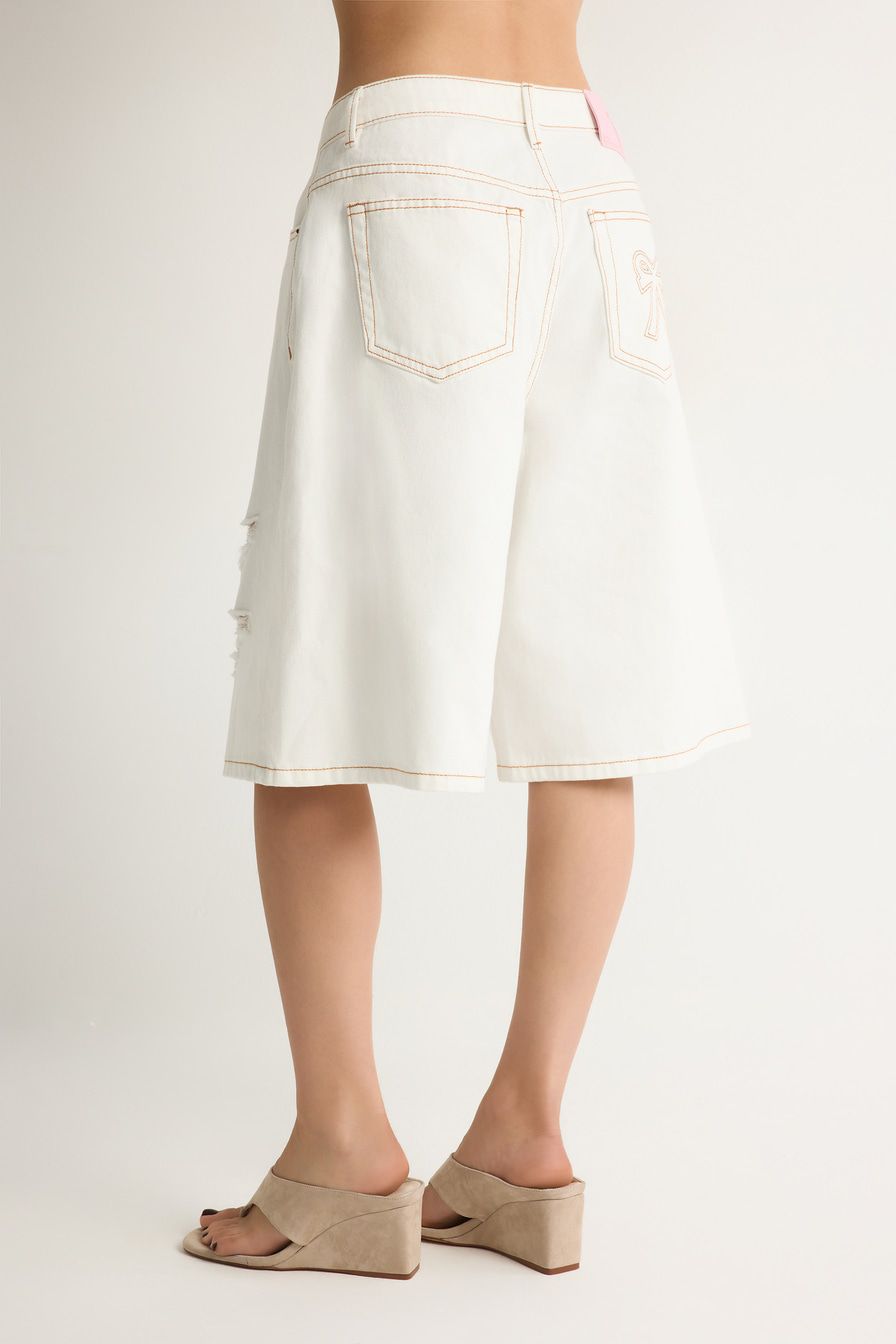 Белые джинсовые шорты из 100% хлопка – модель свободного кроя. Шорты декорированы разрезами.