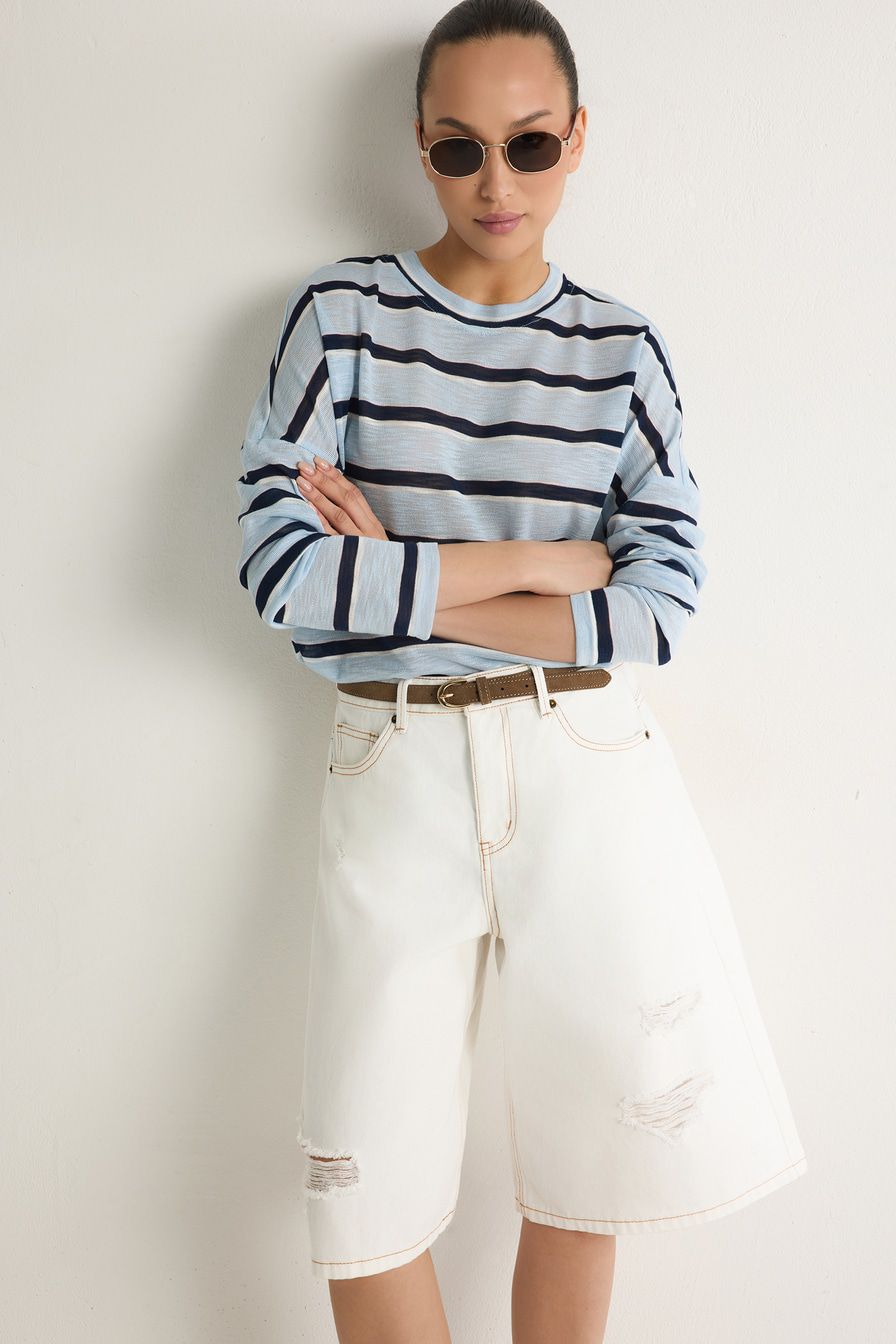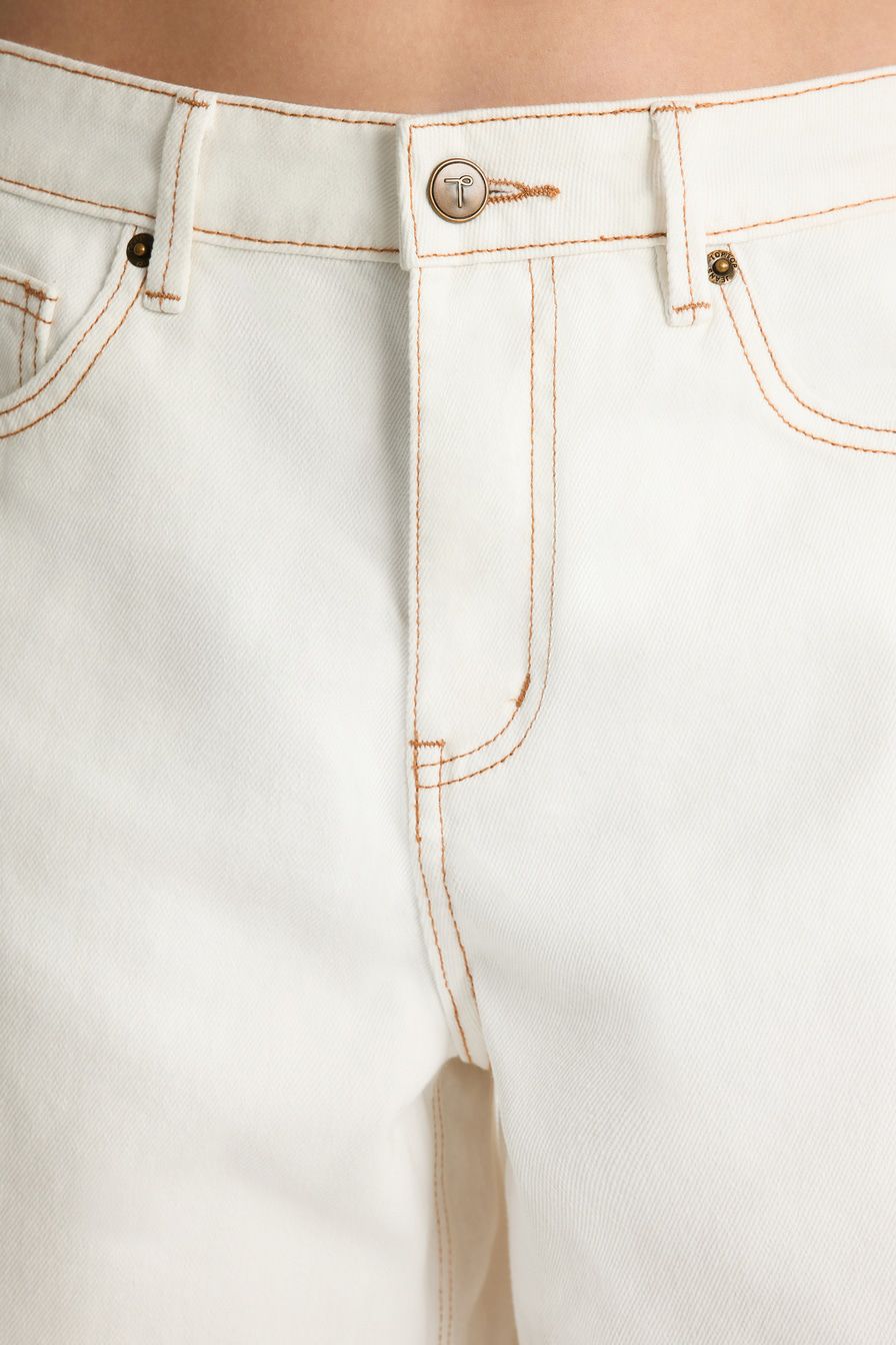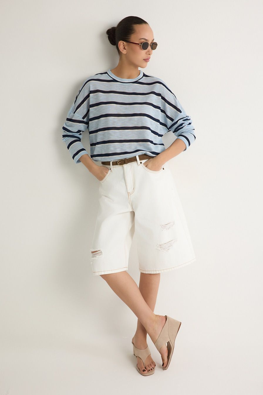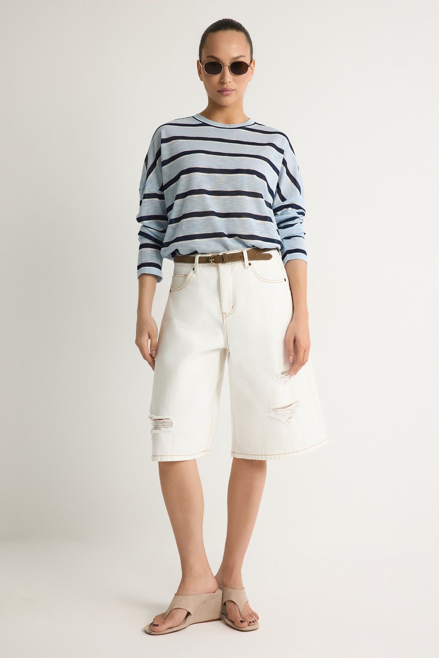 Белые джинсовые шорты из 100% хлопка – модель свободного кроя. Шорты декорированы разрезами.