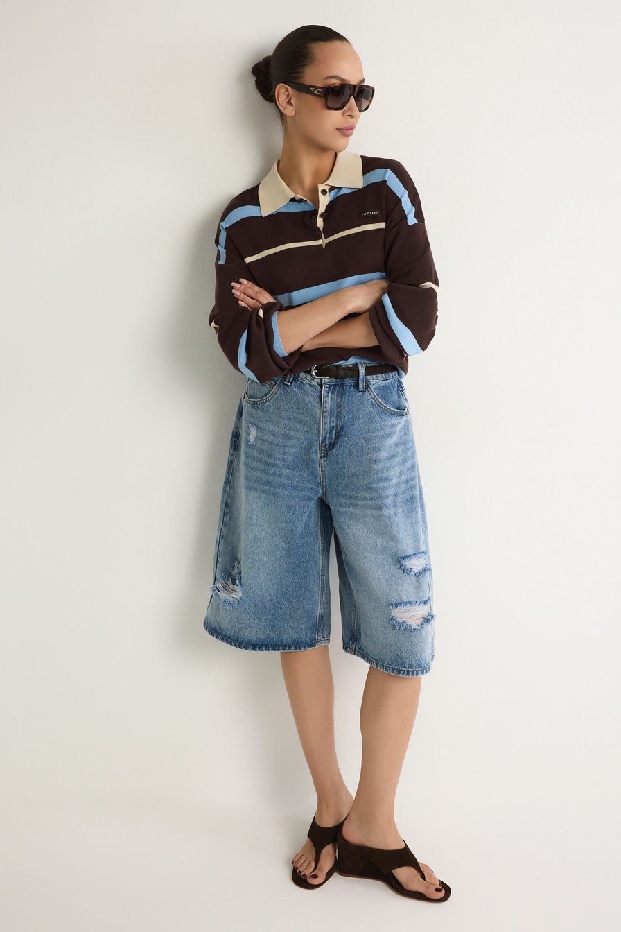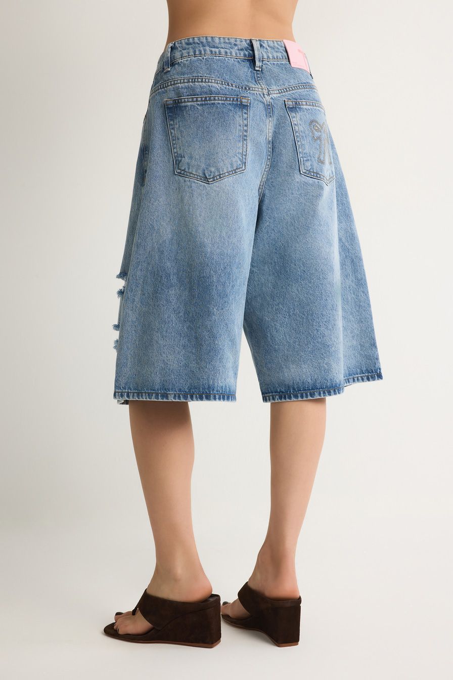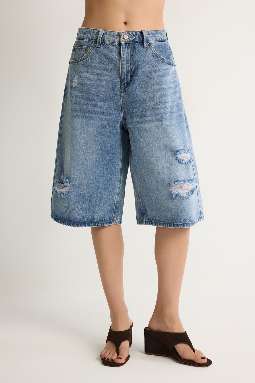Синие джинсовые шорты из 100% хлопка – модель свободного кроя. Шорты декорированы потертостями и разрезами.