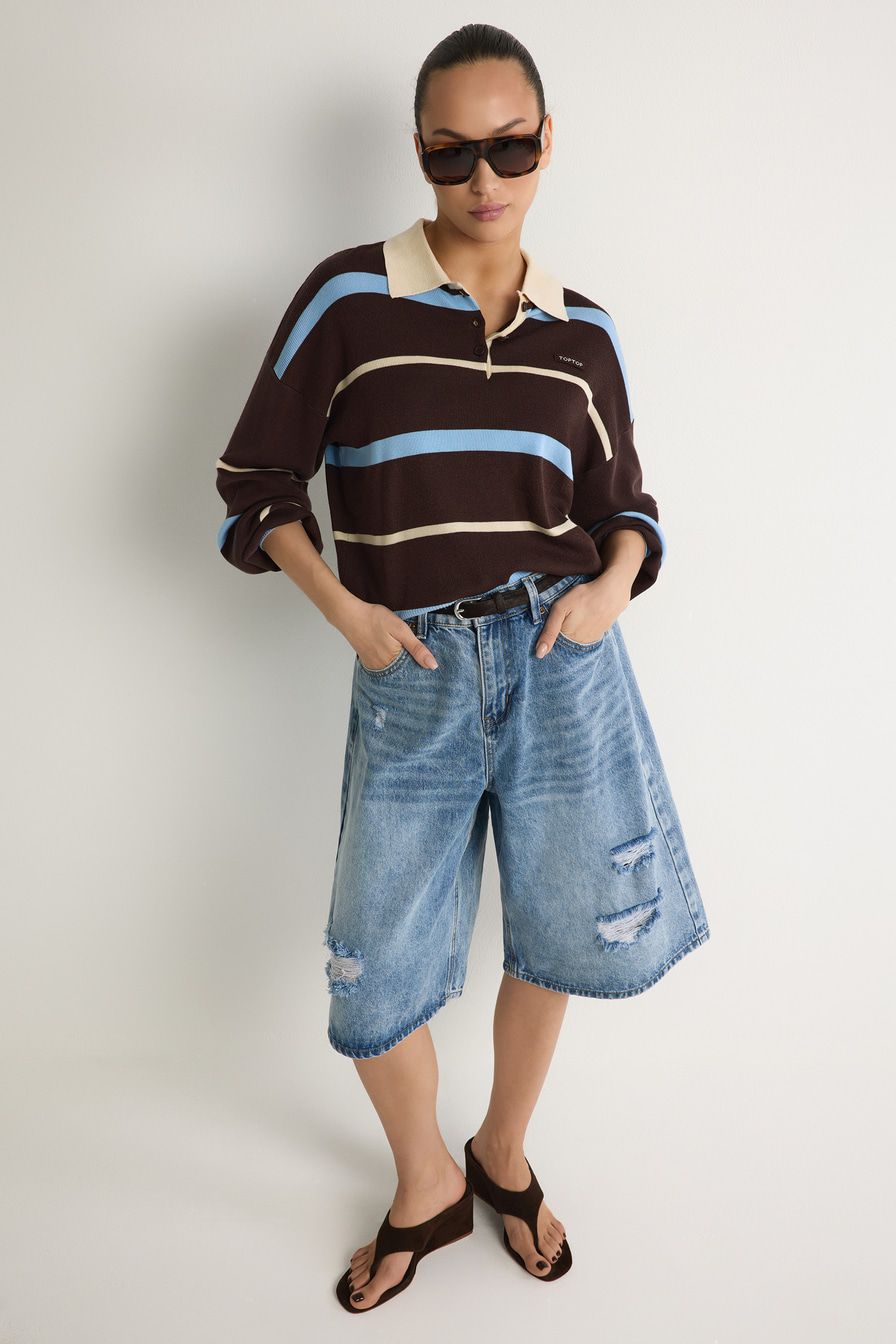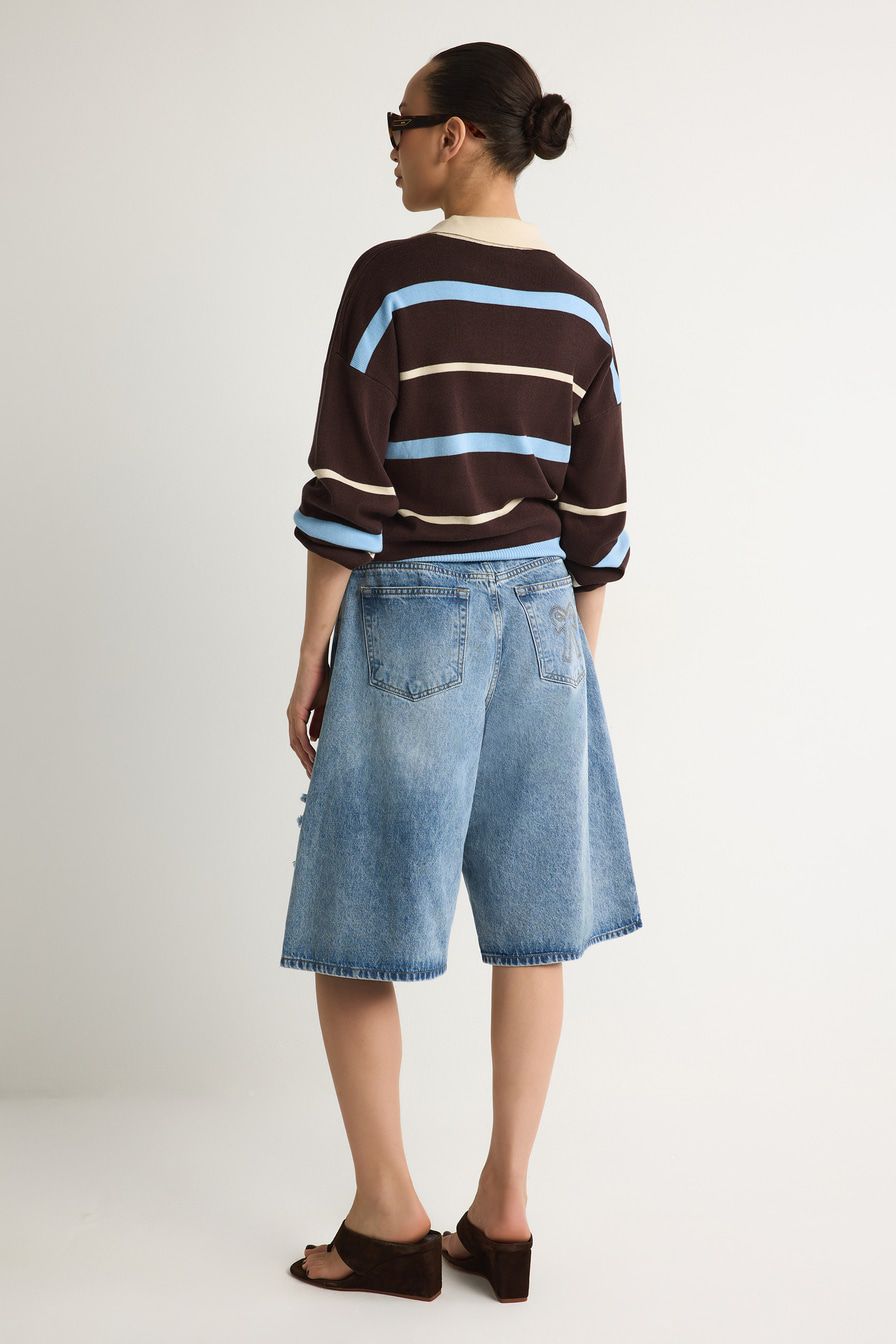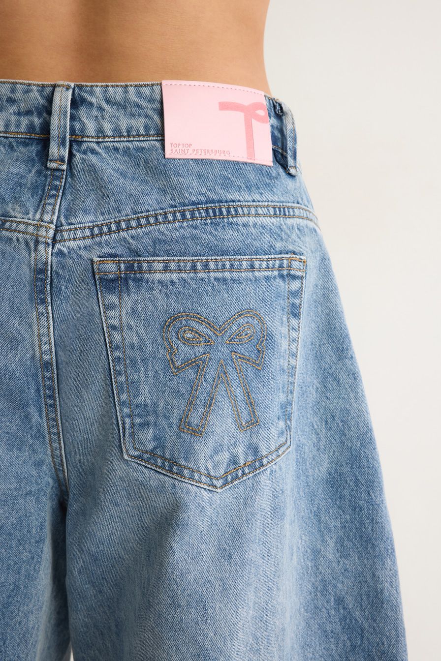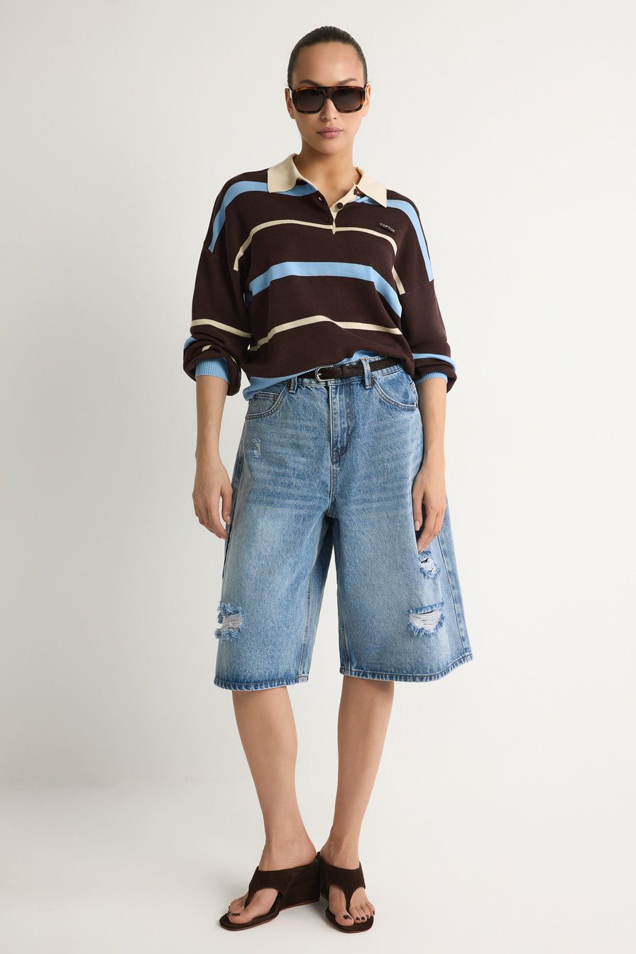 Синие джинсовые шорты из 100% хлопка – модель свободного кроя. Шорты декорированы потертостями и разрезами.