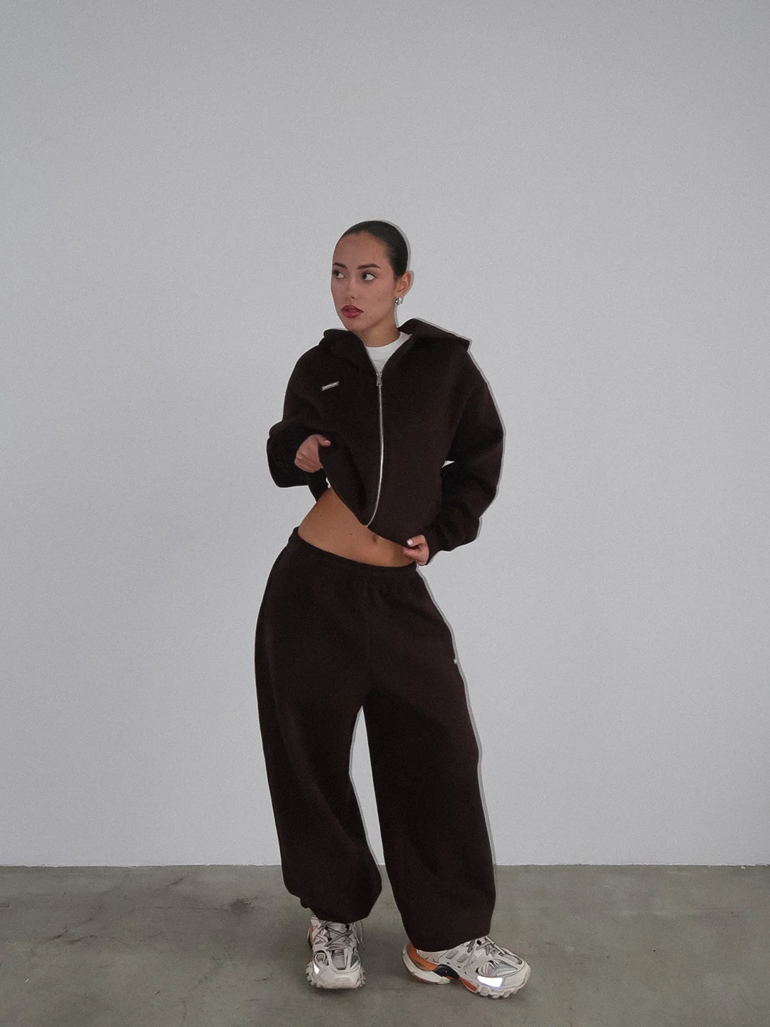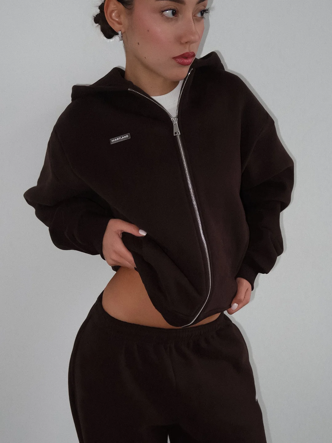 Зип худи средней длины выполнен из плотного хлопкового материала с эффектом велюра