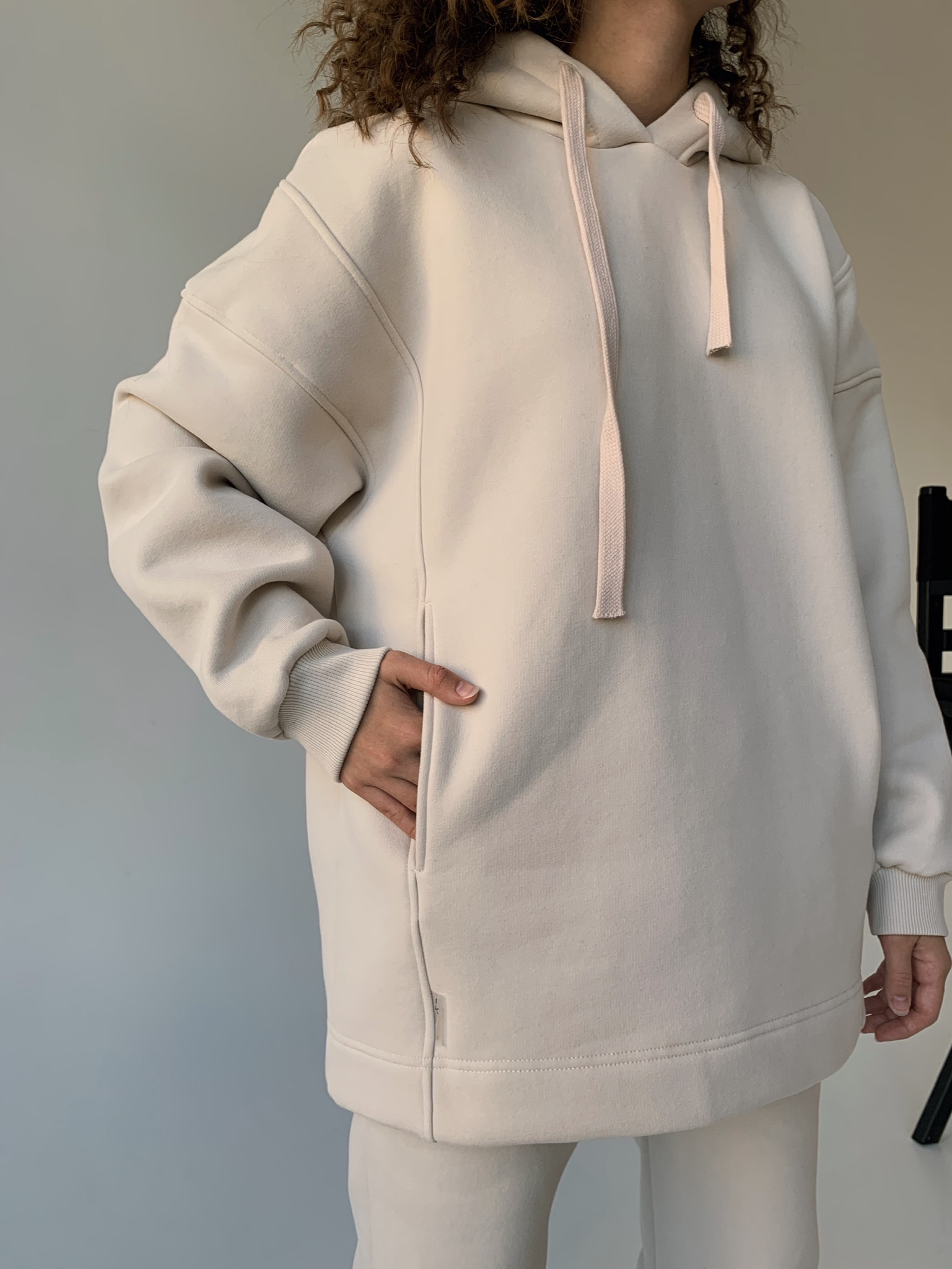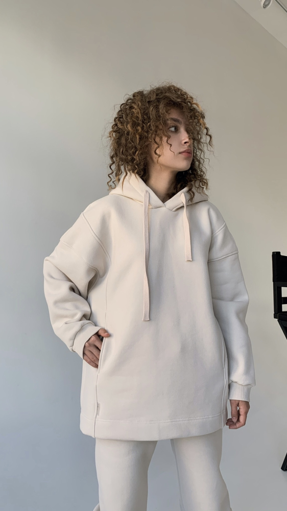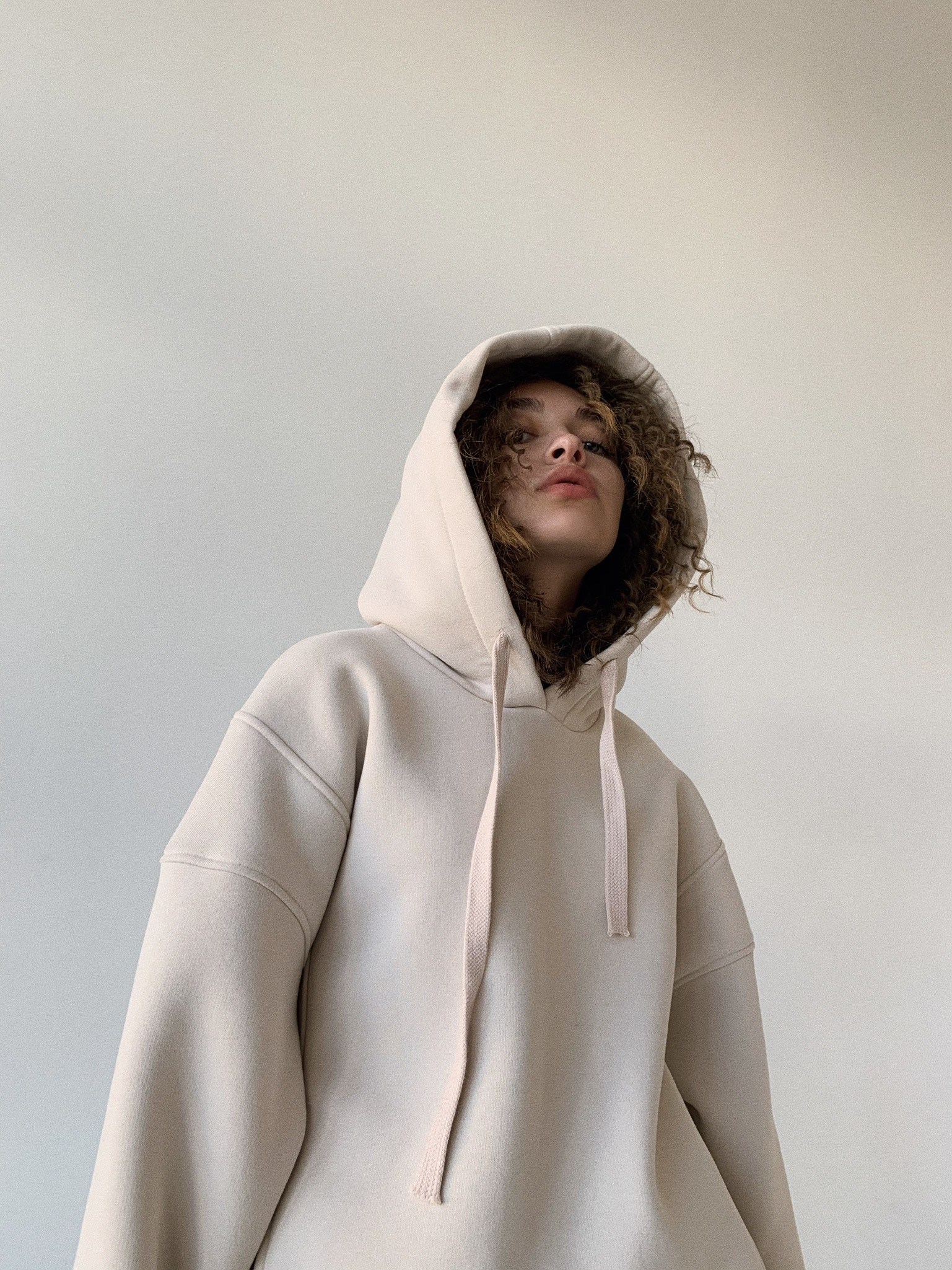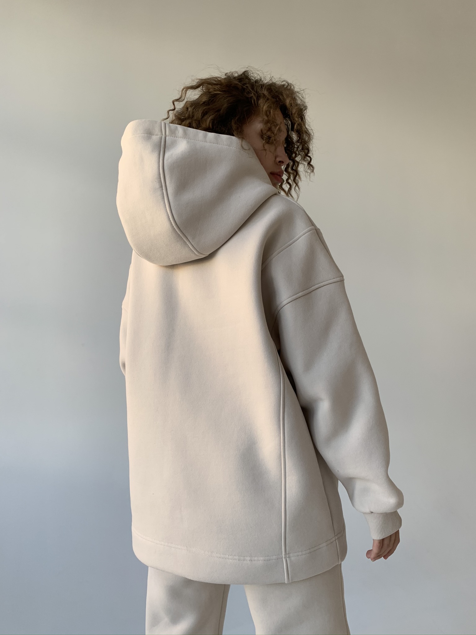 Утеплённое худи в бежевом цвете — идеальный выбор для повседневного образа. Комфортный и практичный вариант одежды, который согреет вас в прохладную погоду.