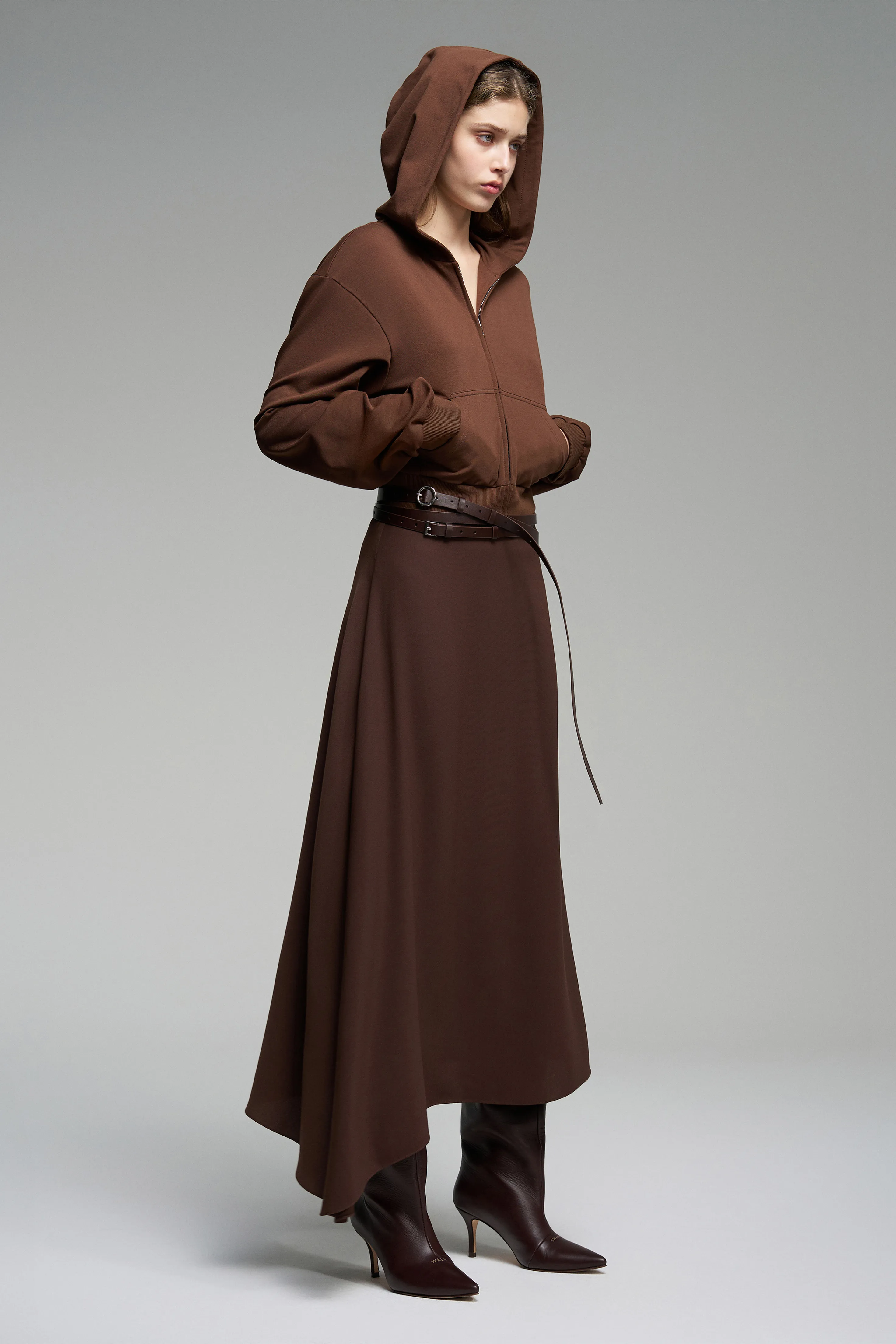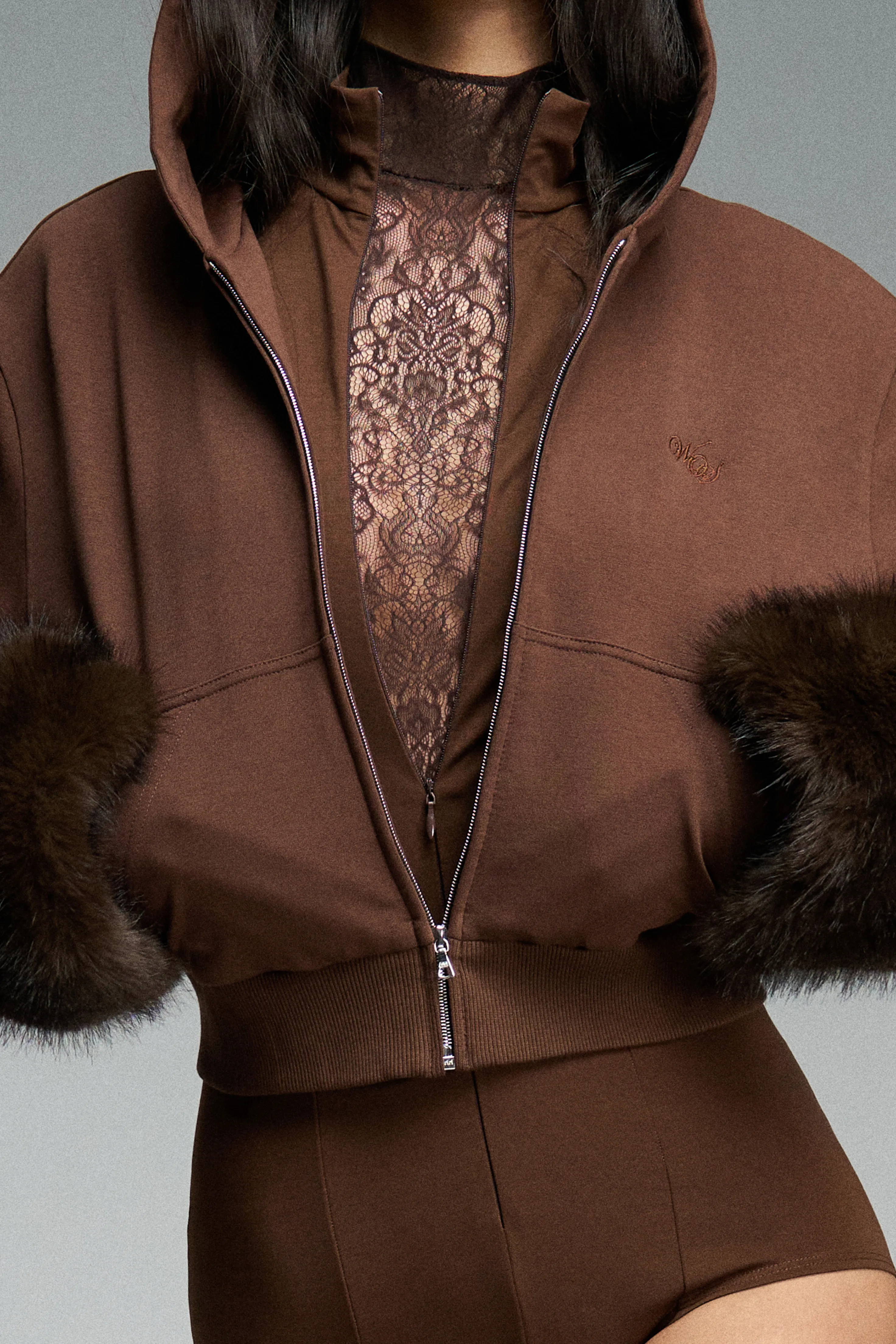 Укороченное худи из хлопкового эластичного материала. Модель с капюшоном, боковыми карманами и застёжкой на молнию. Изделие дополнено вышивкой бренда.