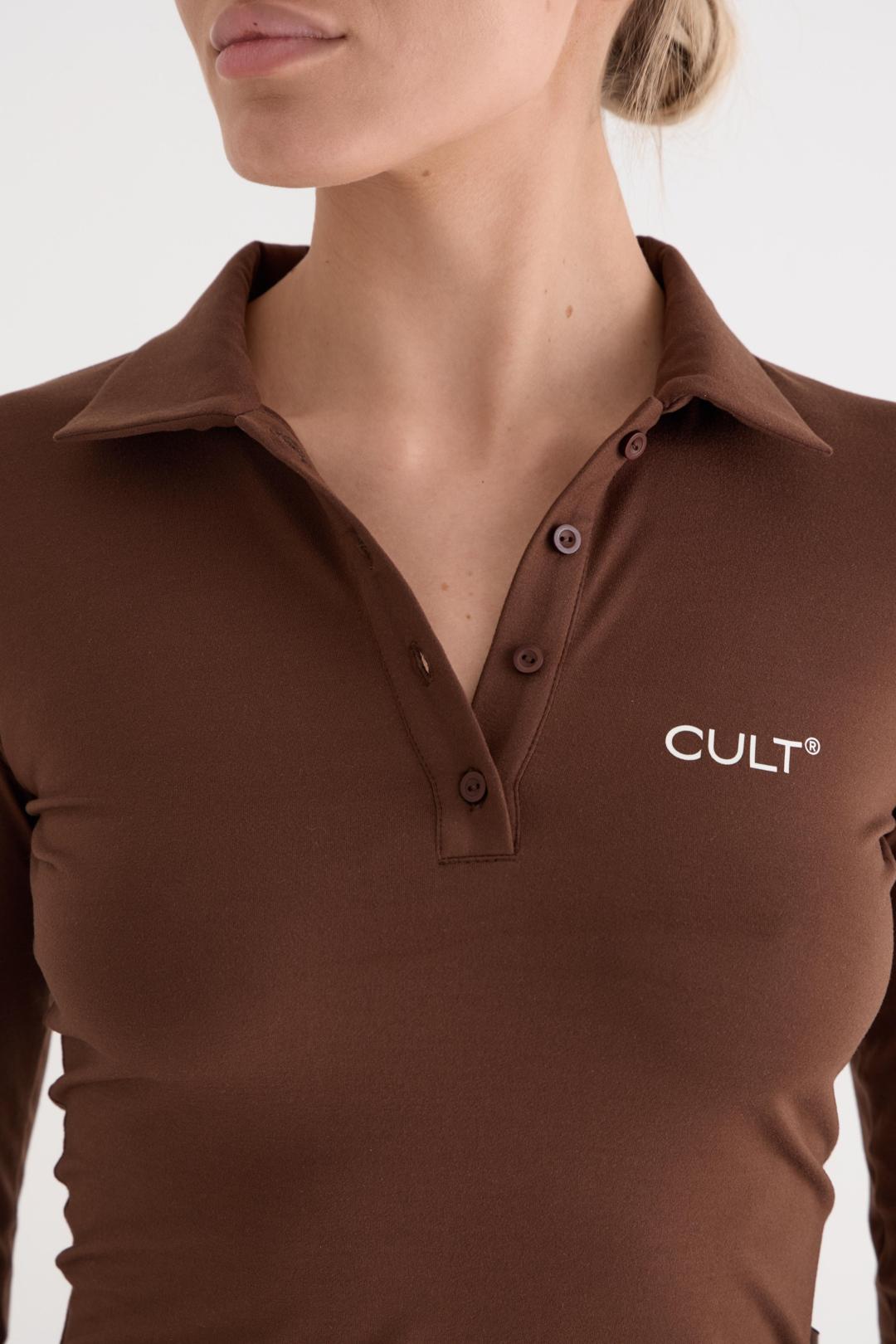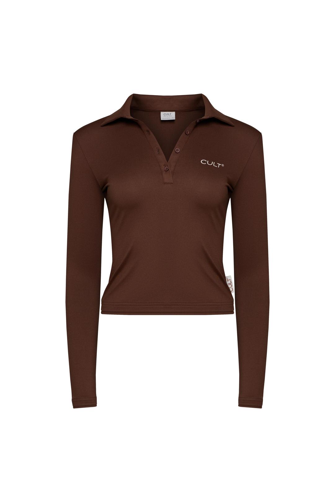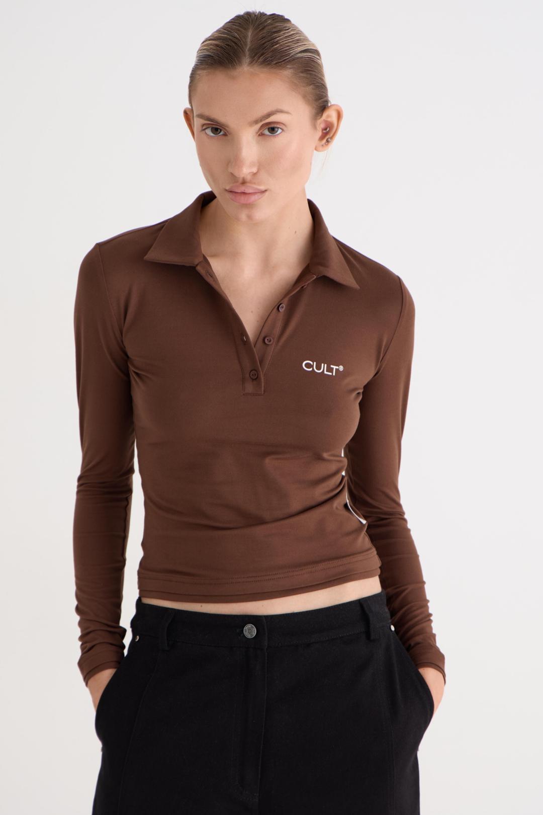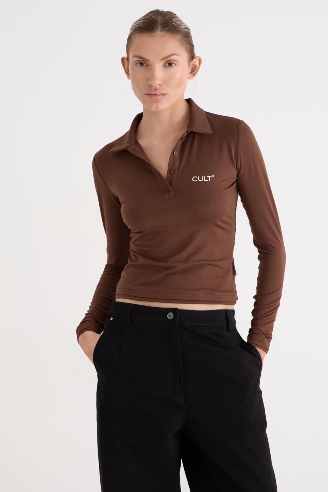 Поло прилегающего силуэта с длинным рукавом из вискозного трикотажа и отложным воротником. В левом боковом шве брендированный флажок, планка на пуговицах. Спереди по слева принт-лого.
