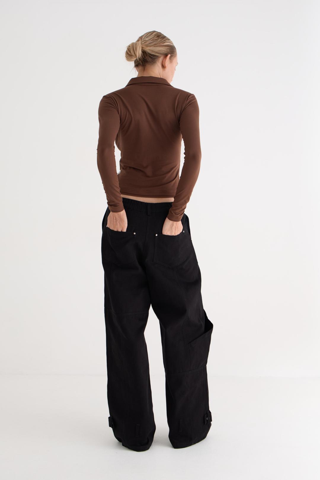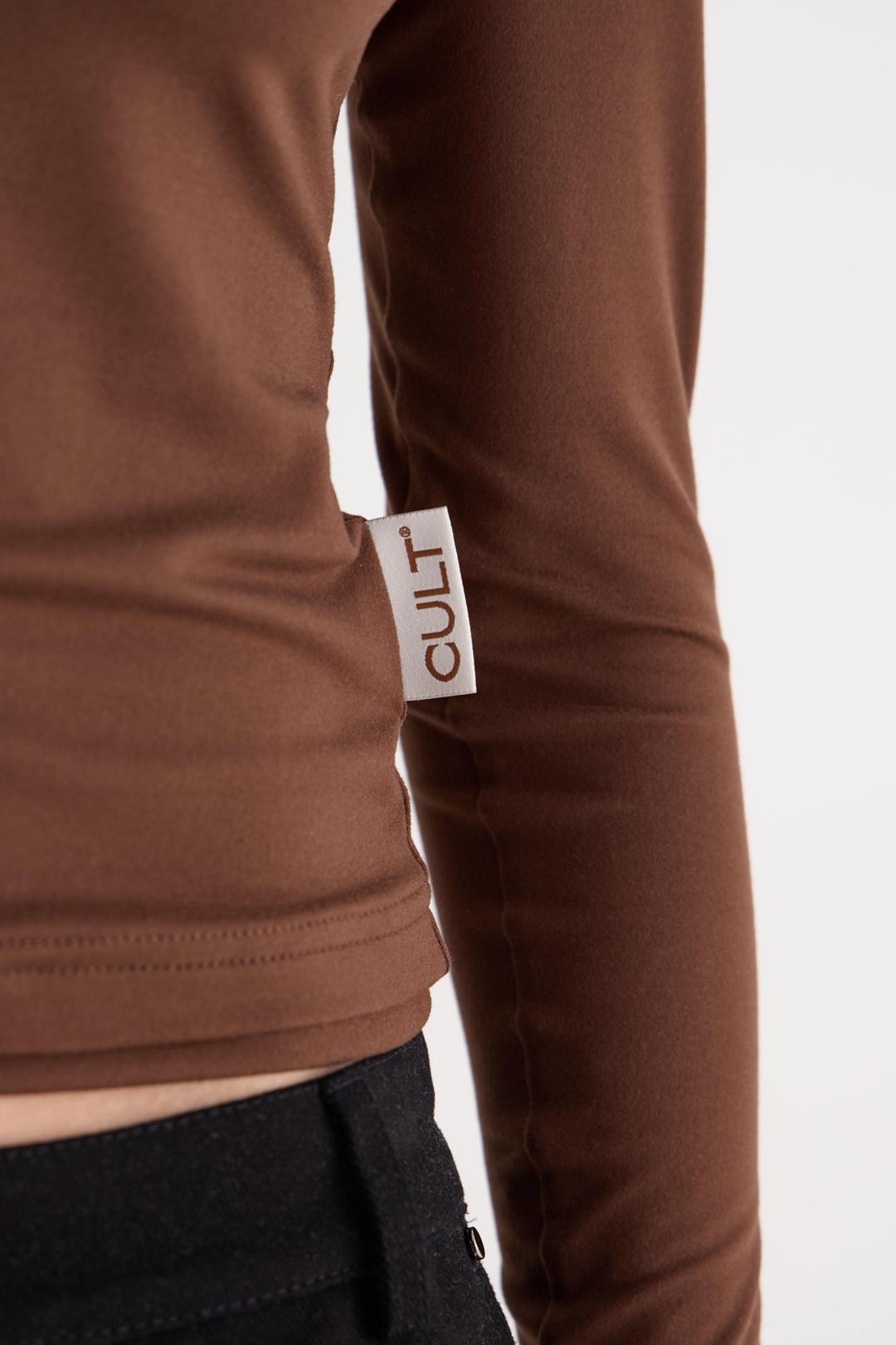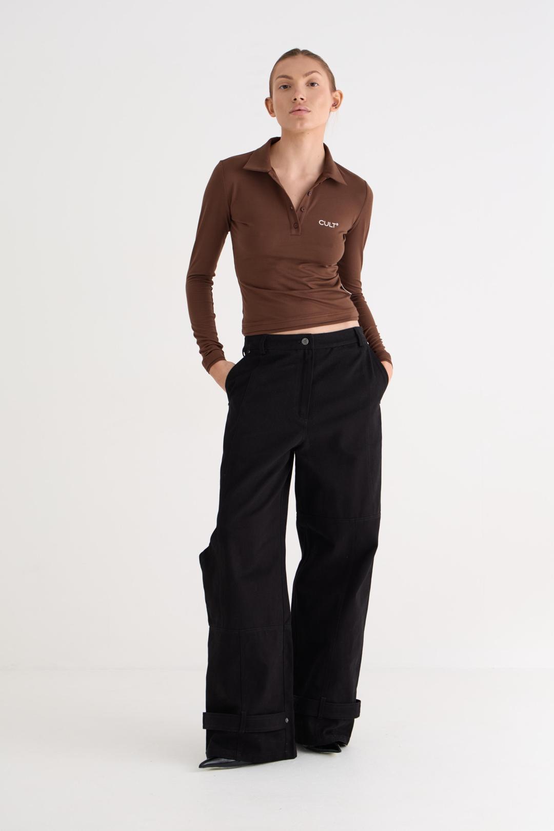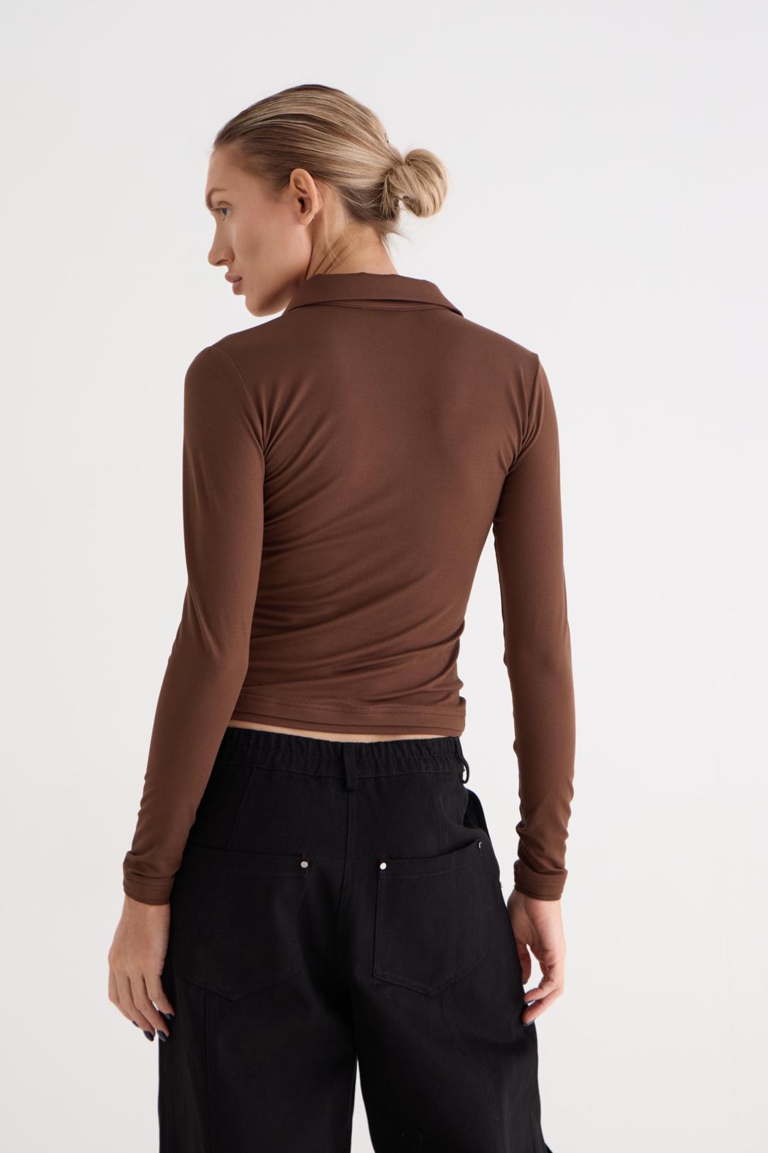 Поло прилегающего силуэта с длинным рукавом из вискозного трикотажа и отложным воротником. В левом боковом шве брендированный флажок, планка на пуговицах. Спереди по слева принт-лого.