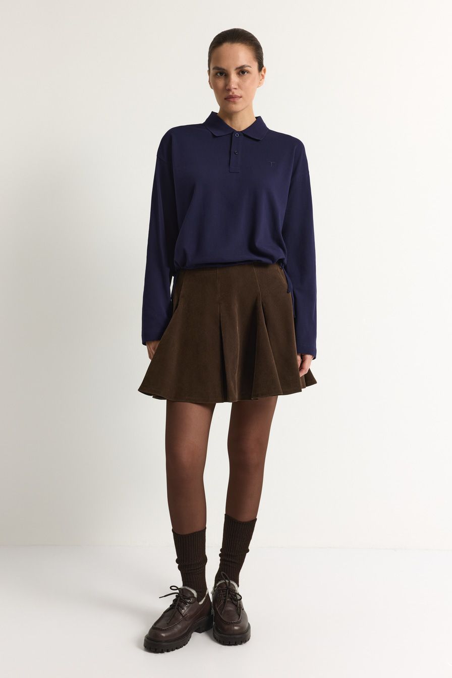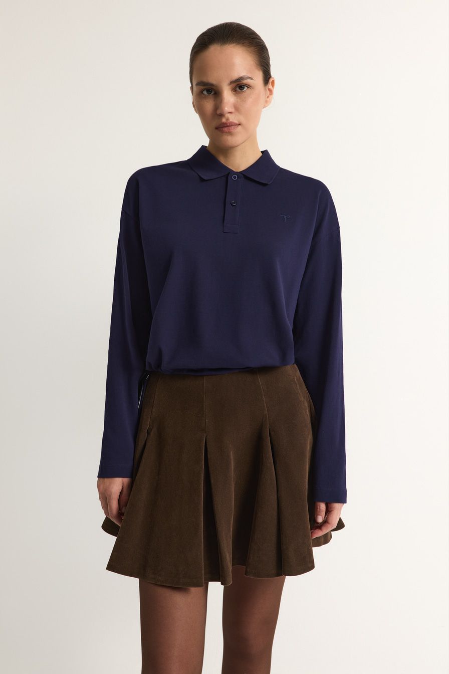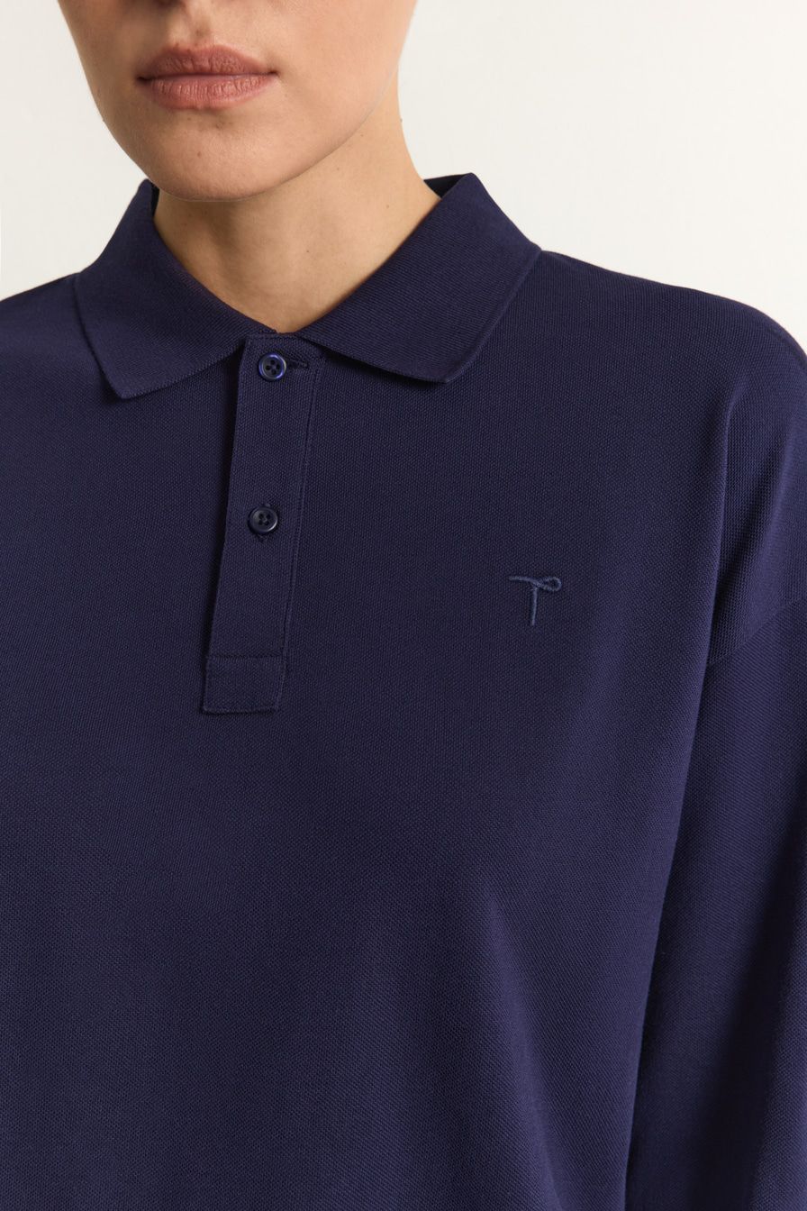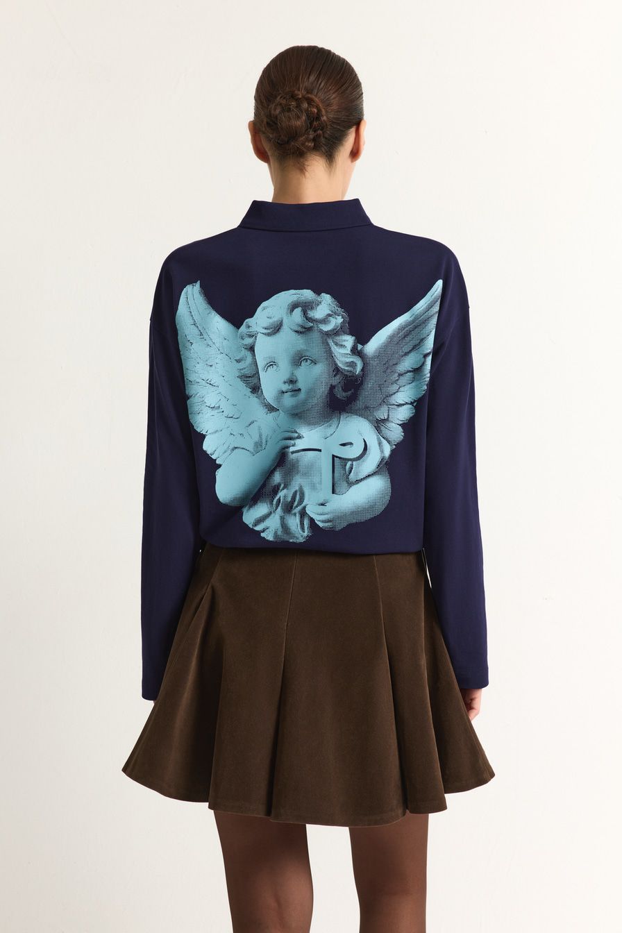 Темно-синий джемпер из 100% хлопка – модель свободного кроя со спущенной линией плеч. Джемпер дополнен воротником-поло и кулиской снизу, декорирован принтом на спине.