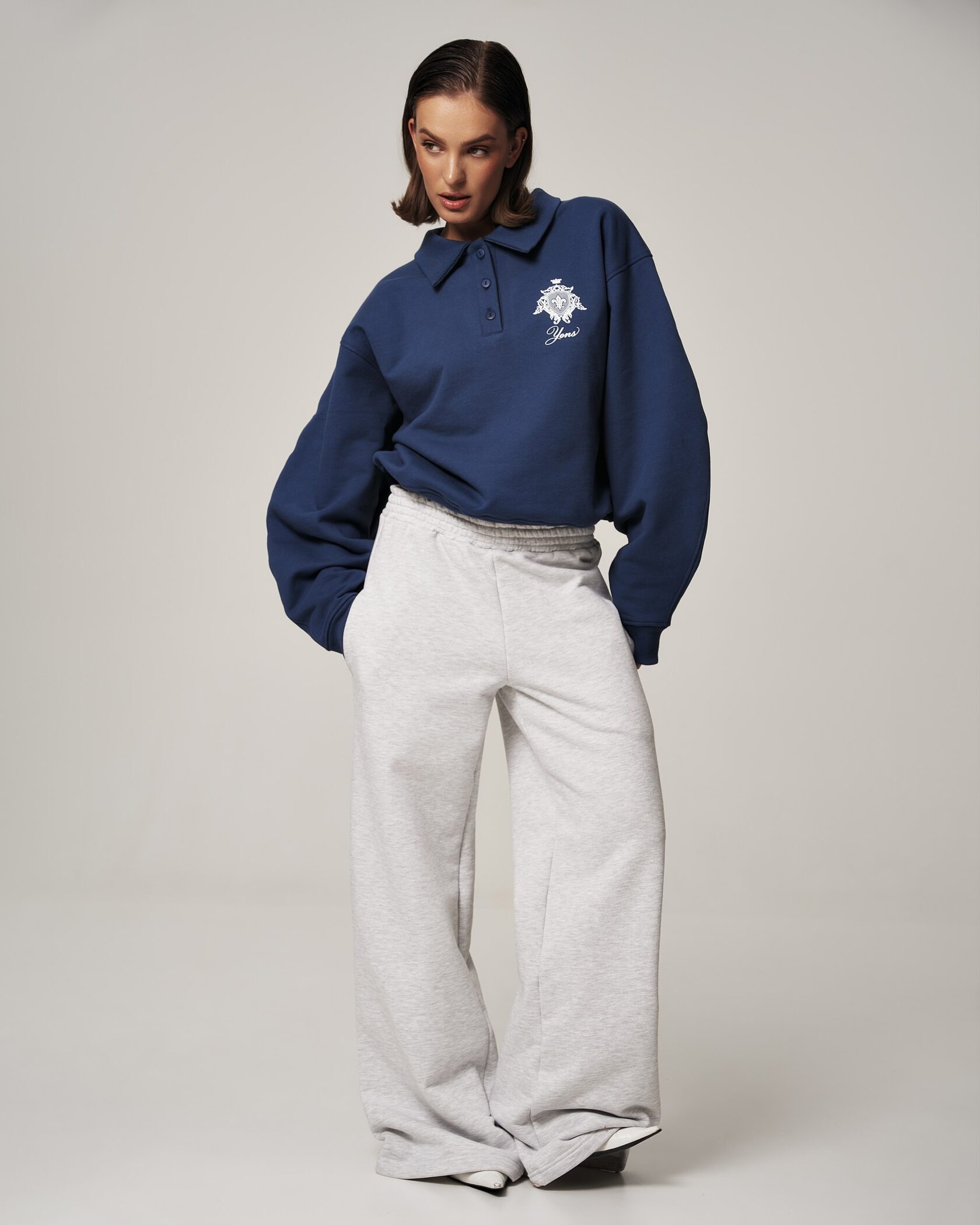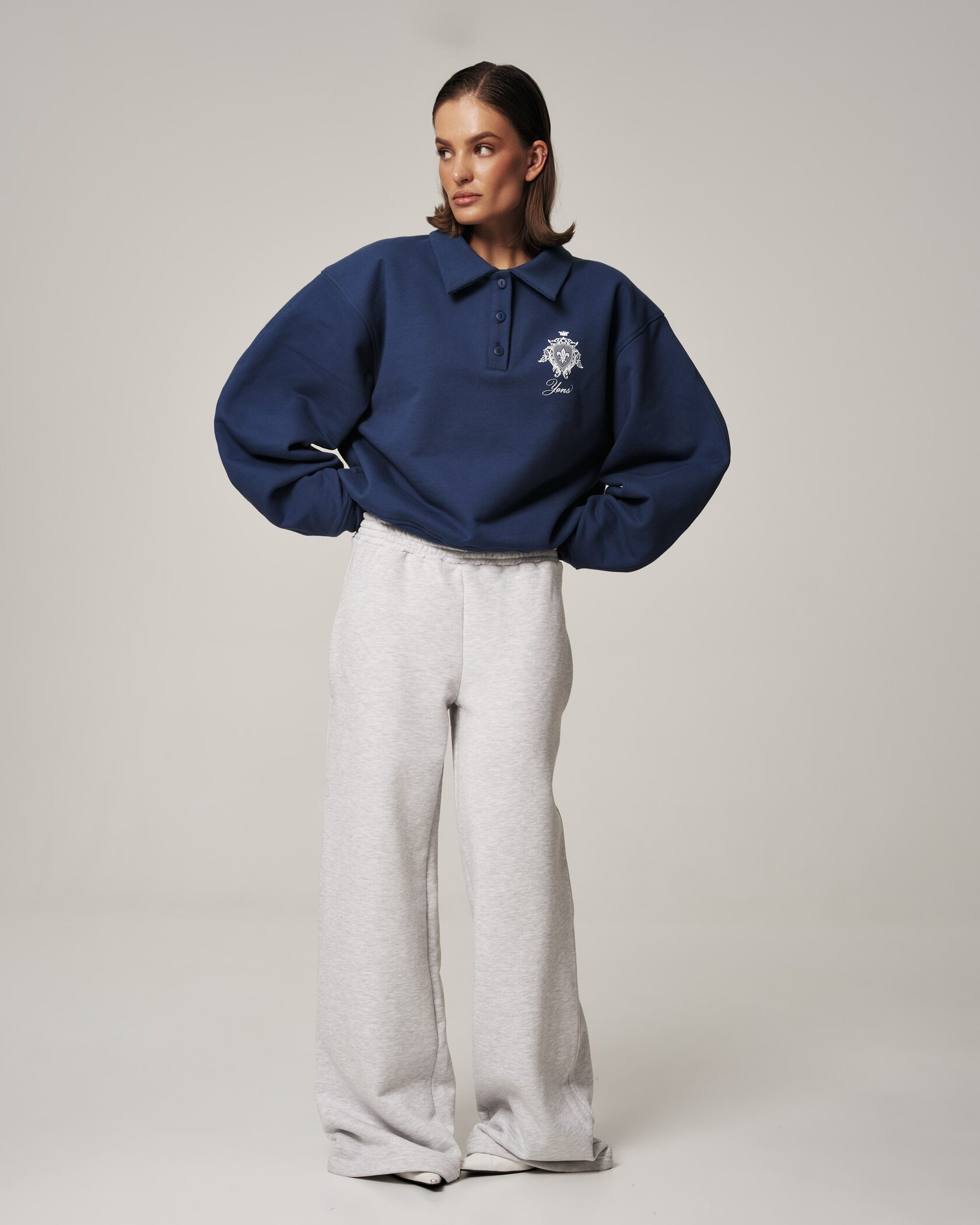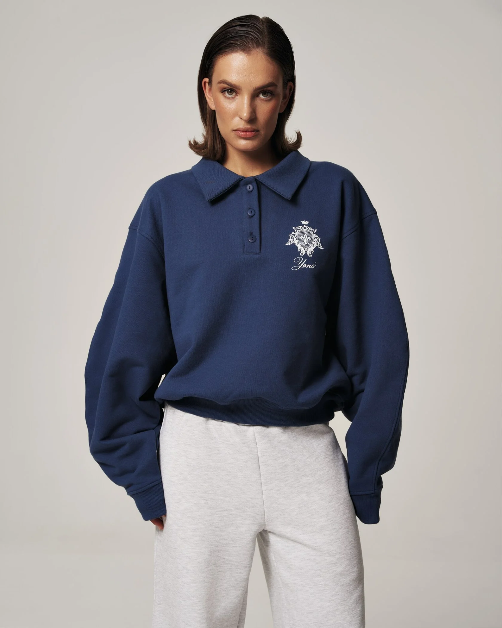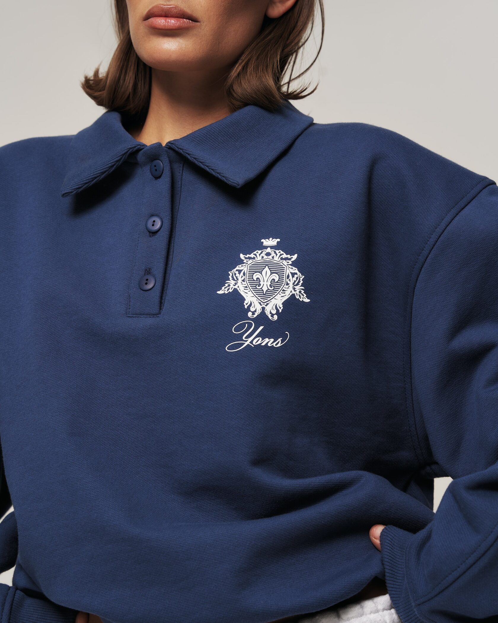 Свитшот‑поло YONS STUDIOS — сдержанный минимализм и комфорт в одном изделии. Насыщенный индиго‑синий оттенок, аккуратный воротник и три пуговицы создают современный polo‑силуэт в мягком, уютном исполнении