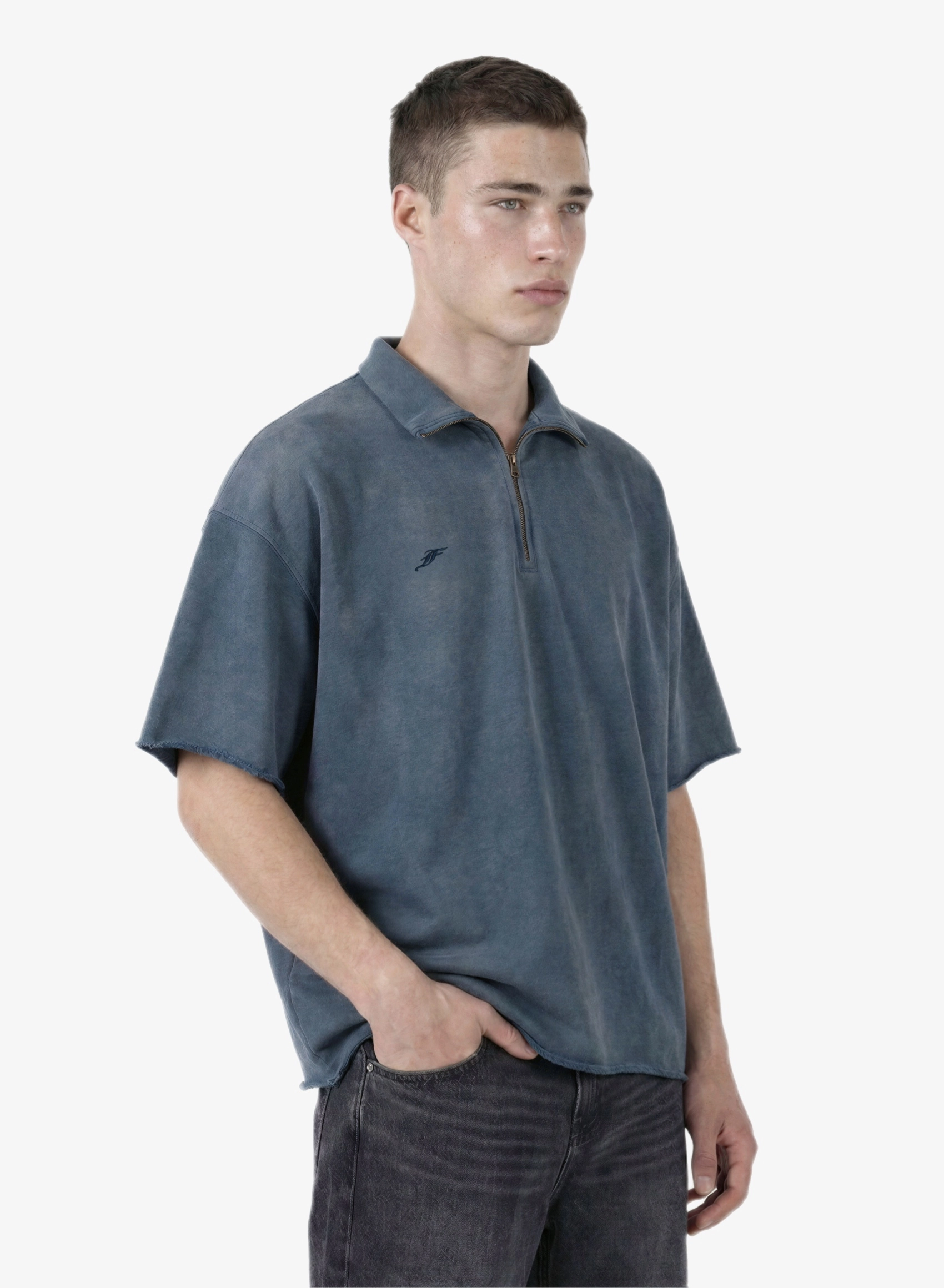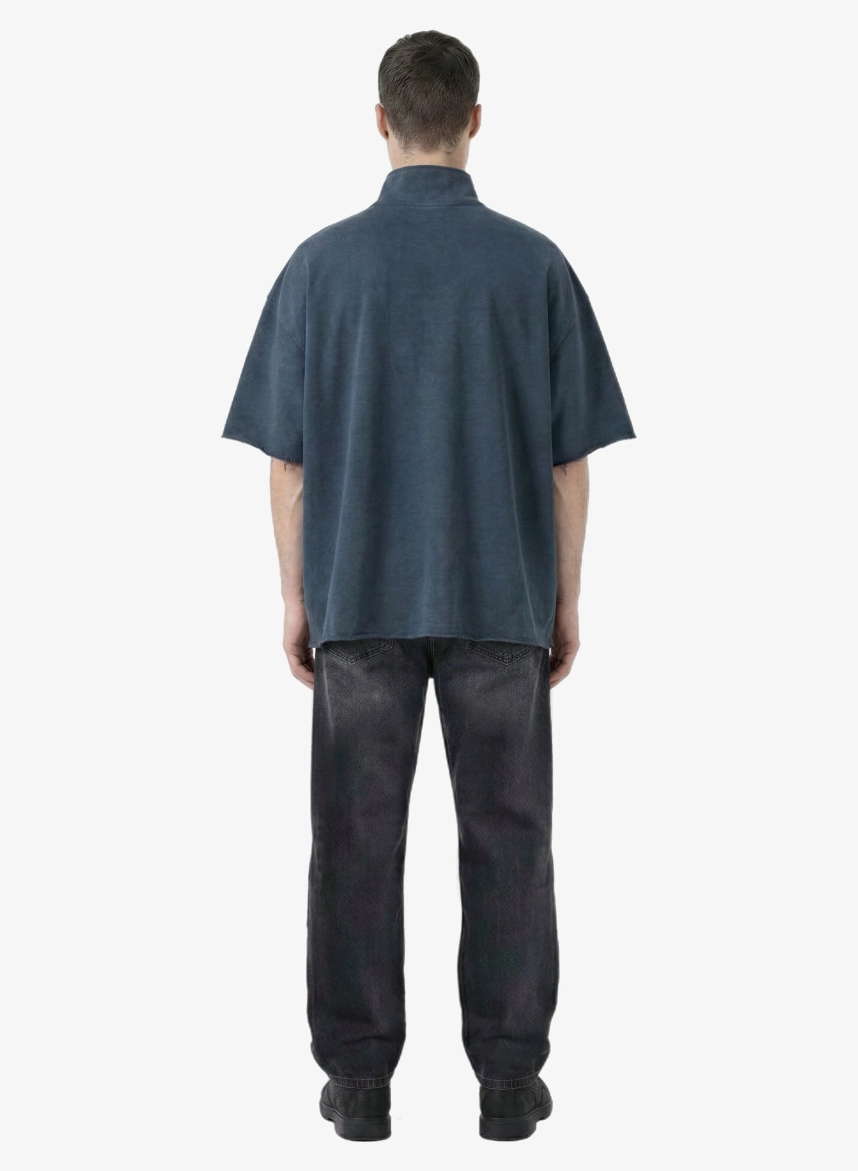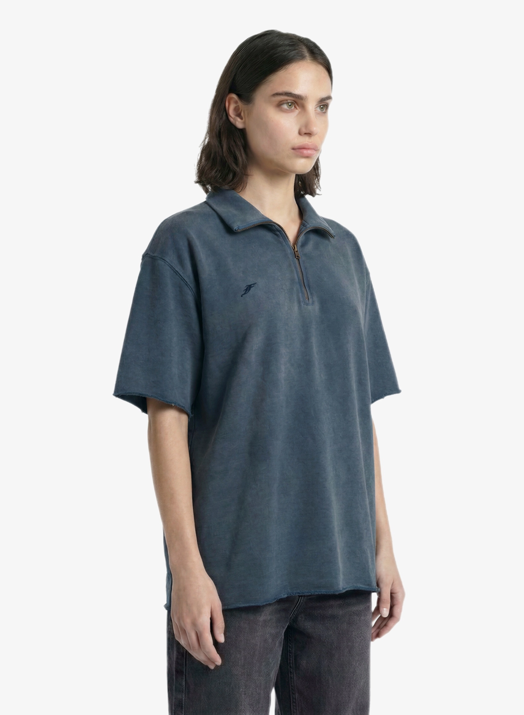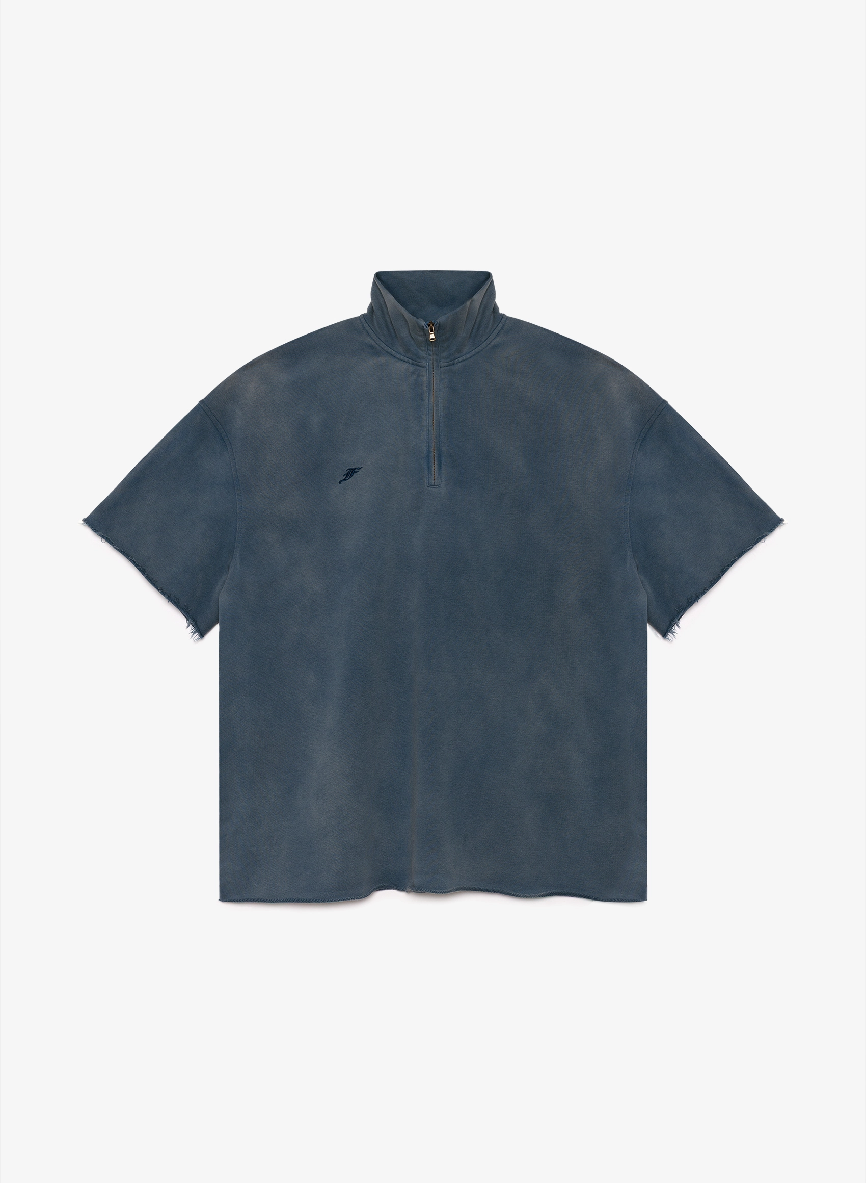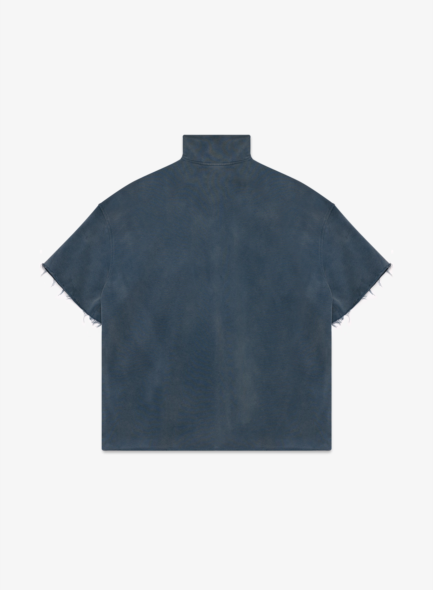 Объемная футболка с высоким воротником на молнии и выраженным винтажным эффектом.