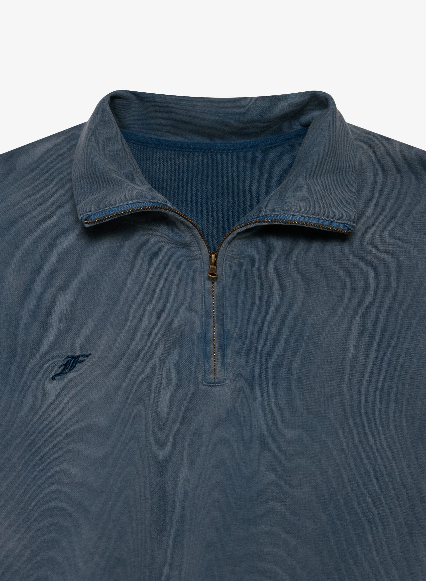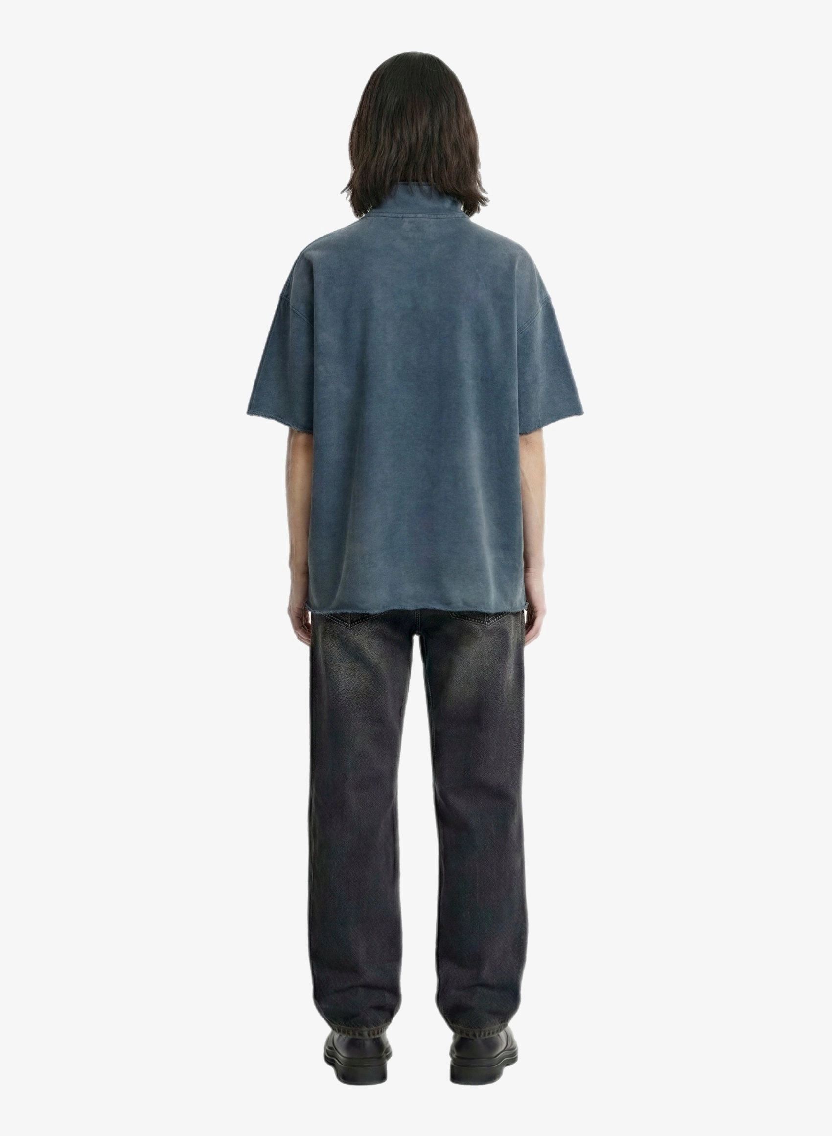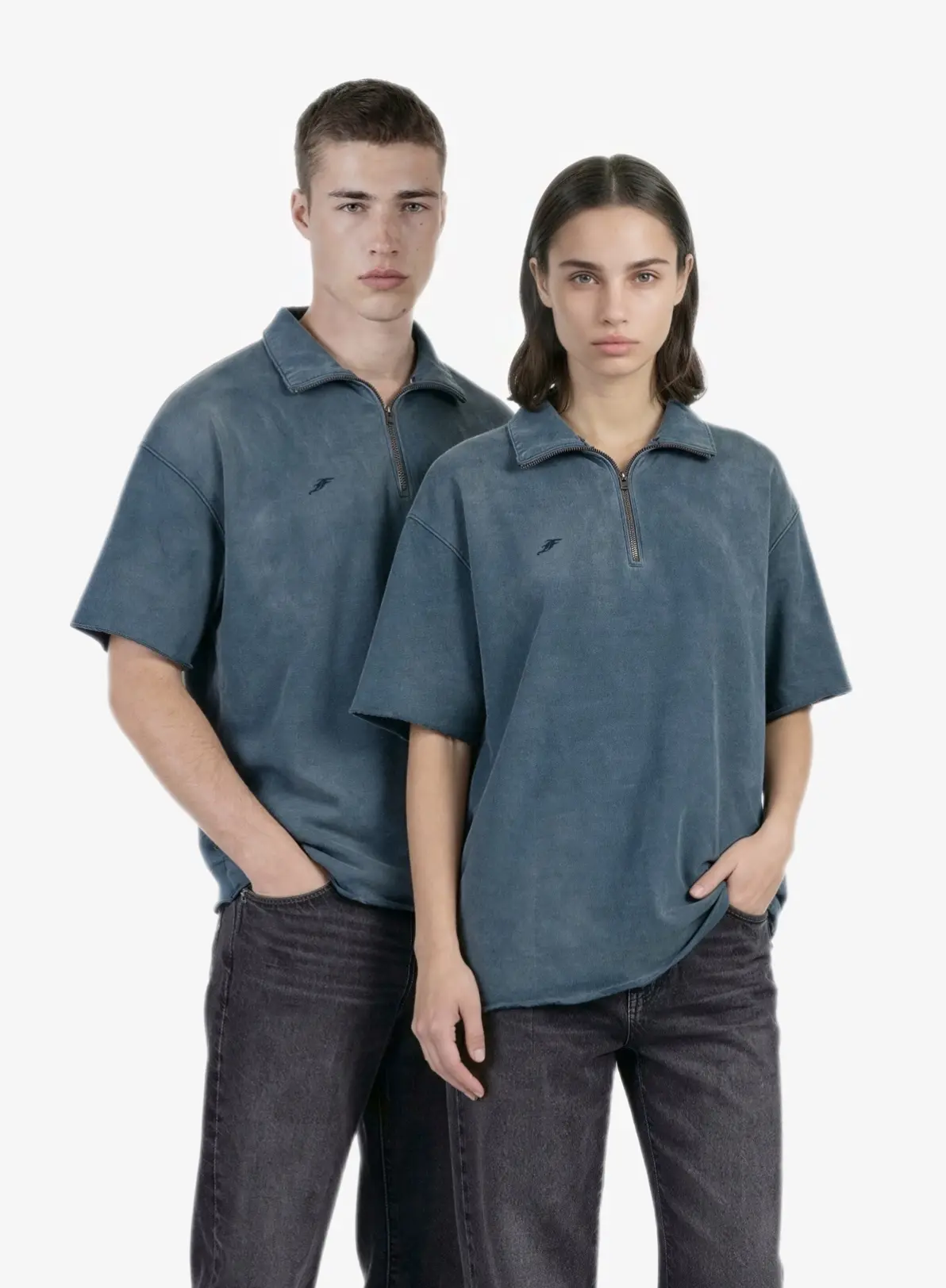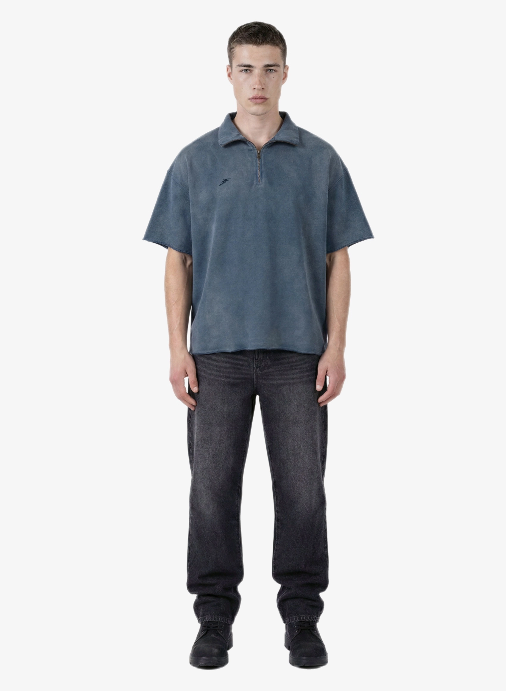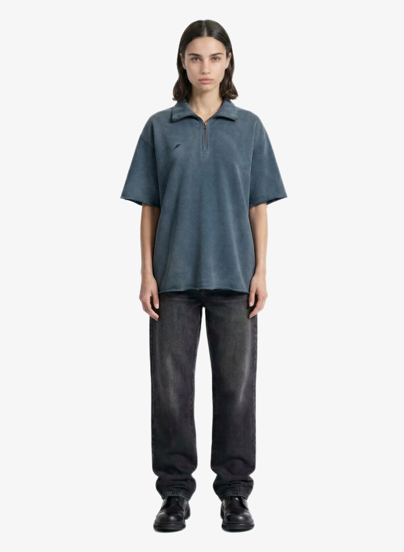 Объемная футболка с высоким воротником на молнии и выраженным винтажным эффектом.