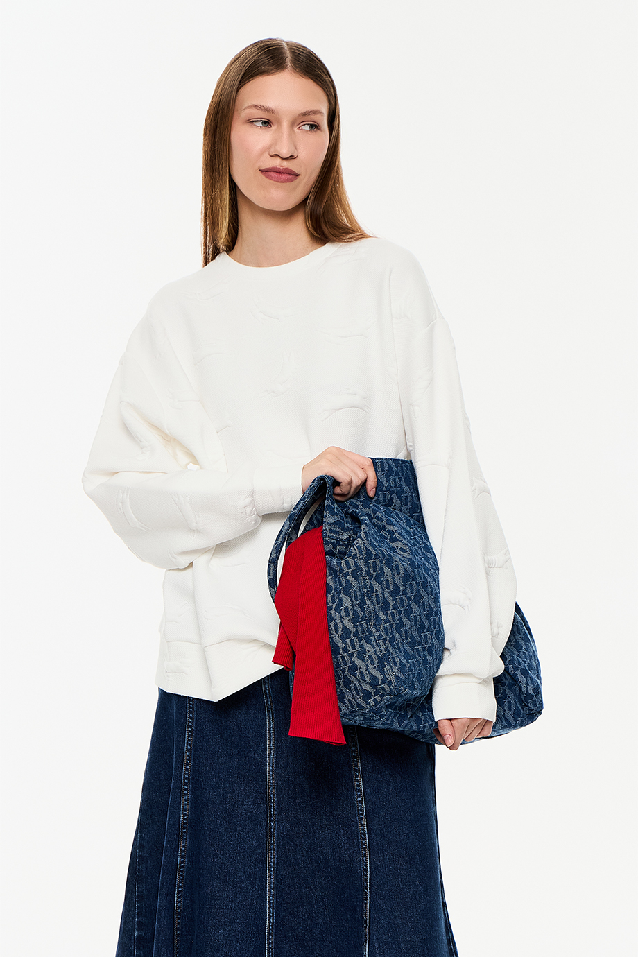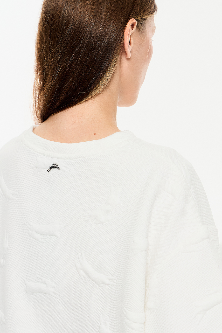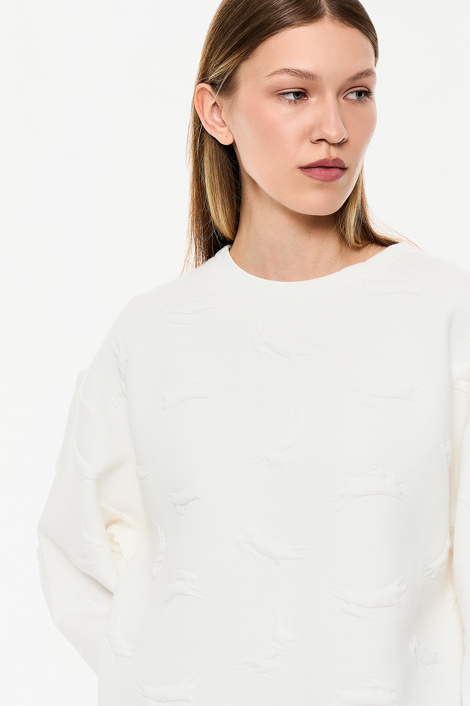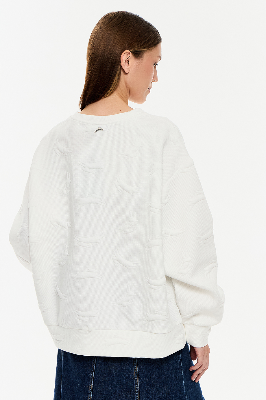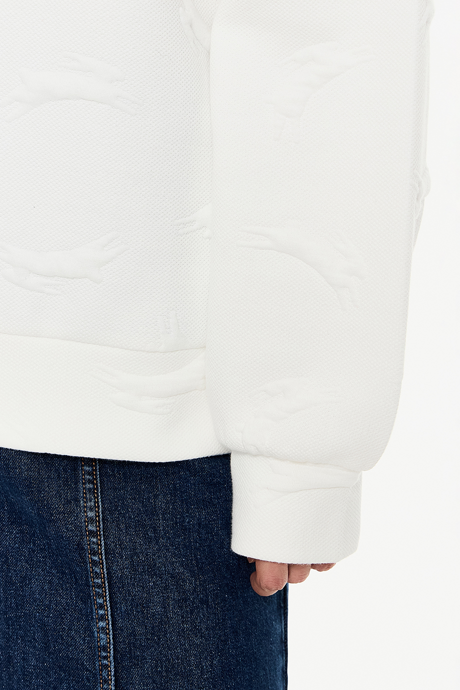 Толстовка белого цвета с объемным фирменным паттерном в тон. Модель прямого силуэта с круглым вырезом дополнена уплотненными манжетами.