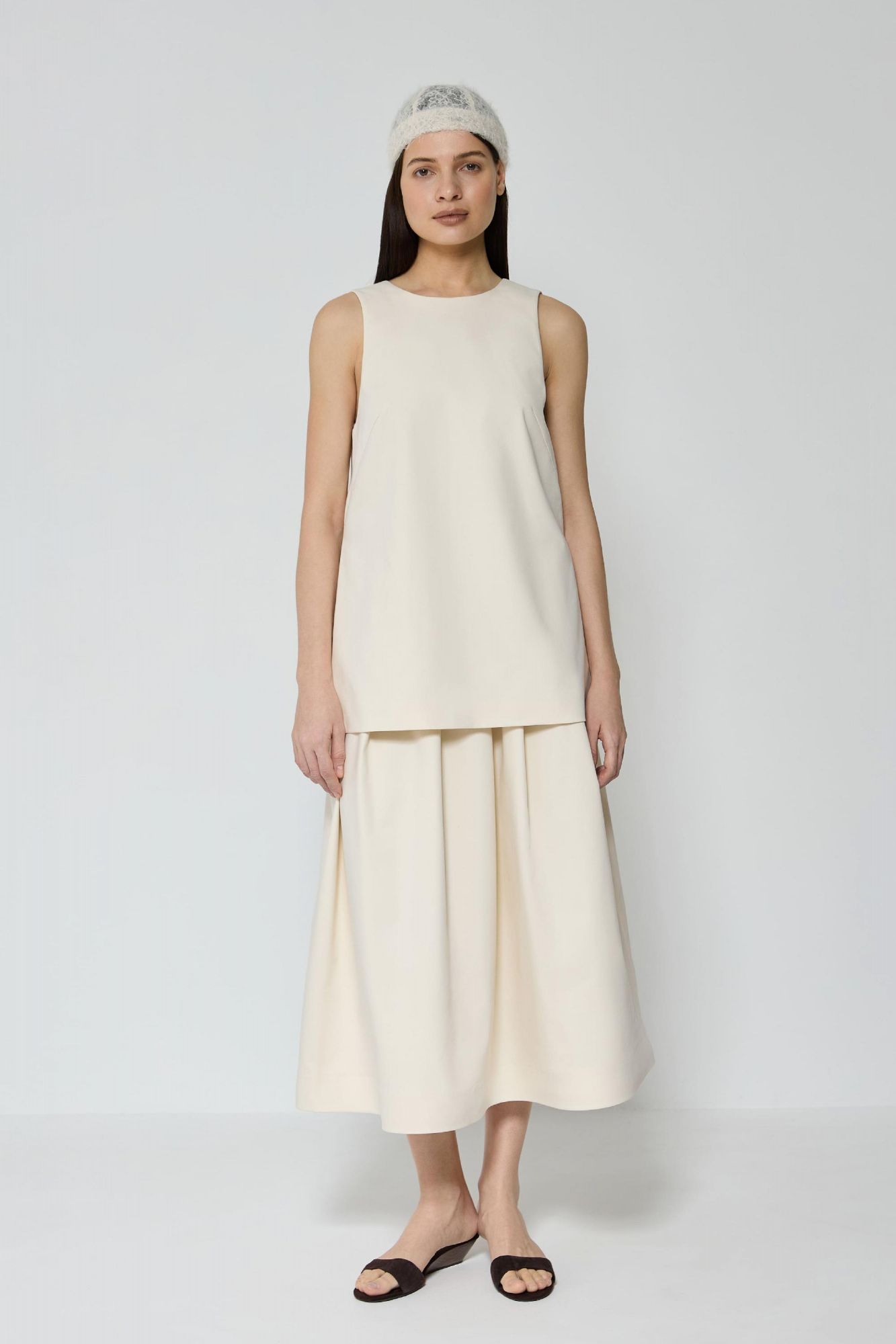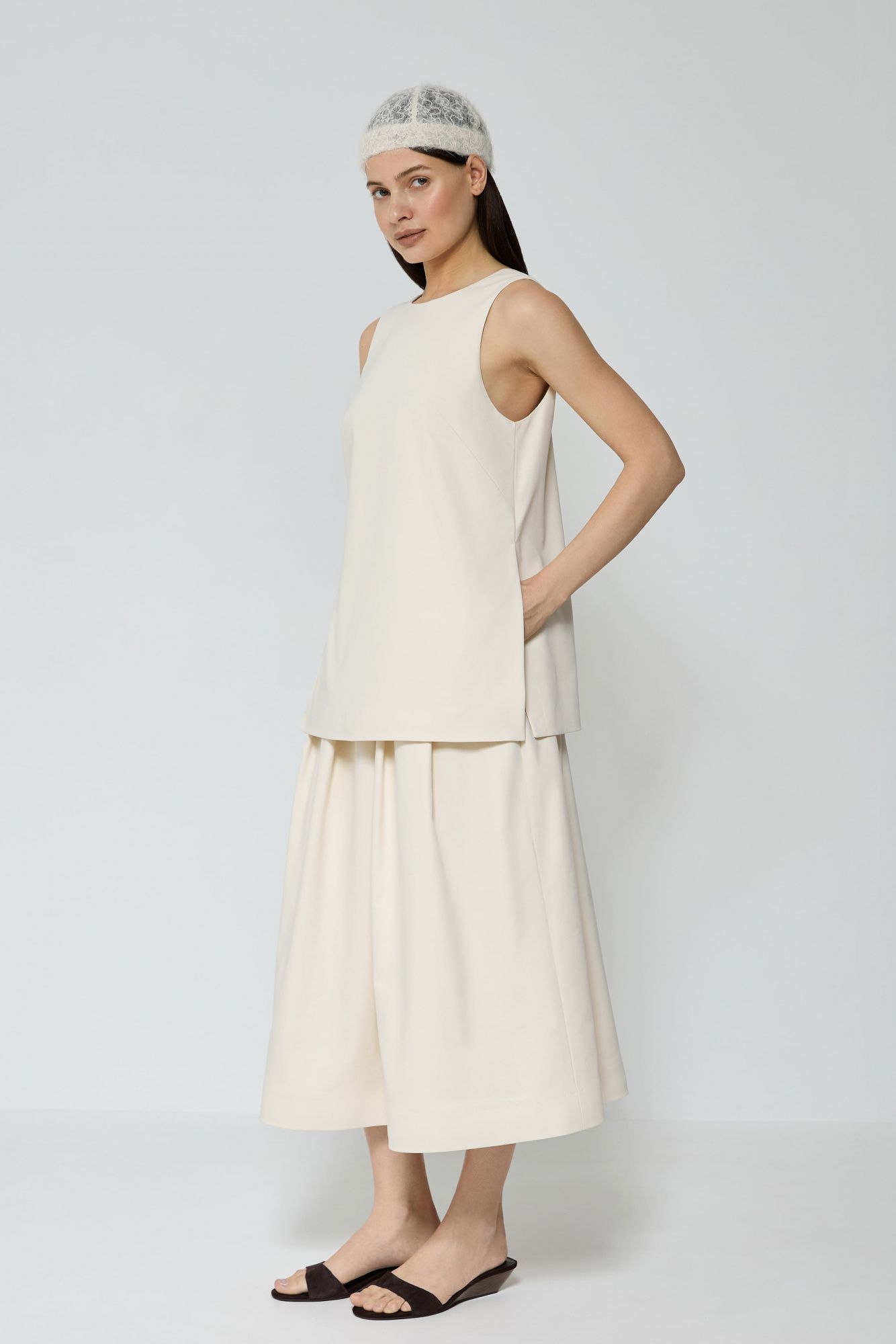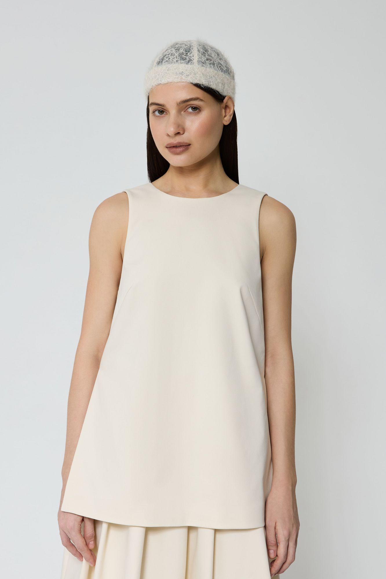 Топ удлиненного А-силуэта сшит из тонкой костюмно-плательной ткани, в основе которой хлопок. Подкладка выполнена из поливискозы.