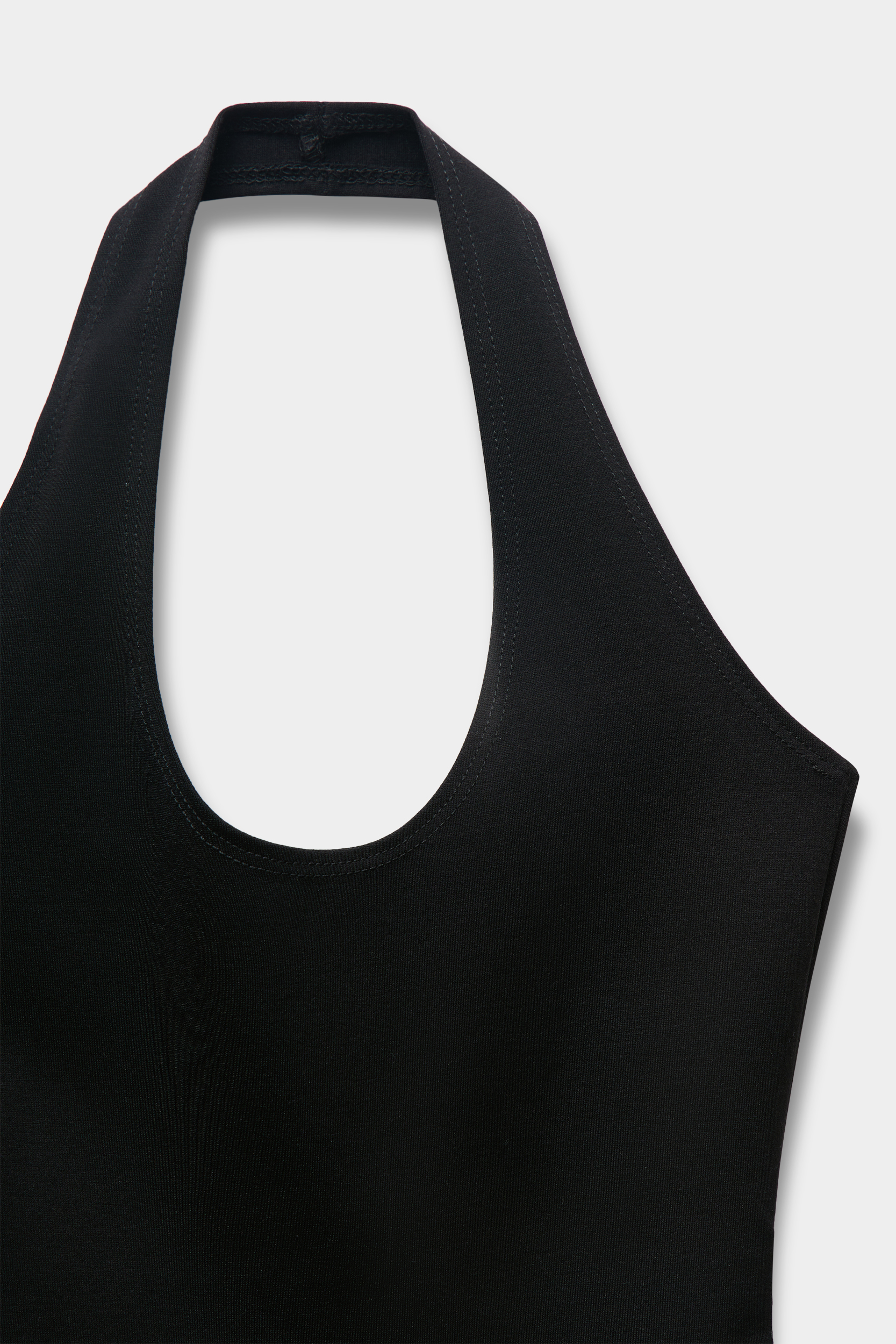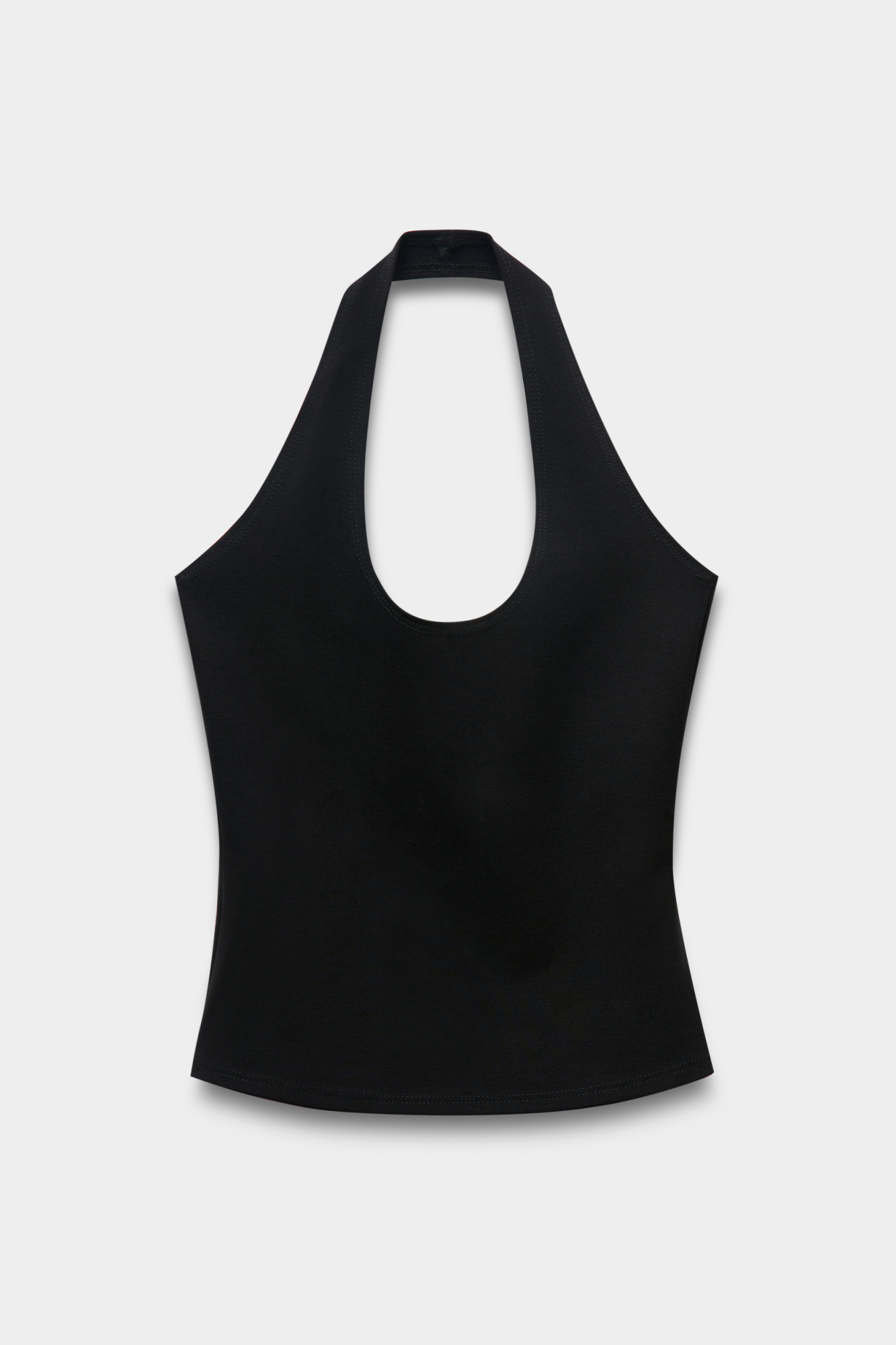 Чёрный топ с вырезом халтер — идеальный выбор для создания стильного и женственного образа. Вырез добавляет изюминку и подчёркивает зону декольте. Топ отлично подойдёт для повседневных образов или для встреч с друзьями. Сочетайте его с джинсами, брюками или юбкой для создания разнообразных ансамблей.