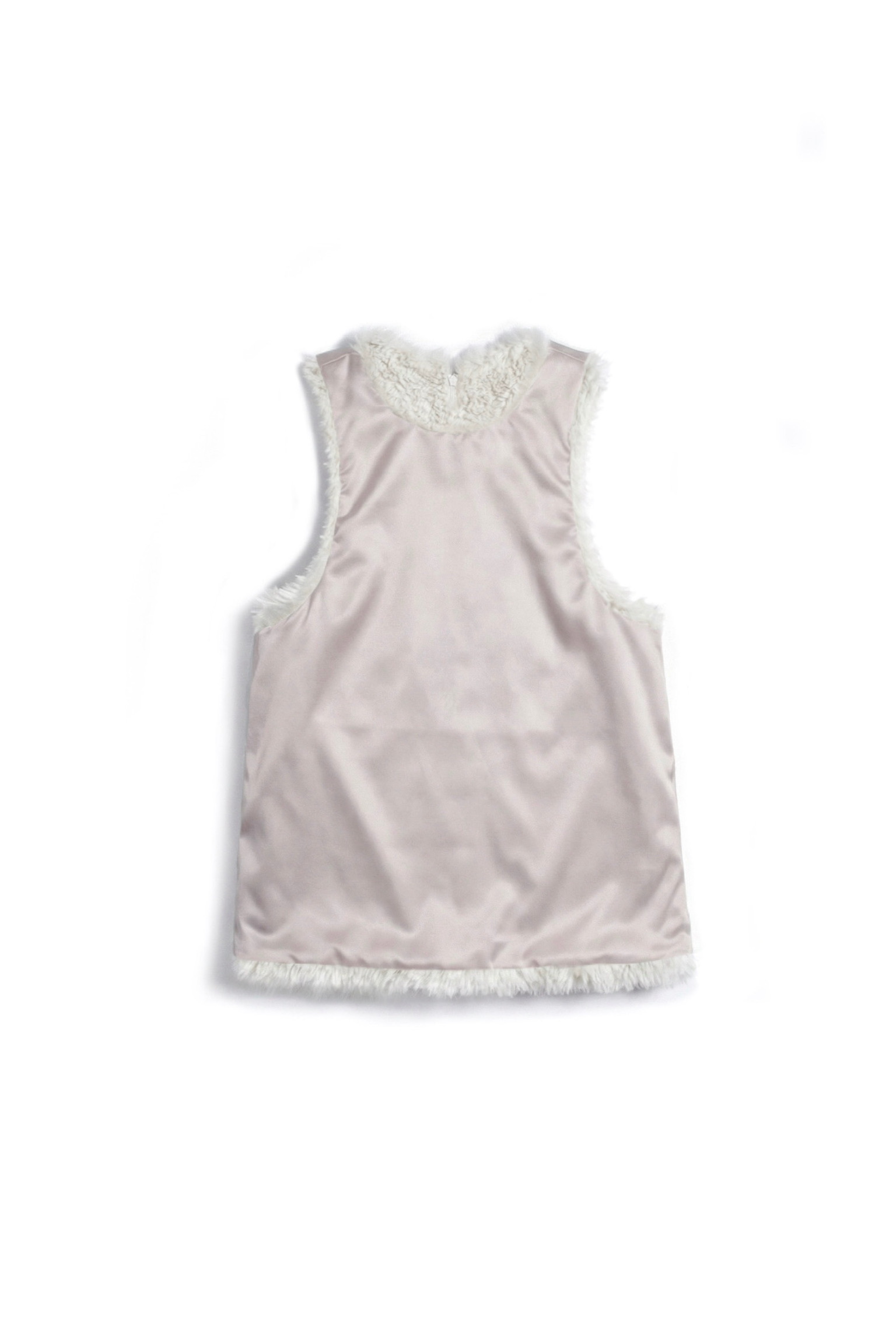 Легко считываемая конструкция тренировочной майки-джерси с углубленной проймой, обнажающей боковую часть торса и лопатки, исполненная в неочевидном материале. Облаченная в мех майка перестала быть просто спортивной. Привычный силуэт смещается в сторону фактуры, ощутимой плотности меха и графичности линий. Топ рассчитан на ношение на открытом теле — тот случай, когда материал работает в контакте с кожей.
