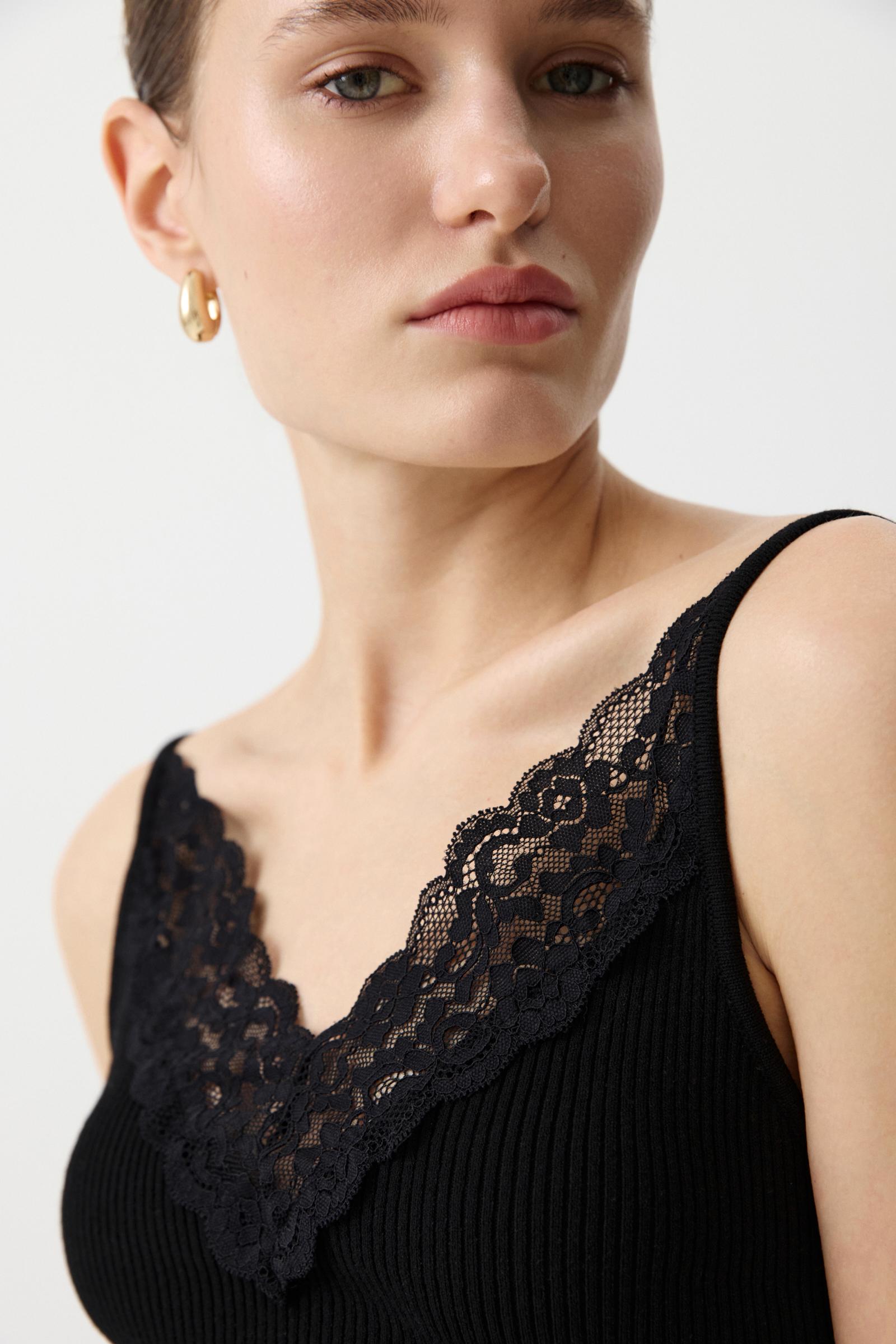 Вязаный топ с кружевной отделкой на тонких бретелях утонченная, нежная модель для легких романтичный образов. Мягкая пряжа с вискозой в составе приятно ощущается на коже, хорошо держит форму и красиво ложится по фигуре. Деликатное кружево по V-образному вырезу, притаченное фигурным срезом, подчеркивает линию плеч и ключиц.