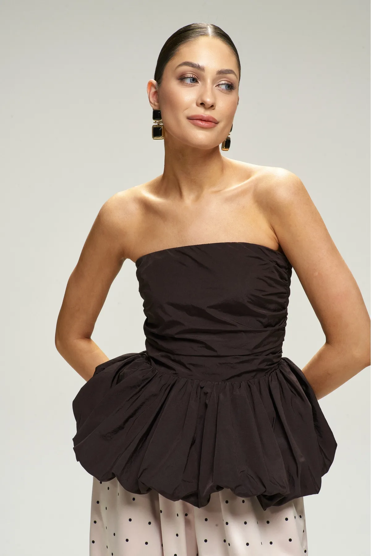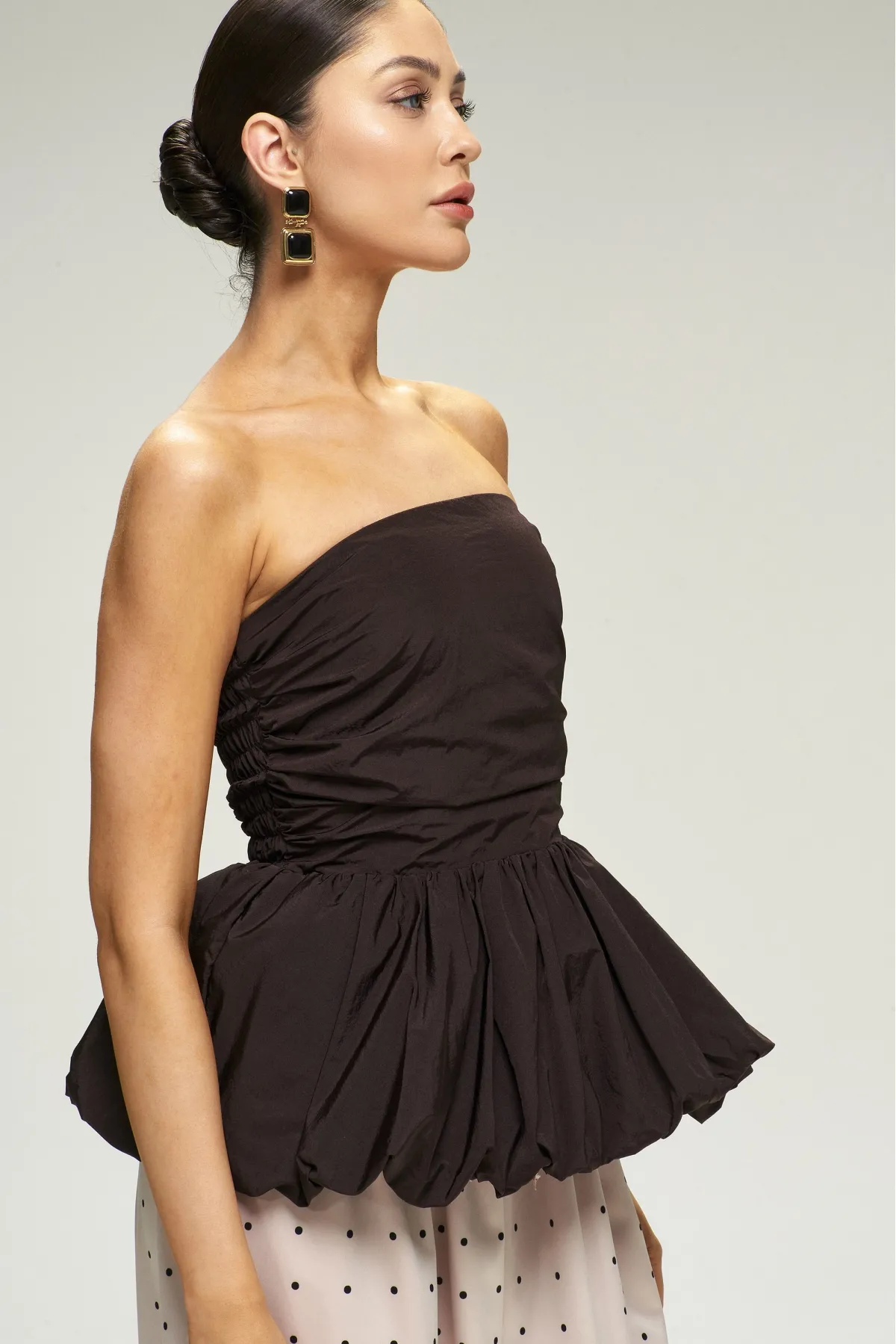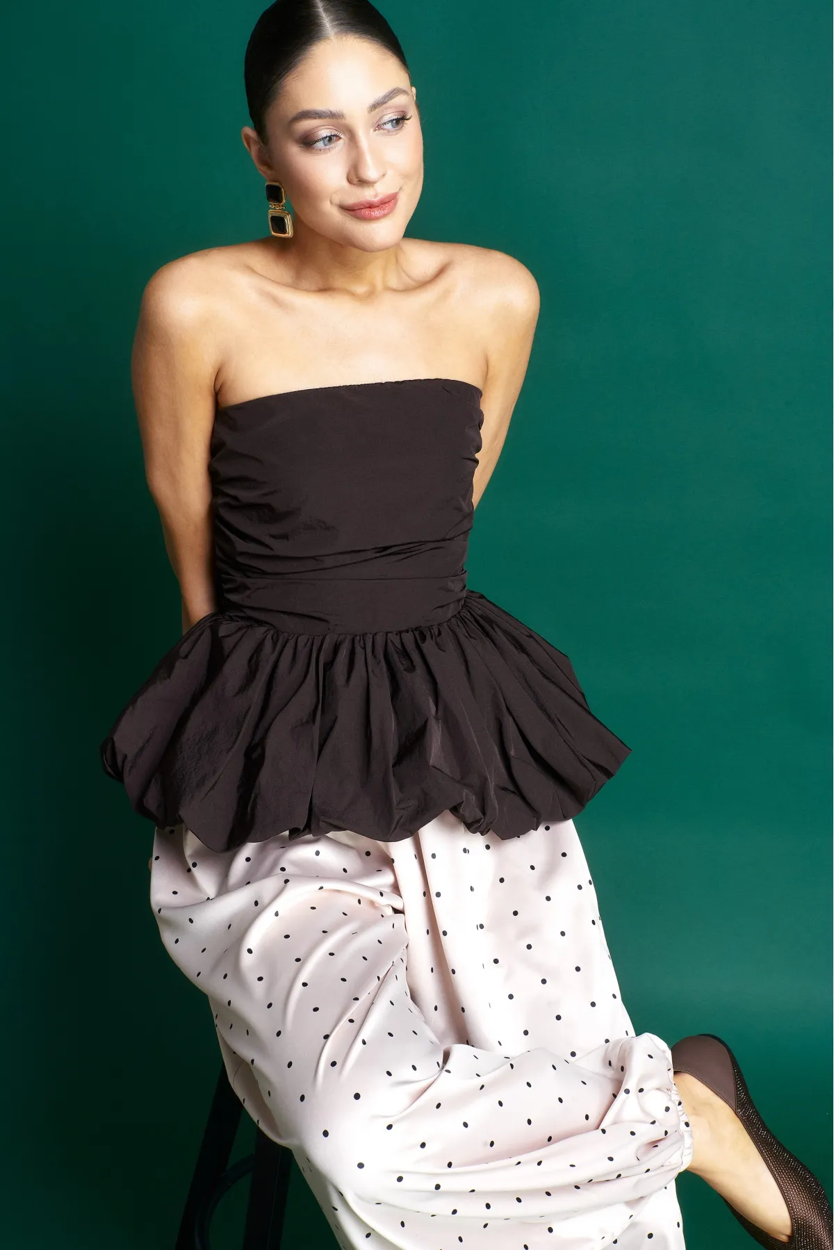Топ‑корсет с баской — драматичная и утончённая вещь, которая моментально делает образ праздничным.
