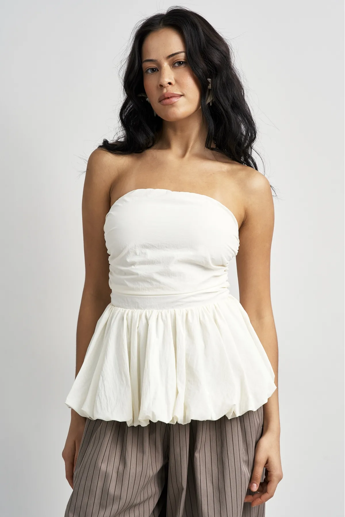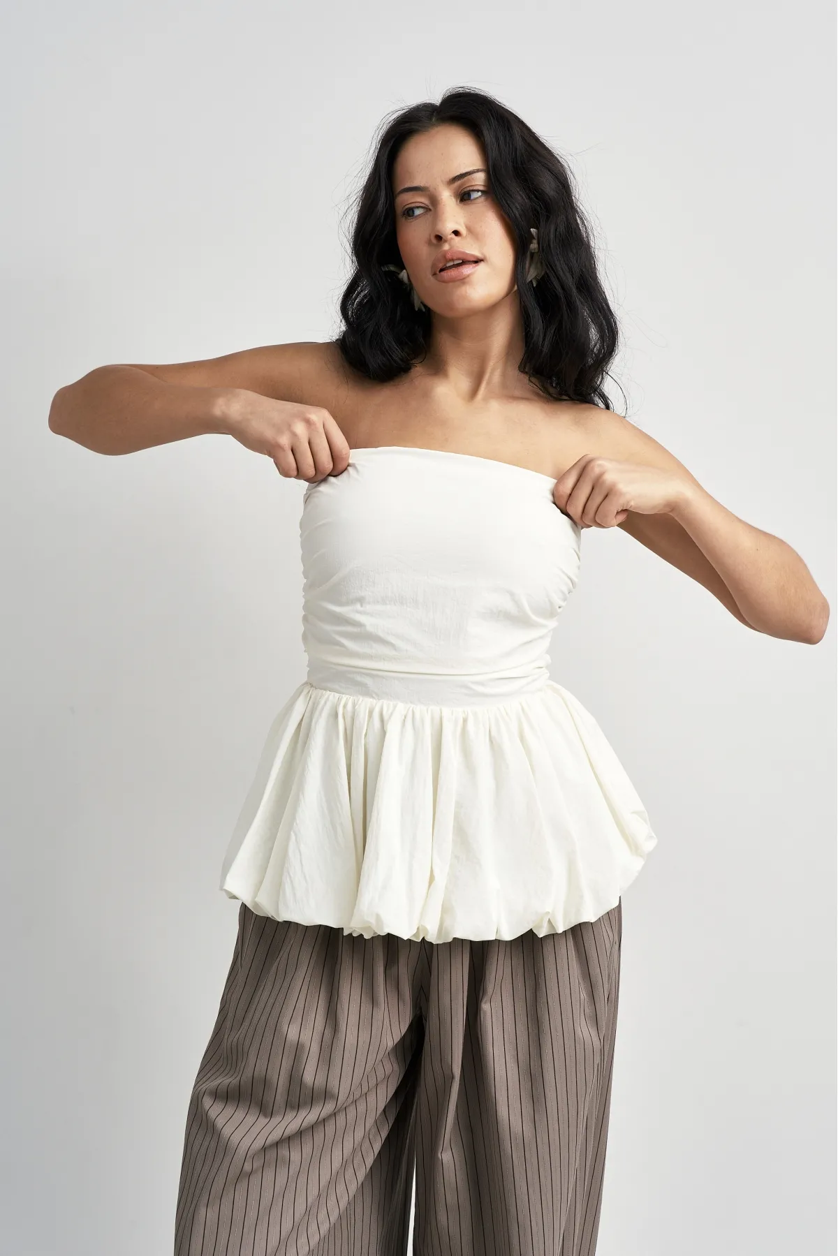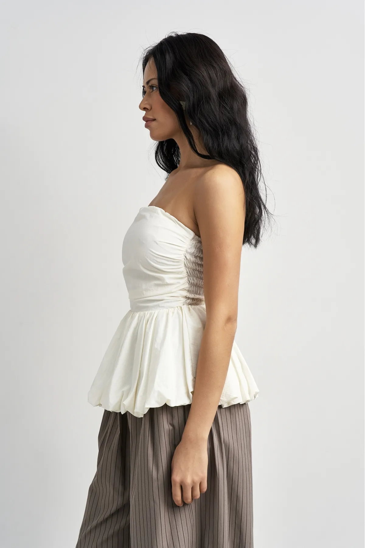 Открытая спина украшена элегантной тонкой резинкой, благодаря которой изделие плотно и комфортно садится по фигуре. Баска средней пышности напоминает юбку‑баллон и придаёт силуэту игривый объём без лишней тяжести.