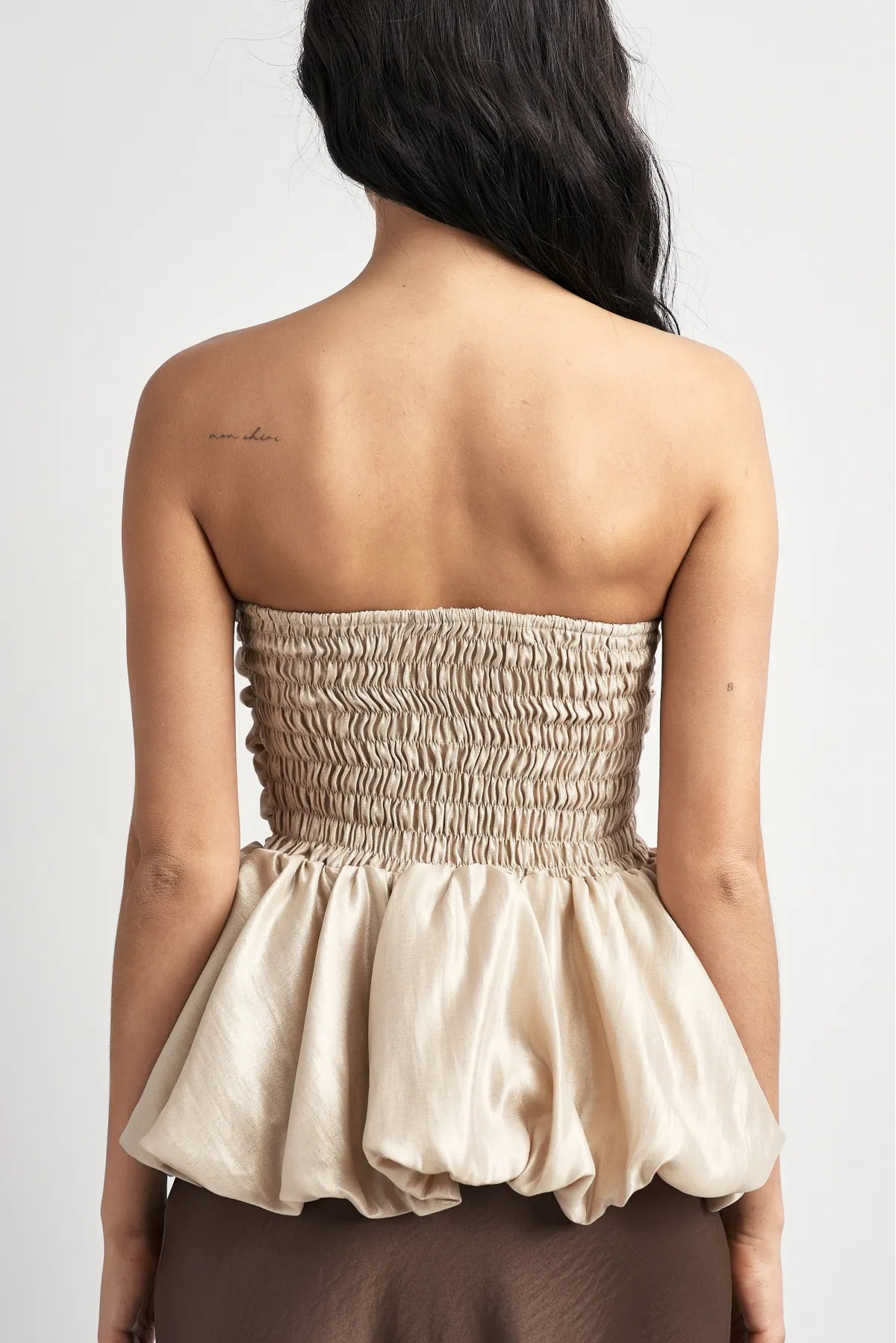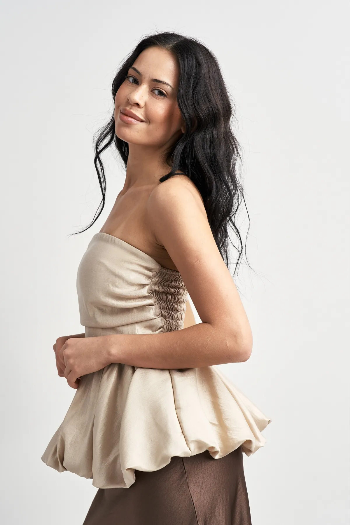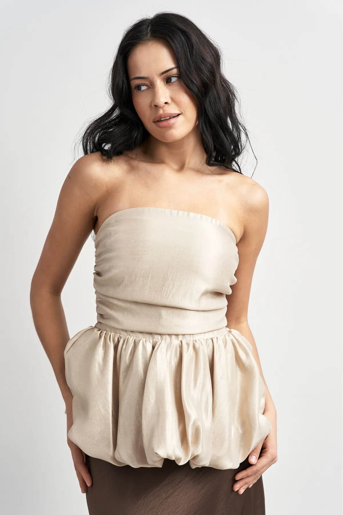Открытая спина украшена элегантной тонкой резинкой, благодаря которой изделие плотно и комфортно садится по фигуре. Баска средней пышности напоминает юбку‑баллон и придаёт силуэту игривый объём без лишней тяжести.