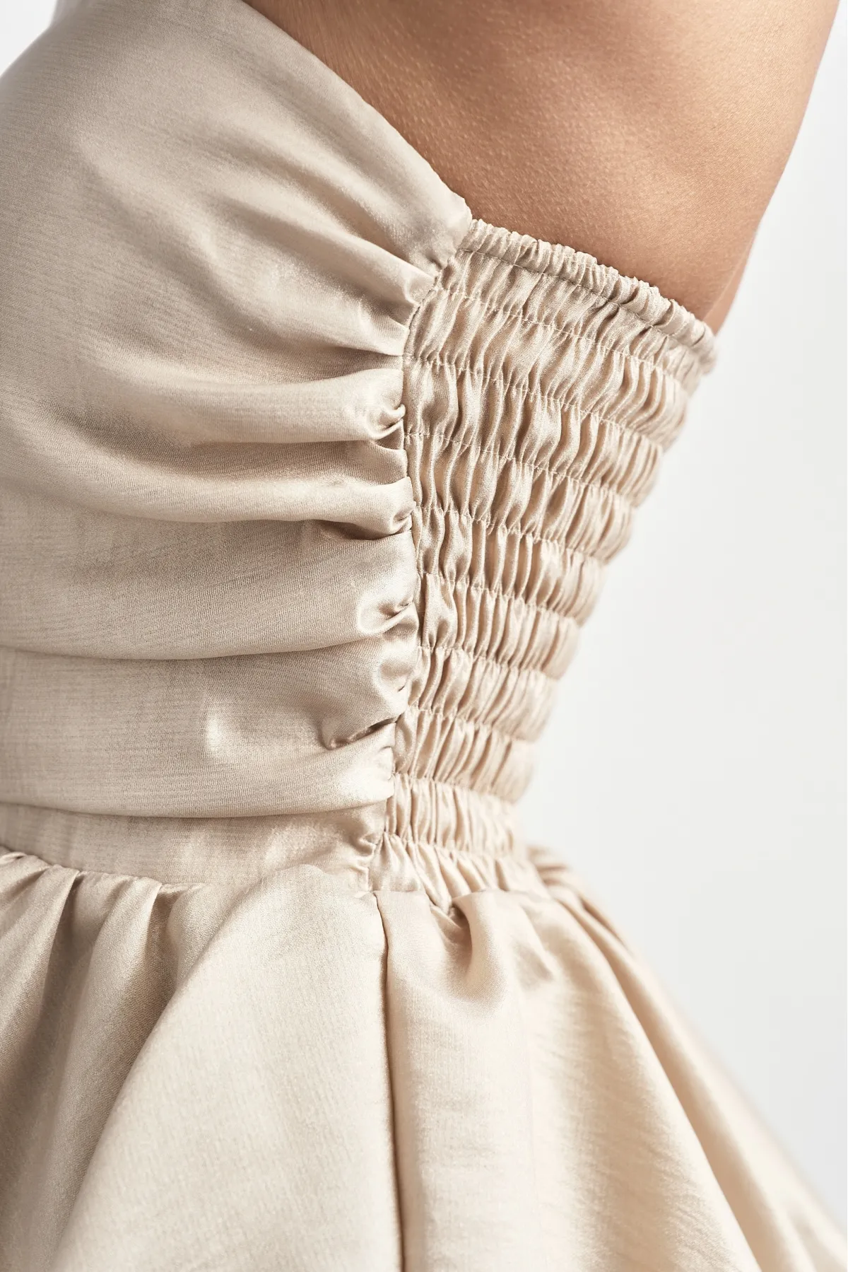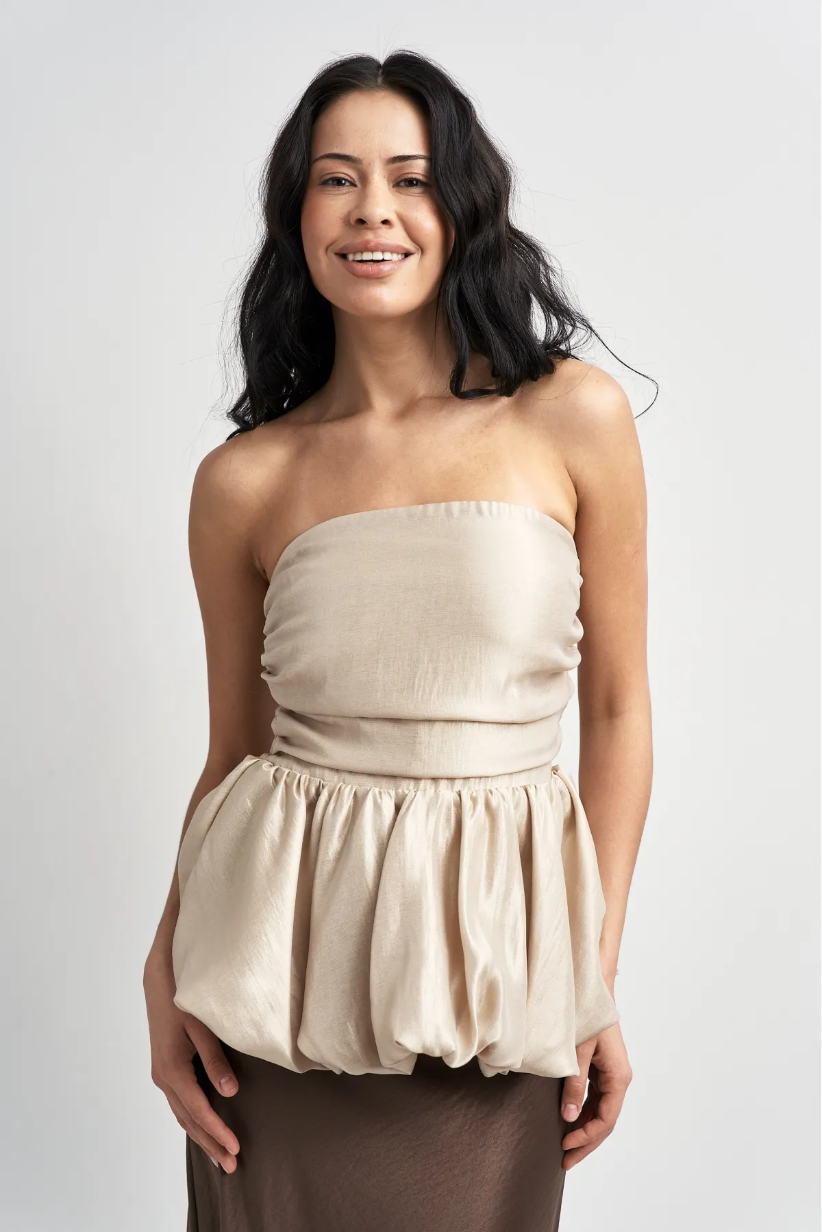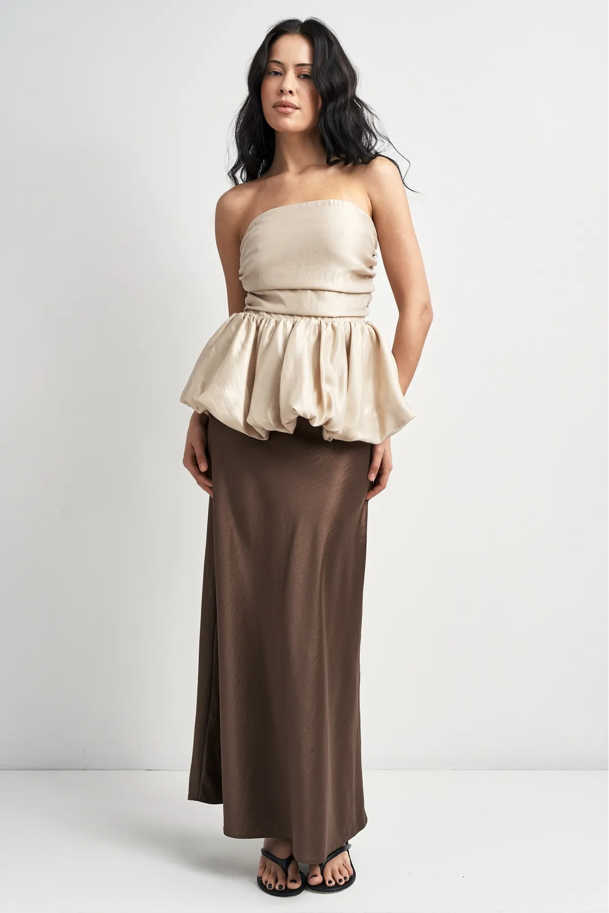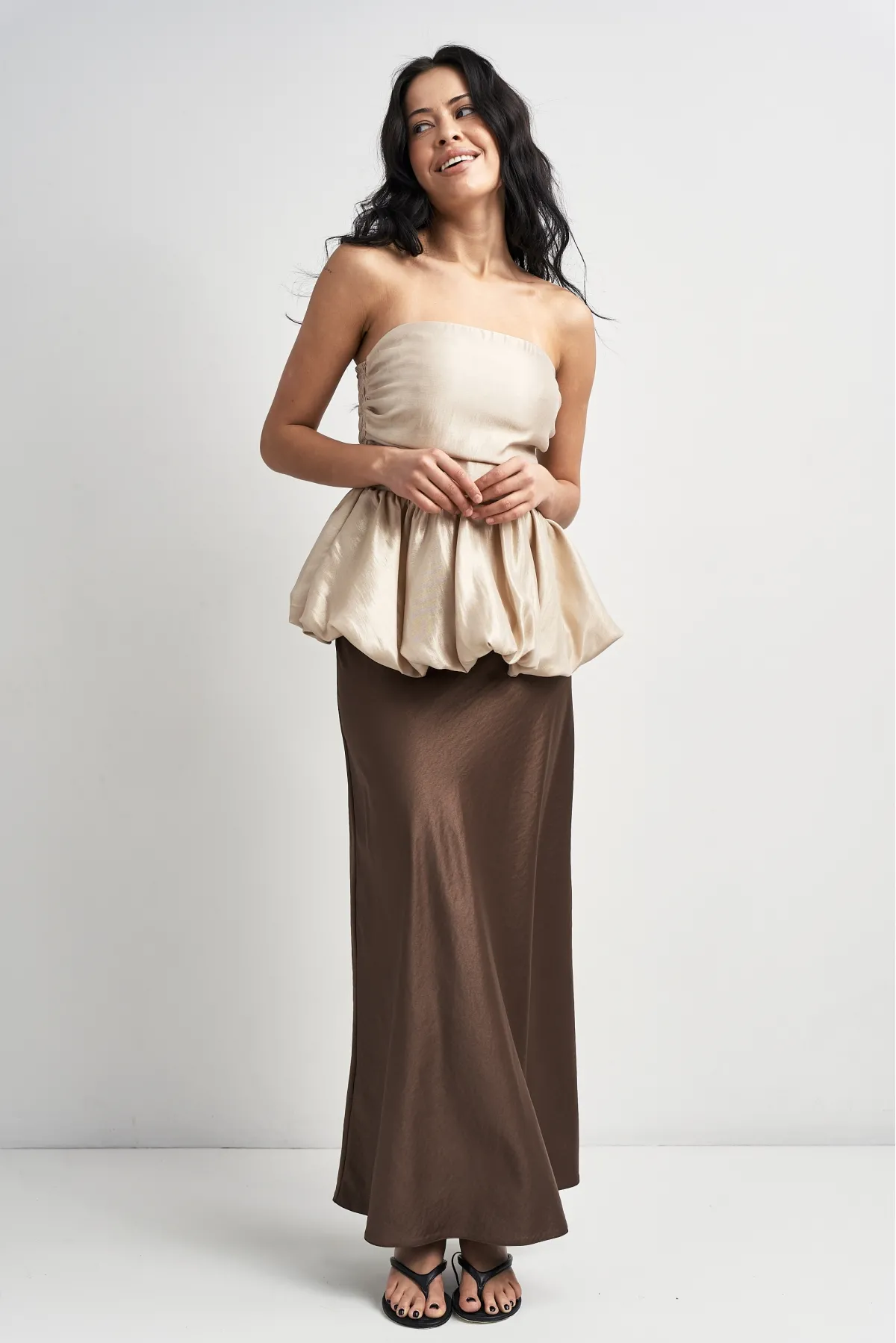 Открытая спина украшена элегантной тонкой резинкой, благодаря которой изделие плотно и комфортно садится по фигуре. Баска средней пышности напоминает юбку‑баллон и придаёт силуэту игривый объём без лишней тяжести.