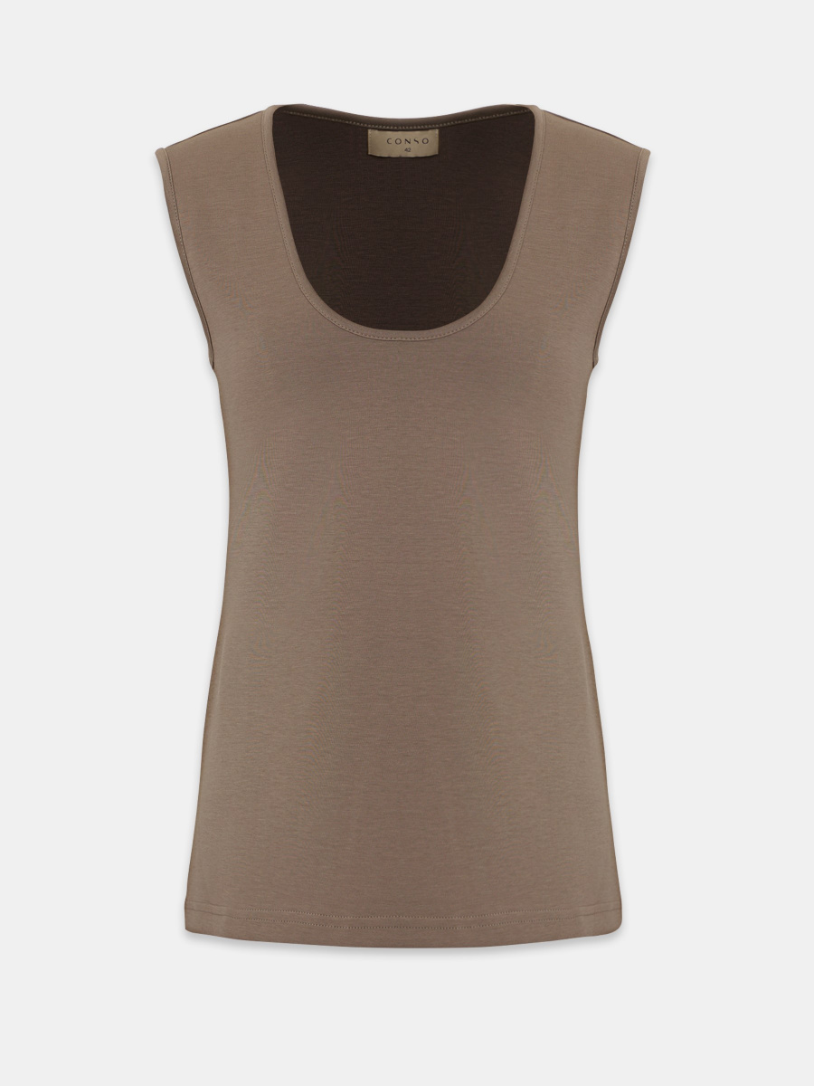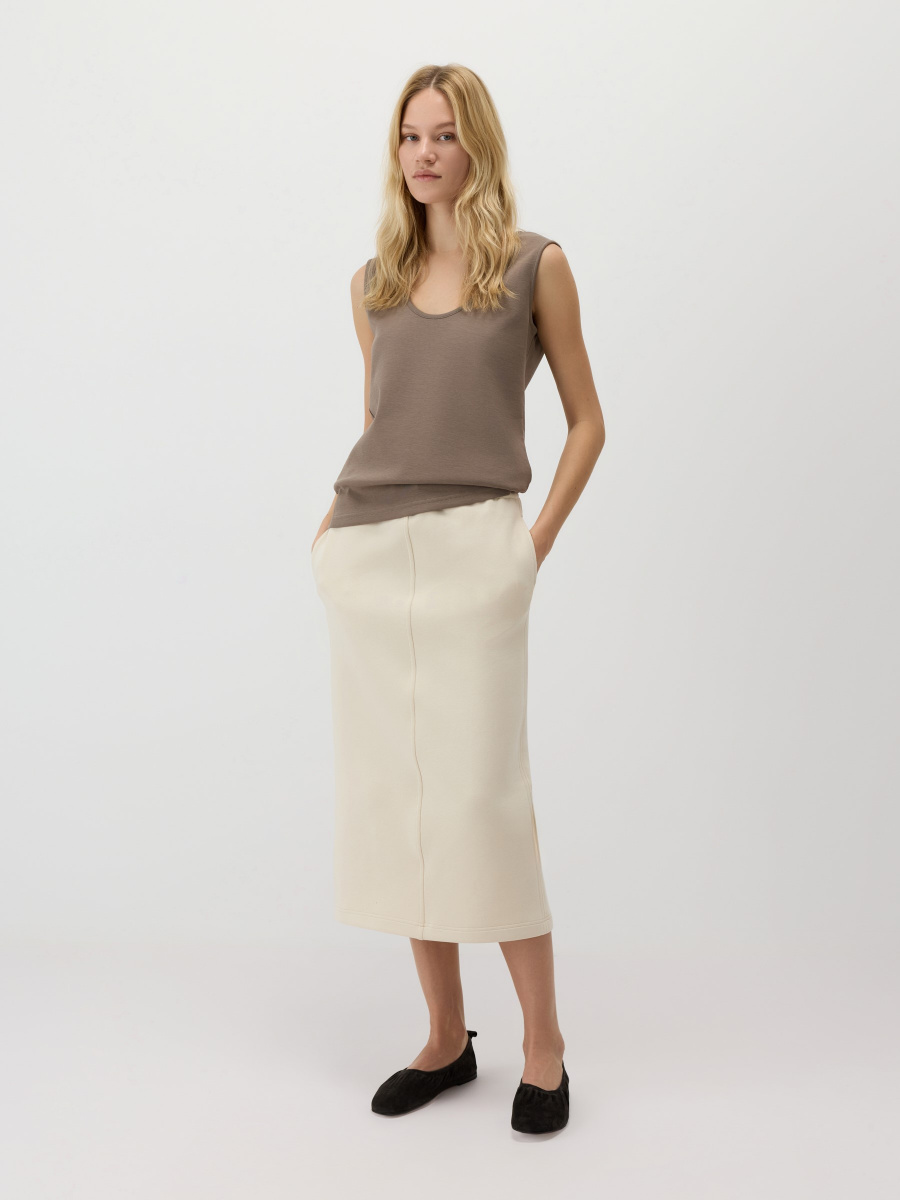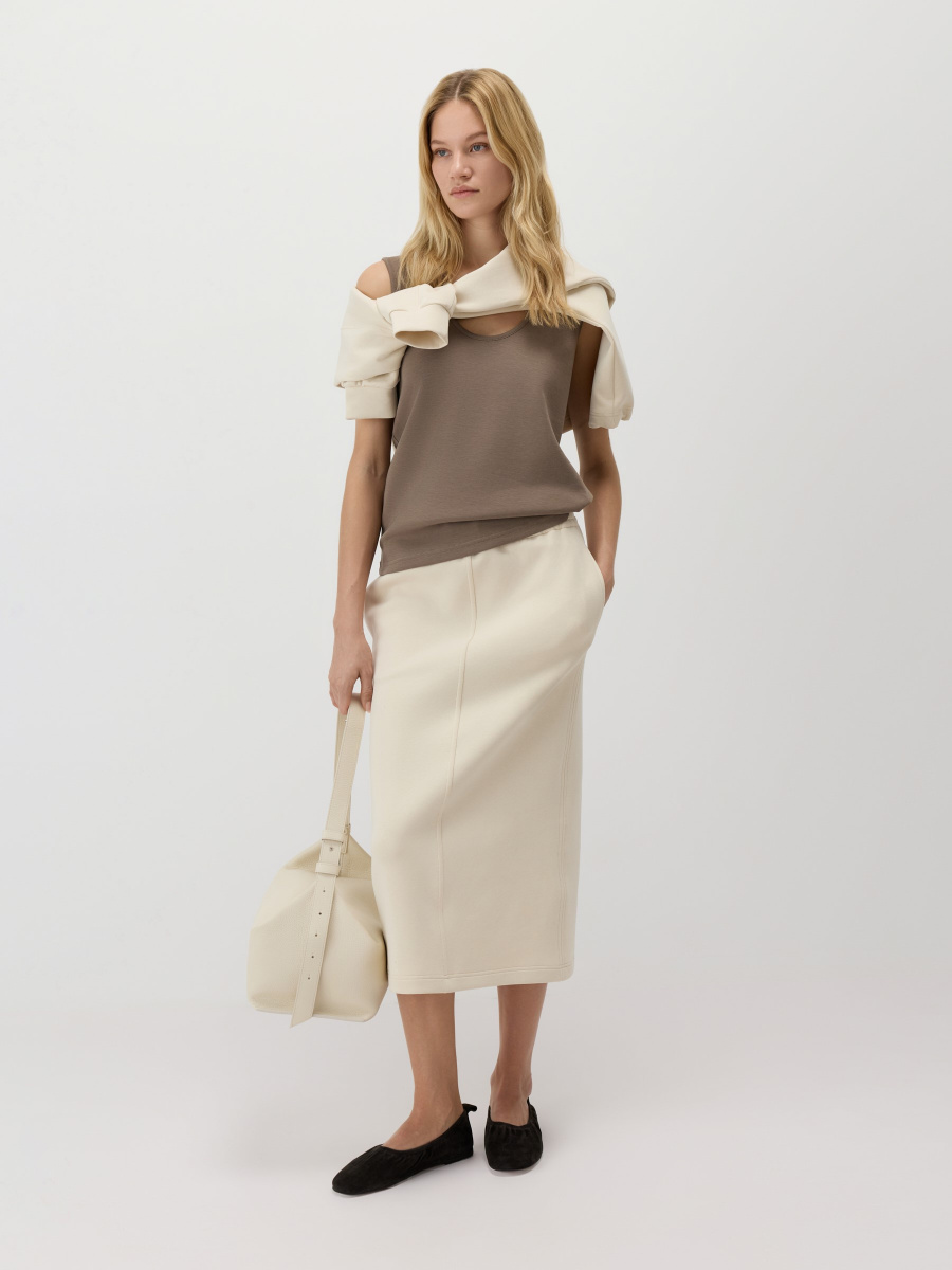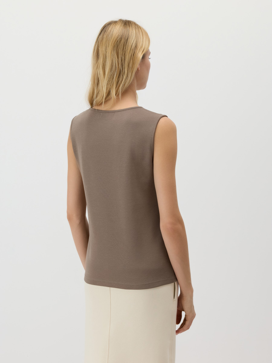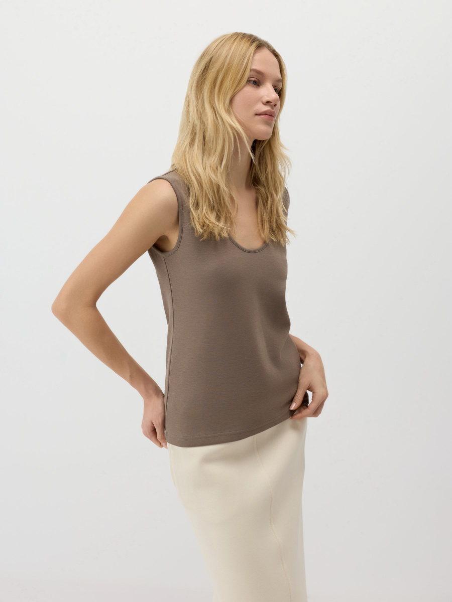 Полуприлегающий топ с широкими бретелями, которые комфортно закрывают плечо. Глубокий округлый вырез визуально вытягивает шею, а длина позволяет как заправить, так и носить изделие навыпуск. Материал — мягкий хлопковый неофутер, держит форму и подчеркивает линии тела.