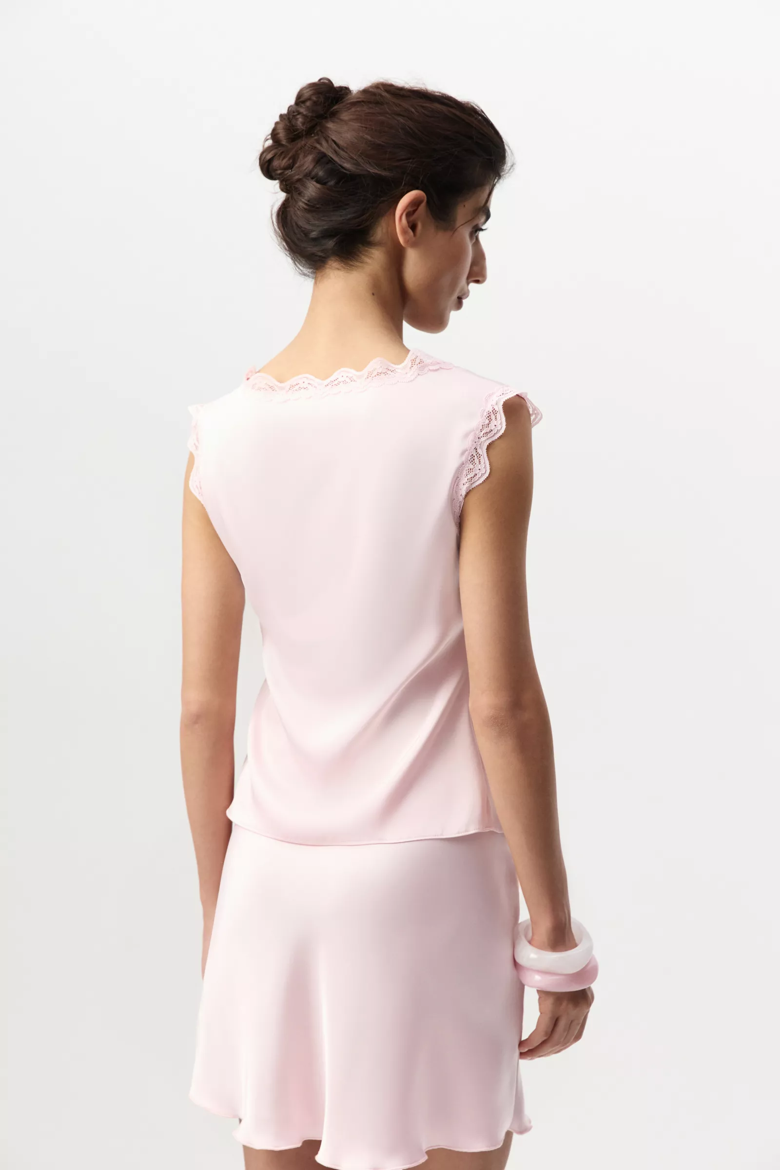 Топ из струящейся сатиновой ткани. Создает хрупкий образ за счет отделки из мягкого кружева по треугольной горловине и пройме. Деликатное дополнение в виде аккуратного бантика придает легкую романтичность образу.