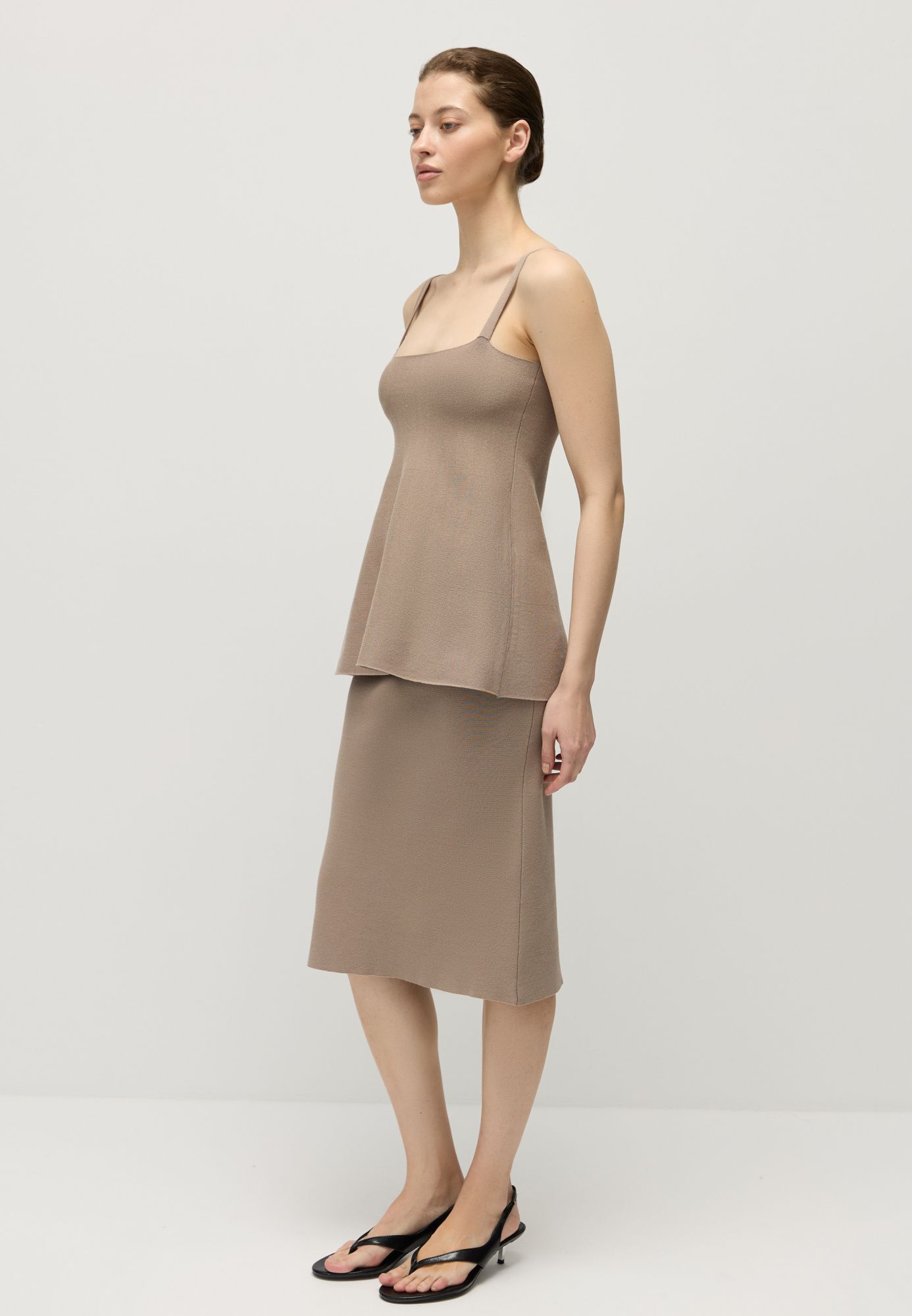 Поддерживает грудь за счет плотной посадки и упругости материала. К низу силуэт становится более расклешенным.