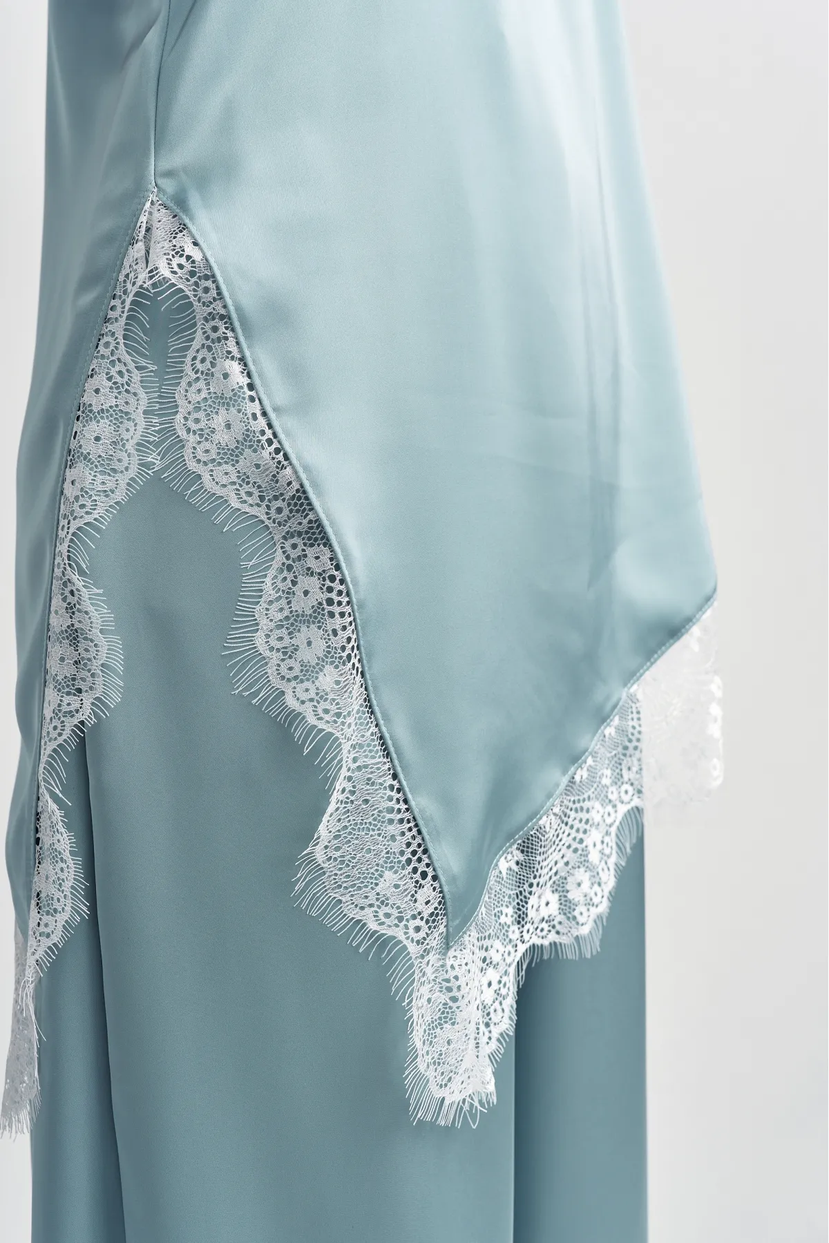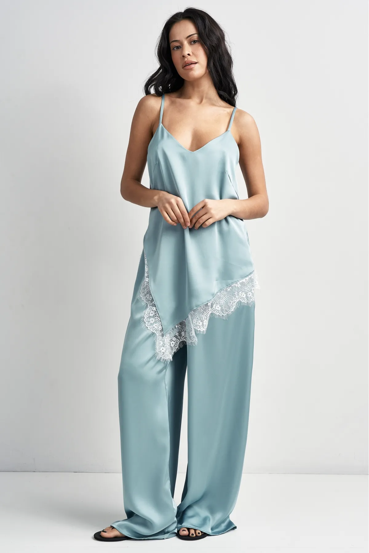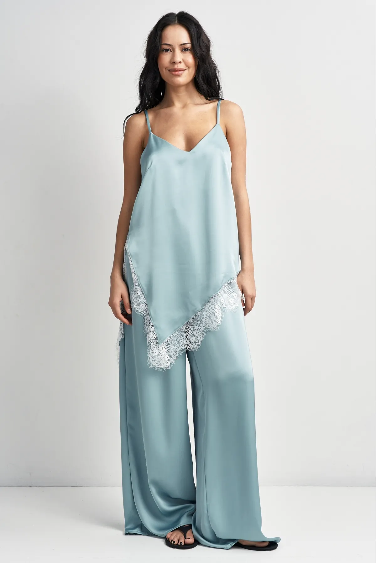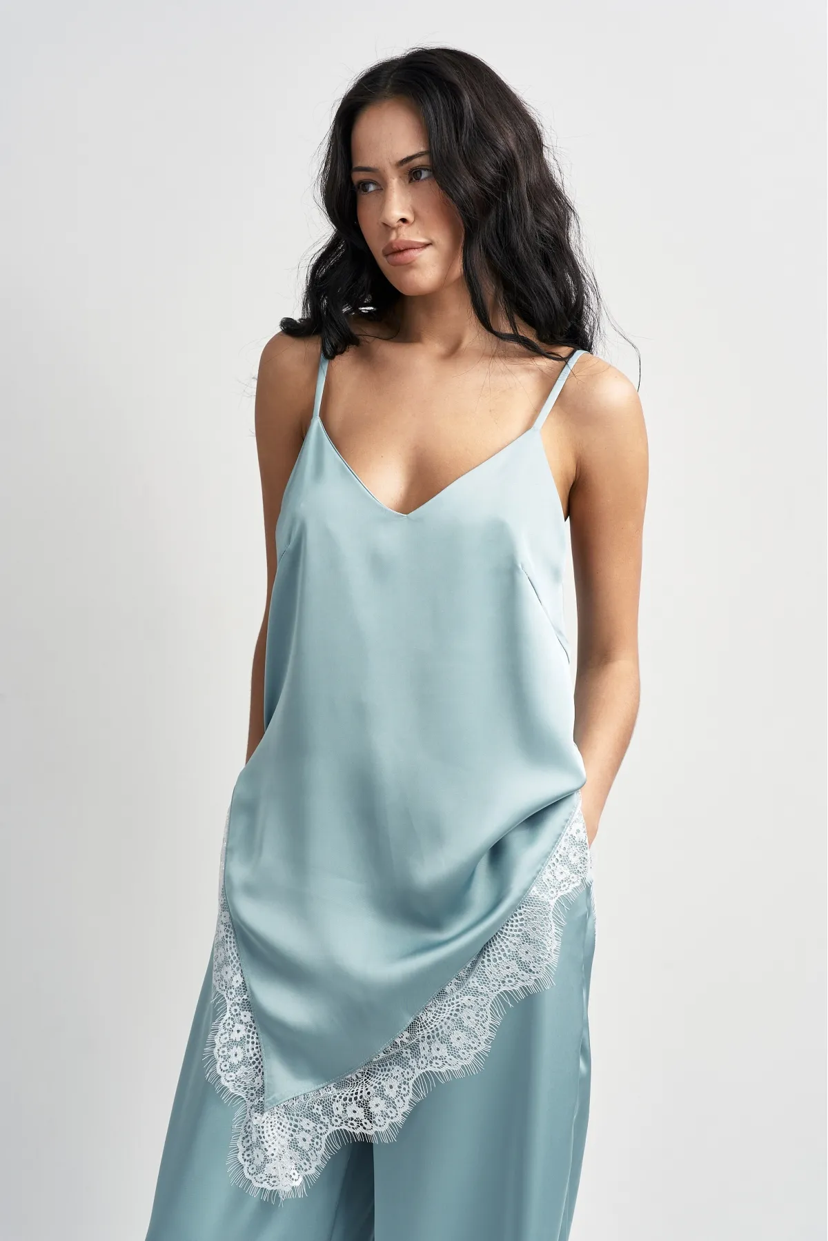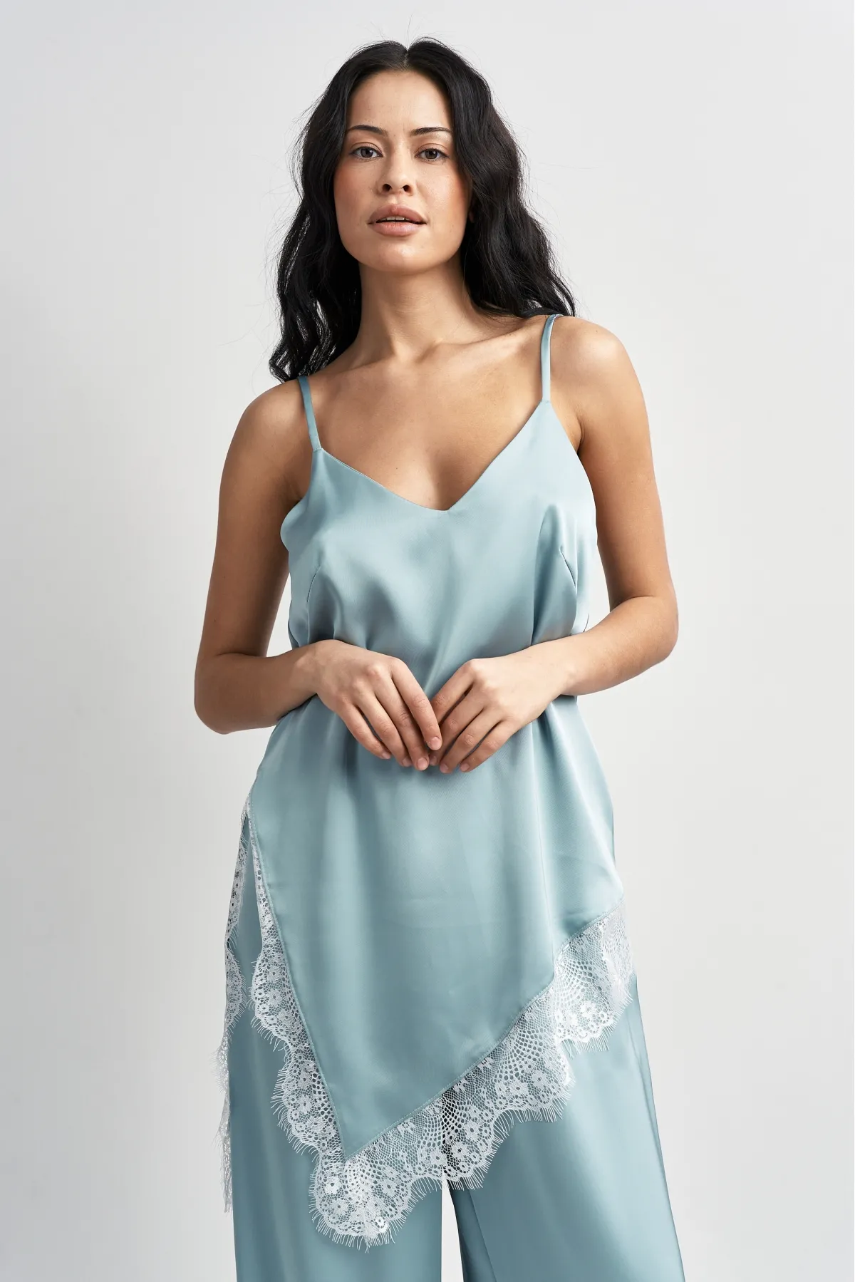 Лёгкий атласный топ с тонкими бретелями женственный и современный. Силуэт и асимметричный низ добавляют динамики, а контрастное кружево по низу делает образ более изысканным и нежным. Топ легко драпируется по телу, подчёркивает линию плеч и визуально удлиняет силуэт.