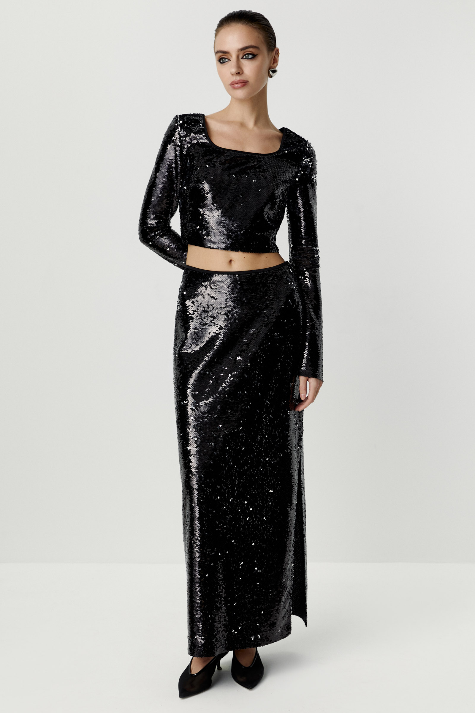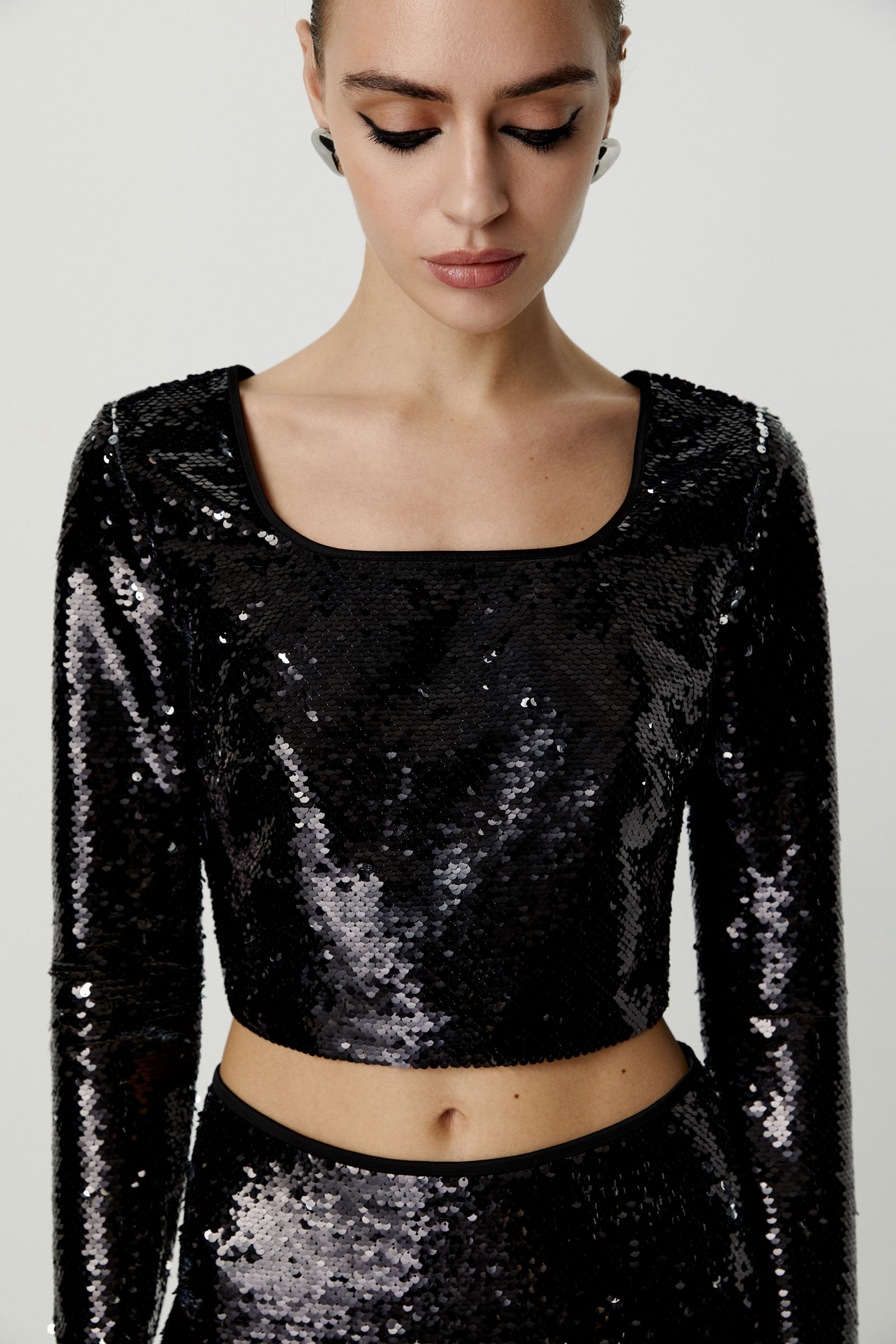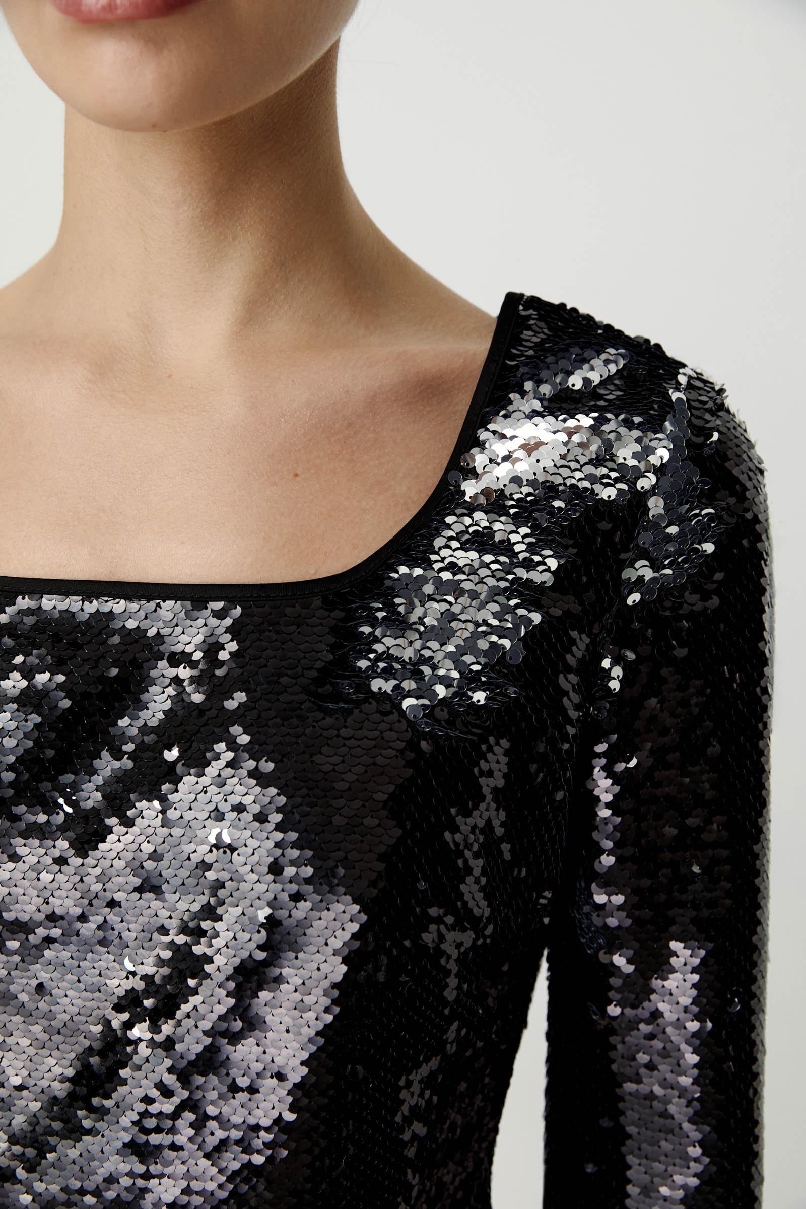 Эффектный топ с пайетками в облегающем прямом силуэте с длинным рукавом. Правильная длина топа и рукава обеспечивает четкую посадку. Квадратный вырез делает особый акцент по линии ключицы. Для создания топа были выбраны двусторонние пайетки черный/серебро.