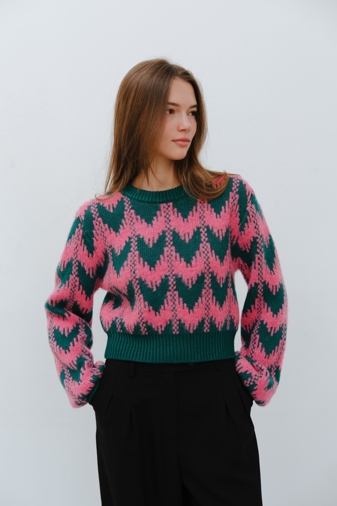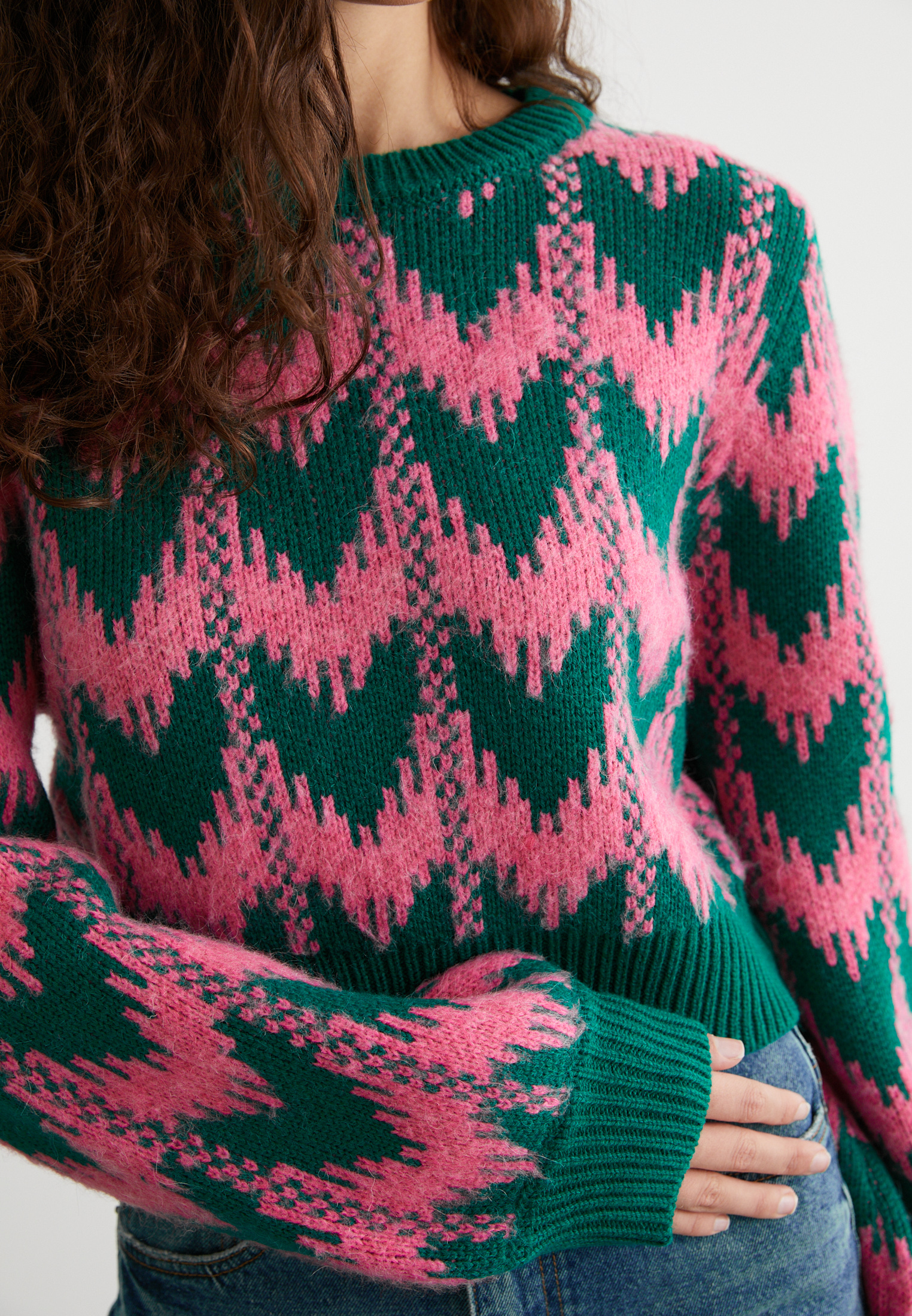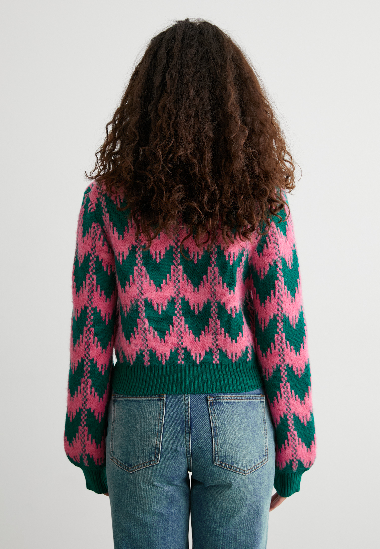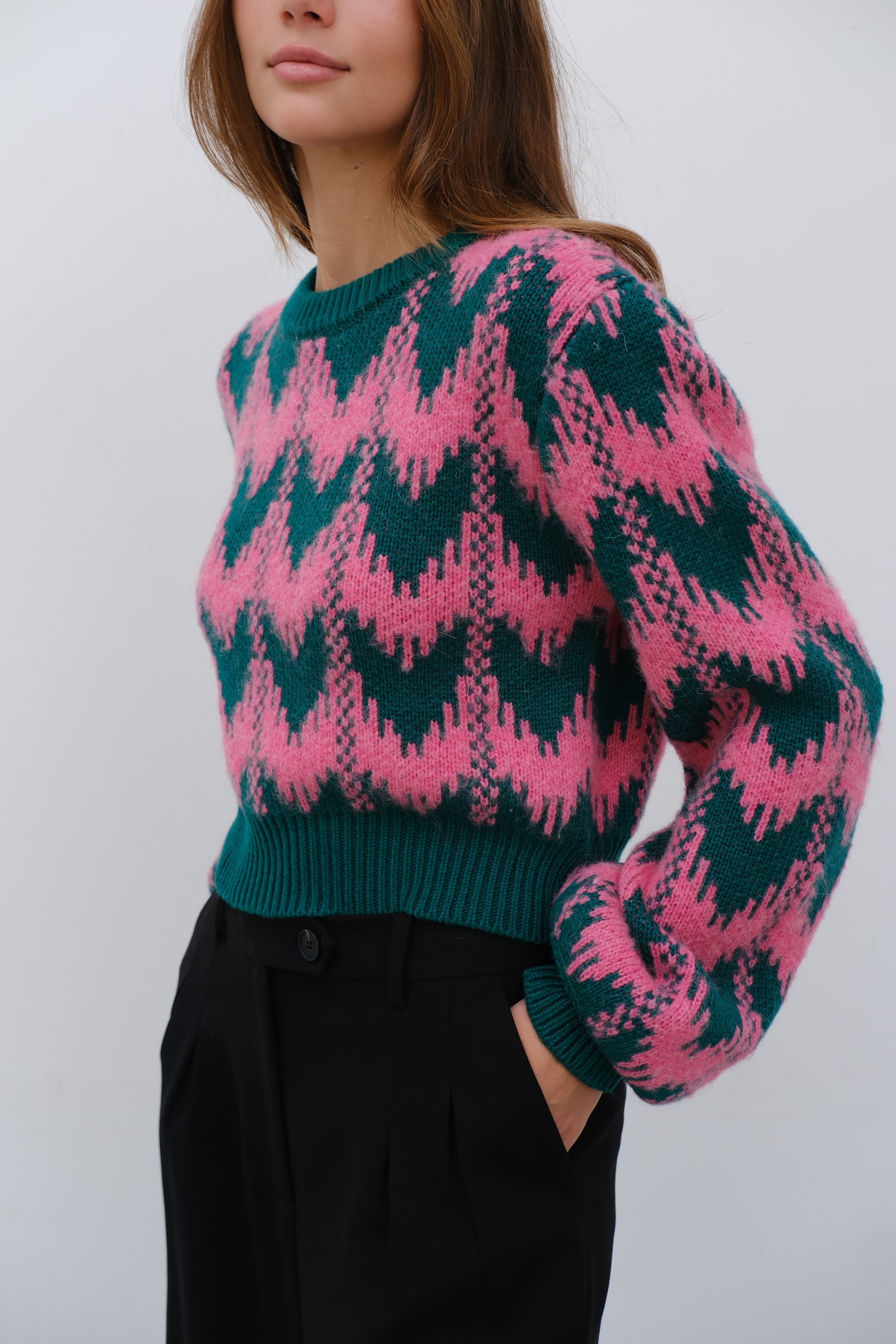 Розово-зелёный принт, мягкая фактура и лаконичный крой — идеальный выбор для тех, кто любит добавлять цвета даже в серые дни. Уютно, стильно, с характером.