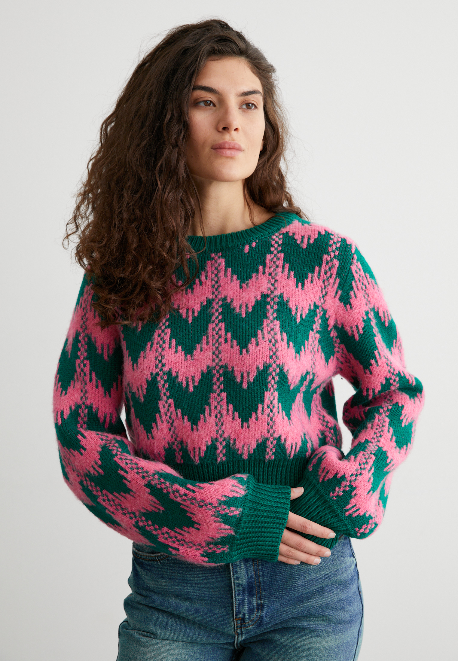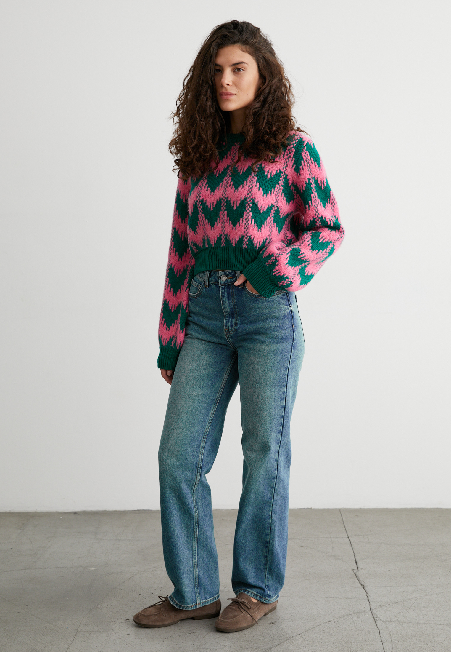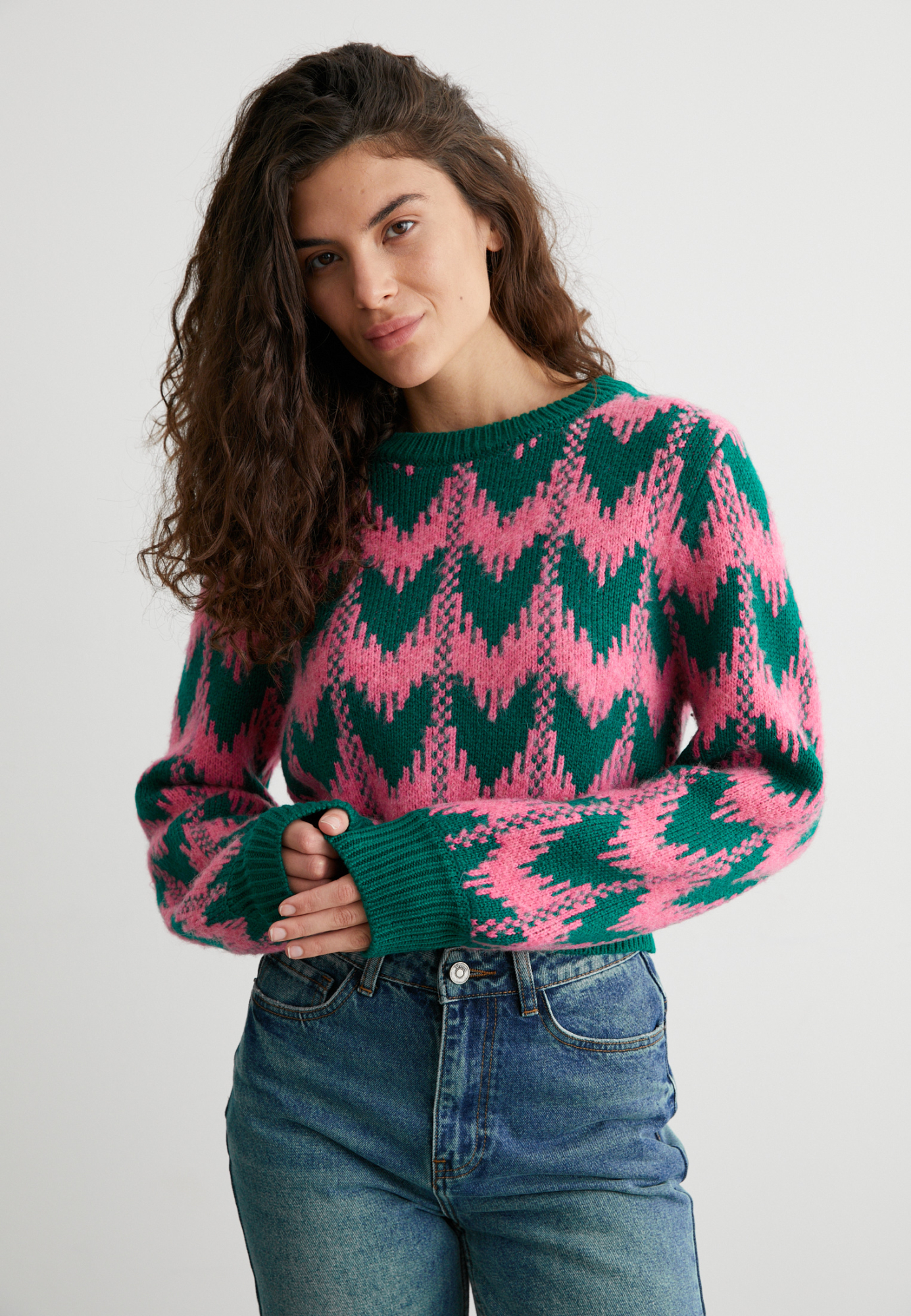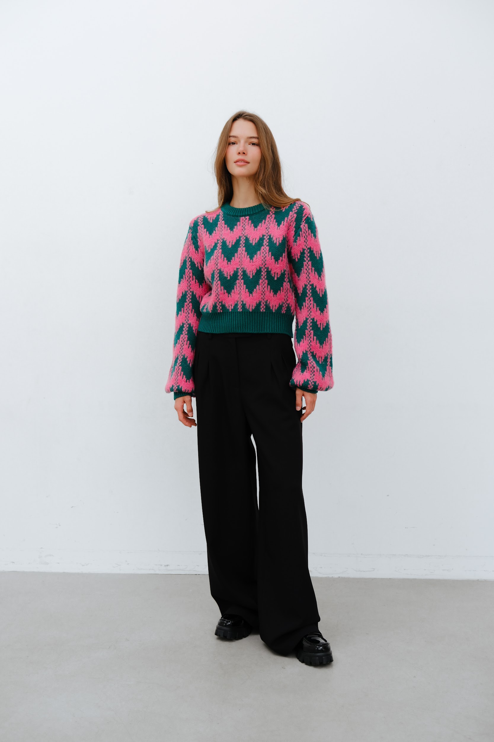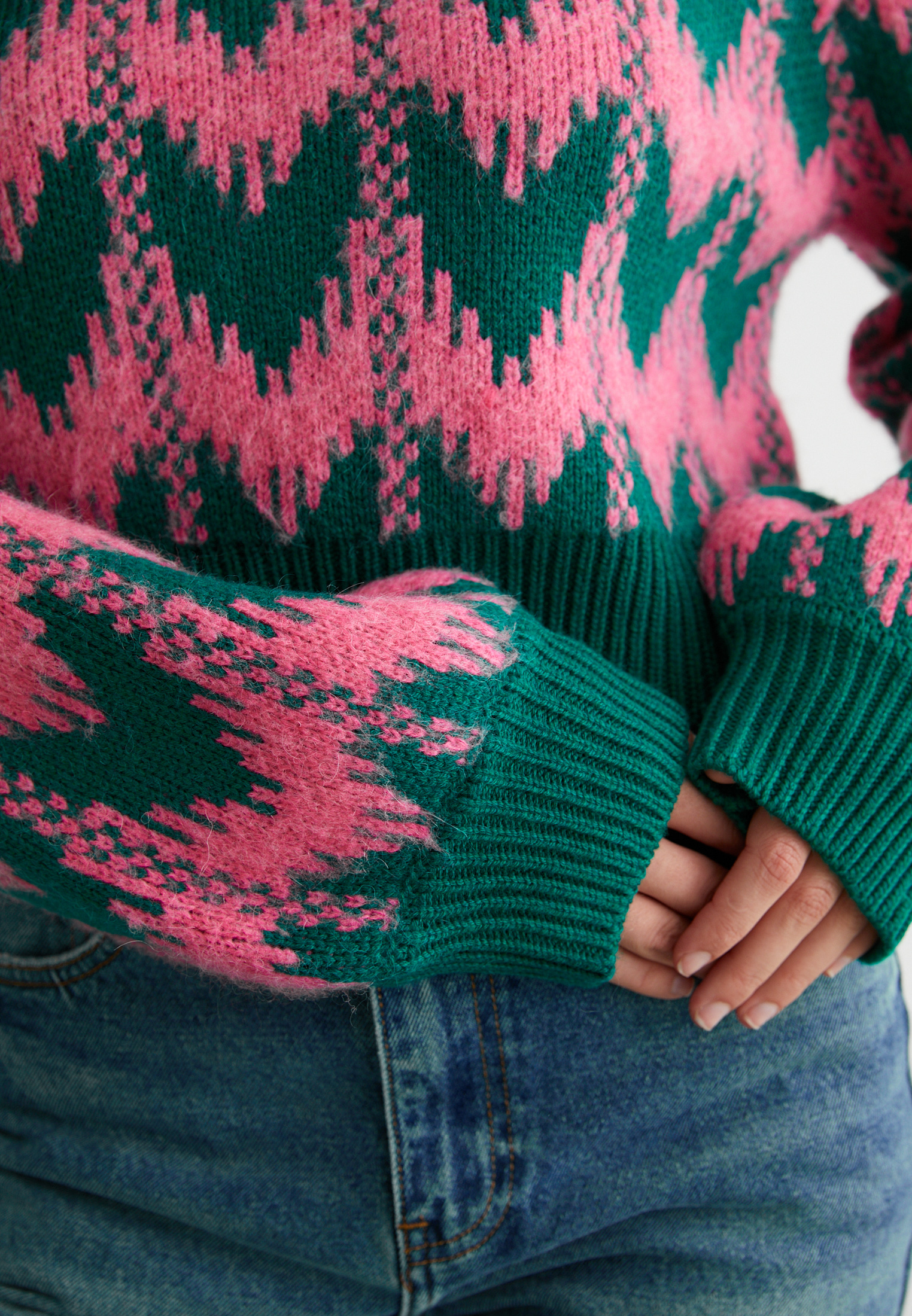 Розово-зелёный принт, мягкая фактура и лаконичный крой — идеальный выбор для тех, кто любит добавлять цвета даже в серые дни. Уютно, стильно, с характером.