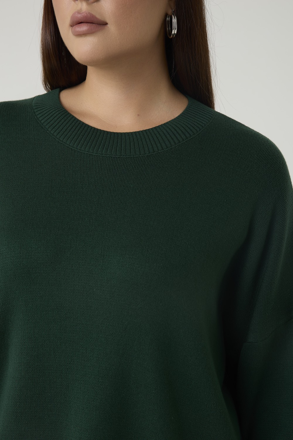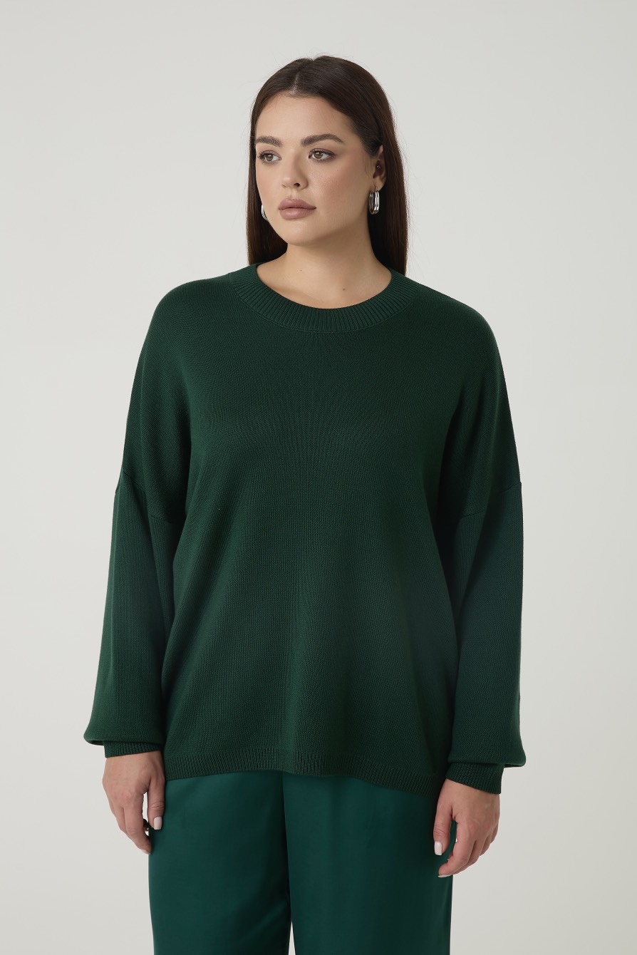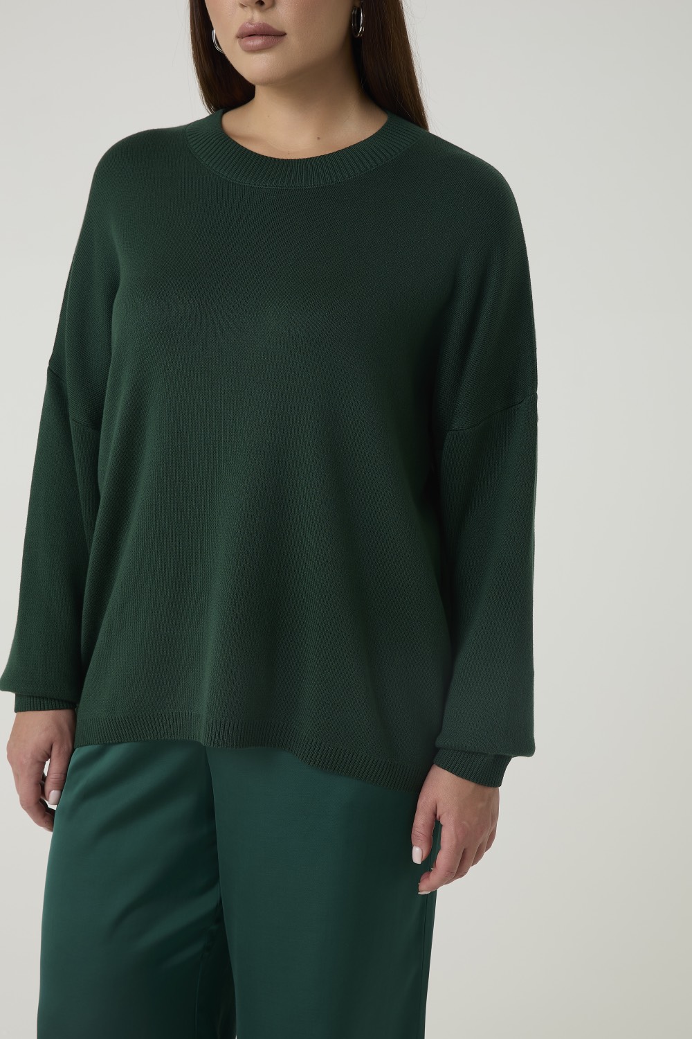 Джемпер вязаный из хлопково-акриловой пряжи. Свободный фасон, длинные рукава-реглан с манжетами, круглый вырез горловины. Эта модель джемпера, безусловно, служит украшением любого стиля - от повседневного до делового.