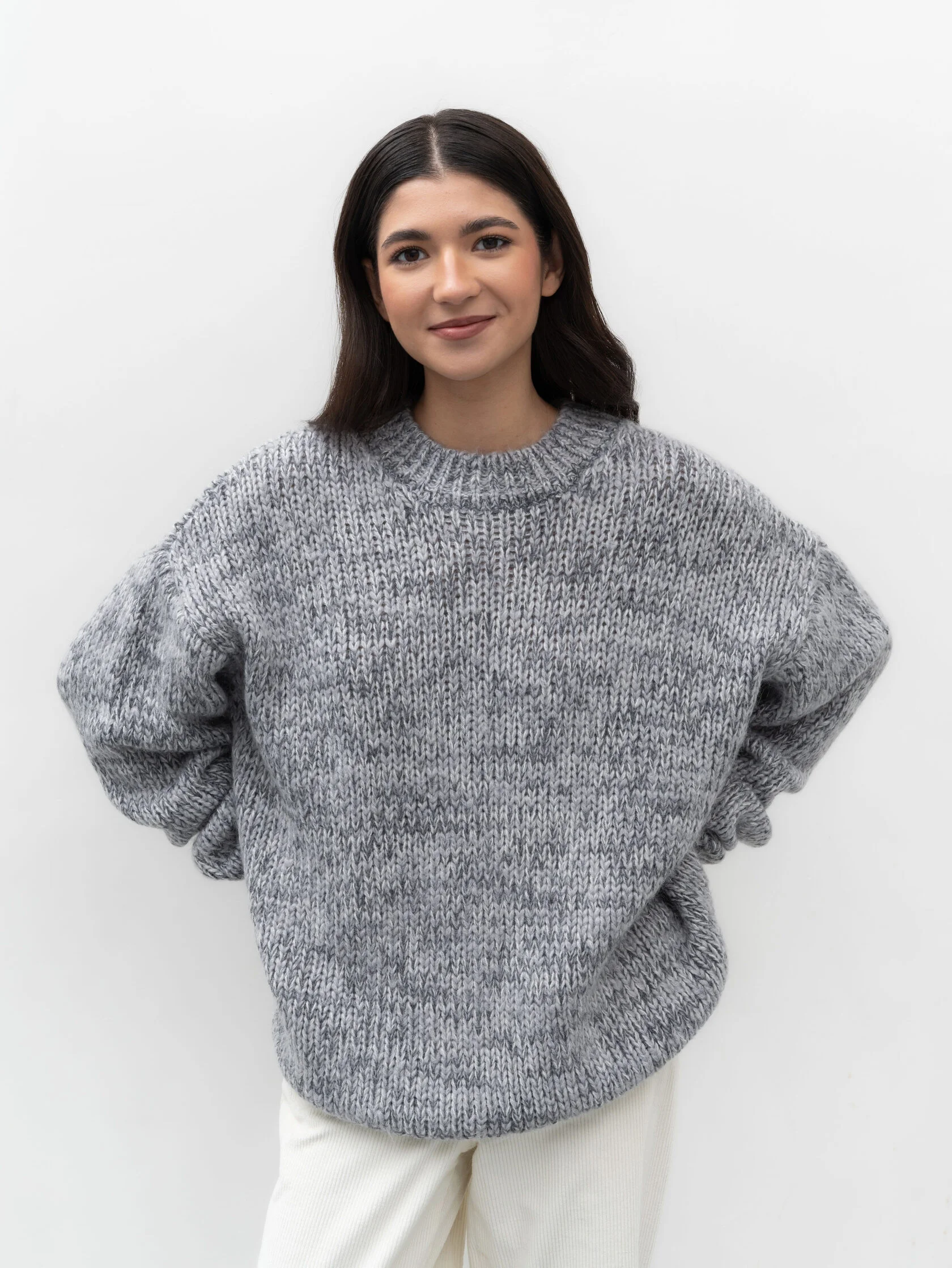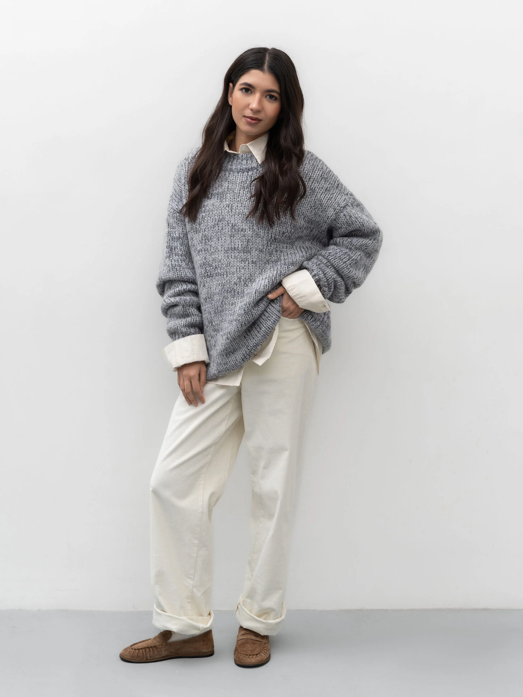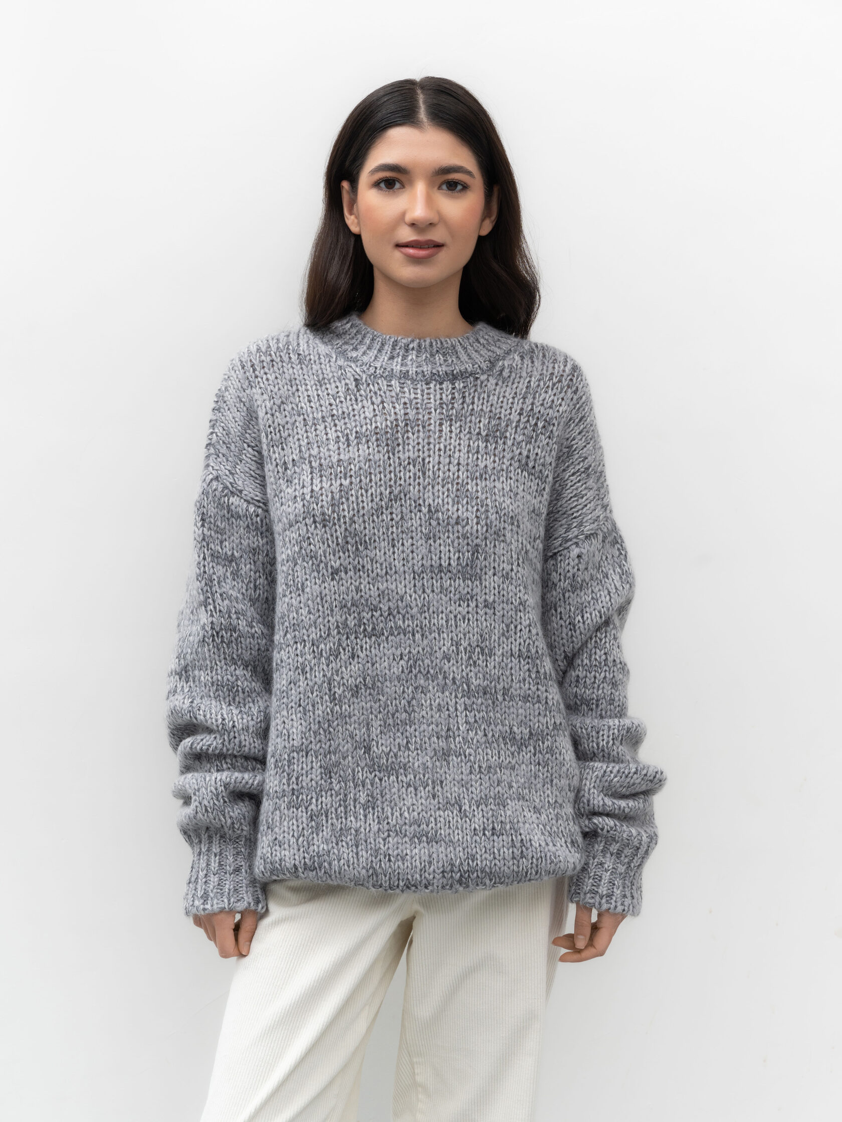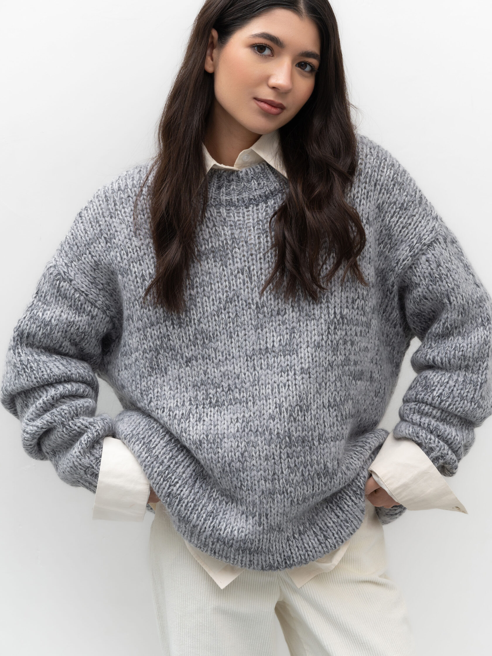 Объёмный свитер из мягкого мохера и шерсти теперь доступен в оттенке «серый меланж». Сдержанный и благородный, этот цвет эффектно подчёркивает текстуру меланжевой вязки, придавая образу лаконичность и утончённость. При этом свитер полностью сохраняет свои главные достоинства — комфорт и уют. Конструктивные детали модели продуманны: спущенное плечо создаёт непринуждённый силуэт, а аккуратная резинка на запястьях гармонично завершает дизайн.