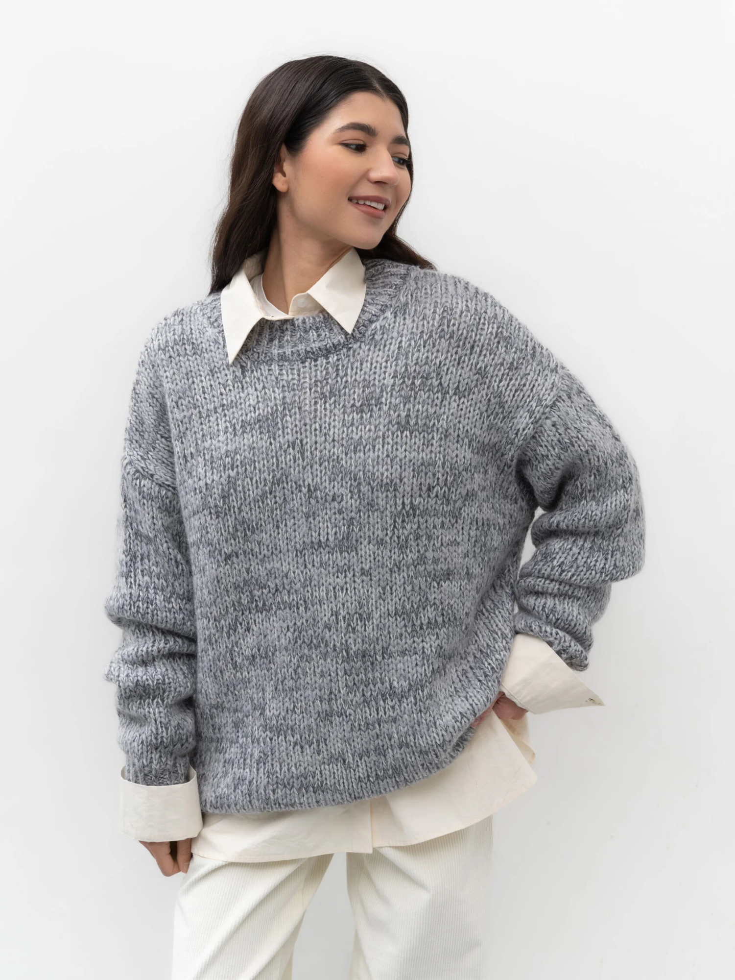 Серый меланж универсален в сочетаниях. Для деловых образов комбинируйте свитер с рубашкой и брюками — получится сдержанный, но выразительный комплект. Чтобы добавить мягкости и элегантности, носите его с юбками или платьями. Для повседневных неформальных комбинаций идеально подойдут джинсы — вместе они создадут уютный образ на прохладную погоду.