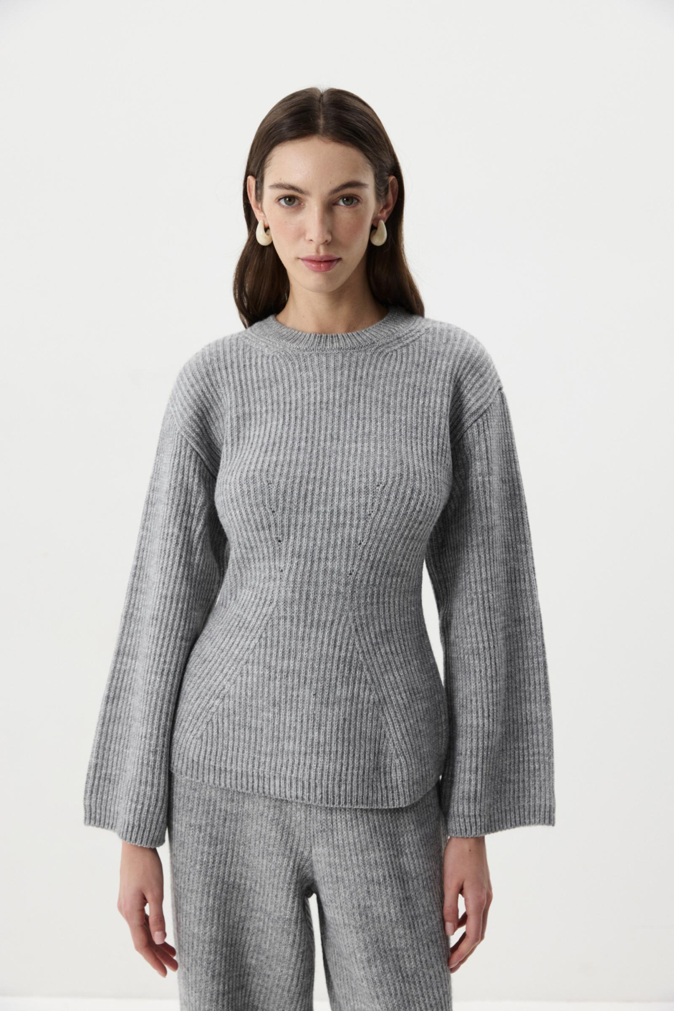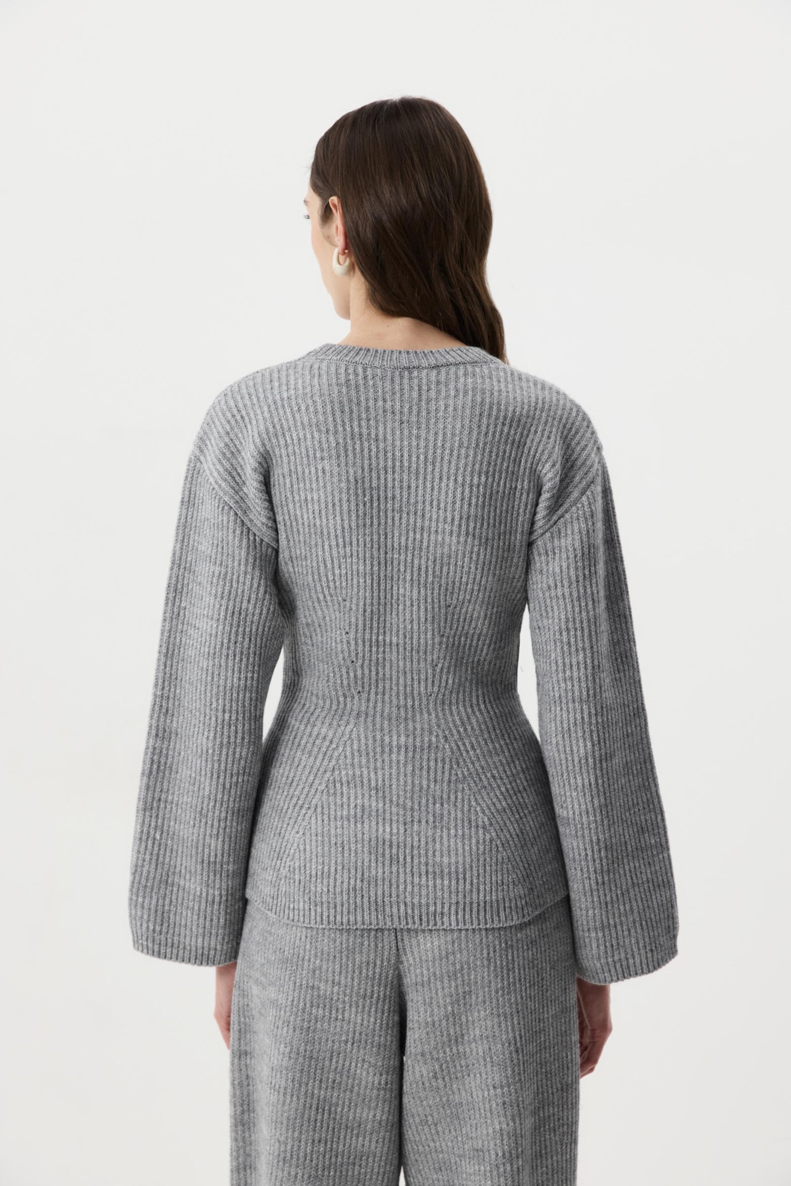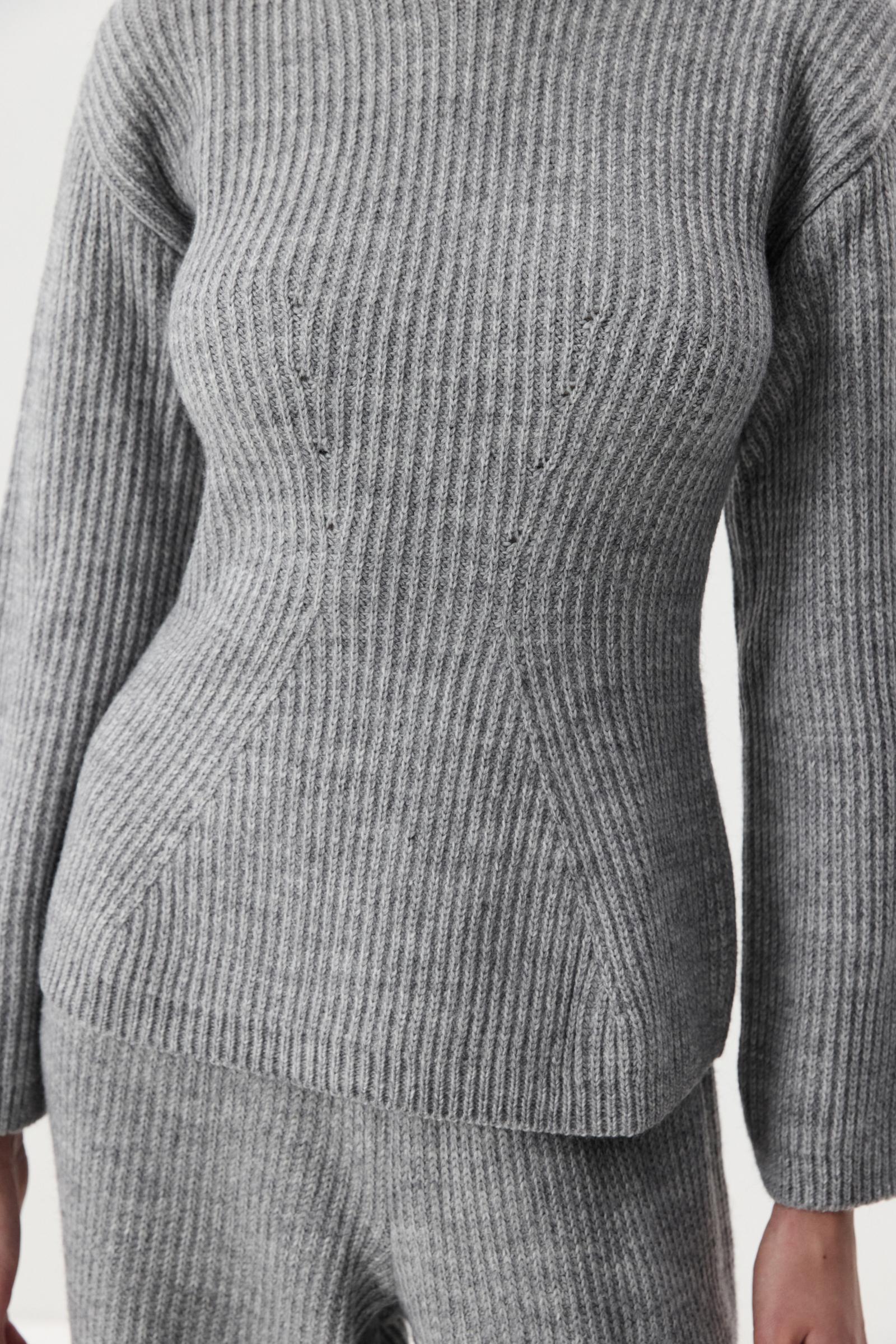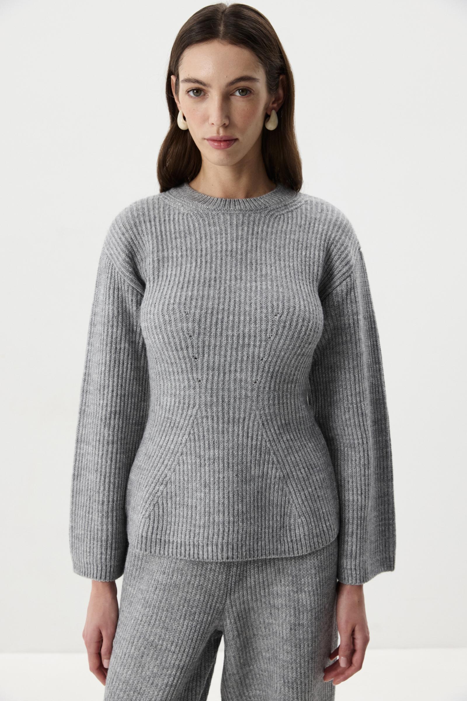 Джемпер приталенного силуэта из пряжи с шерстью в составе. Благодаря направлению вязки формируется силуэт песочных часов. Аккуратная круглая линия горловины, акцентрированая вывязанными сбавками. Длина до линии бедер. Округлые длинные рукава.