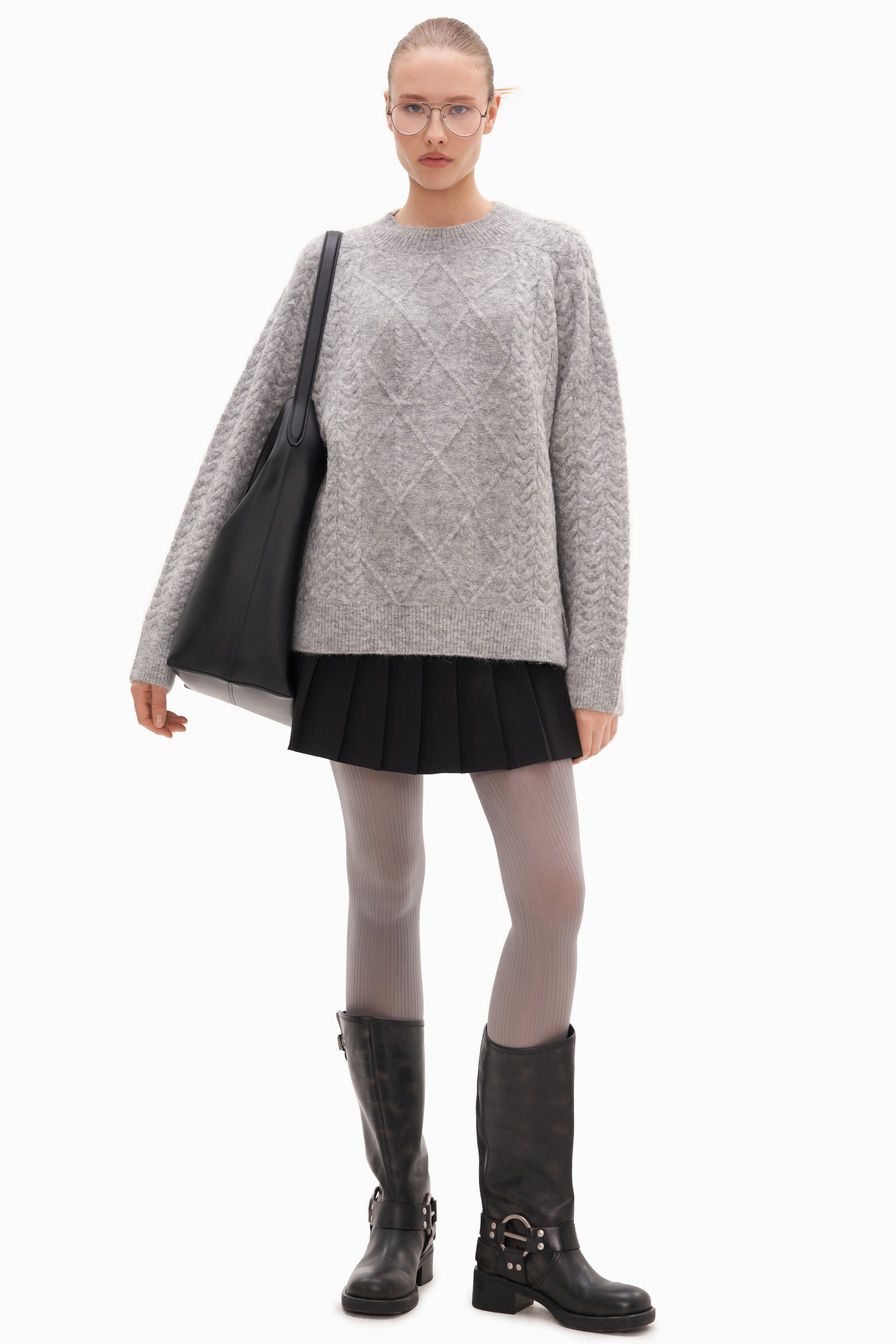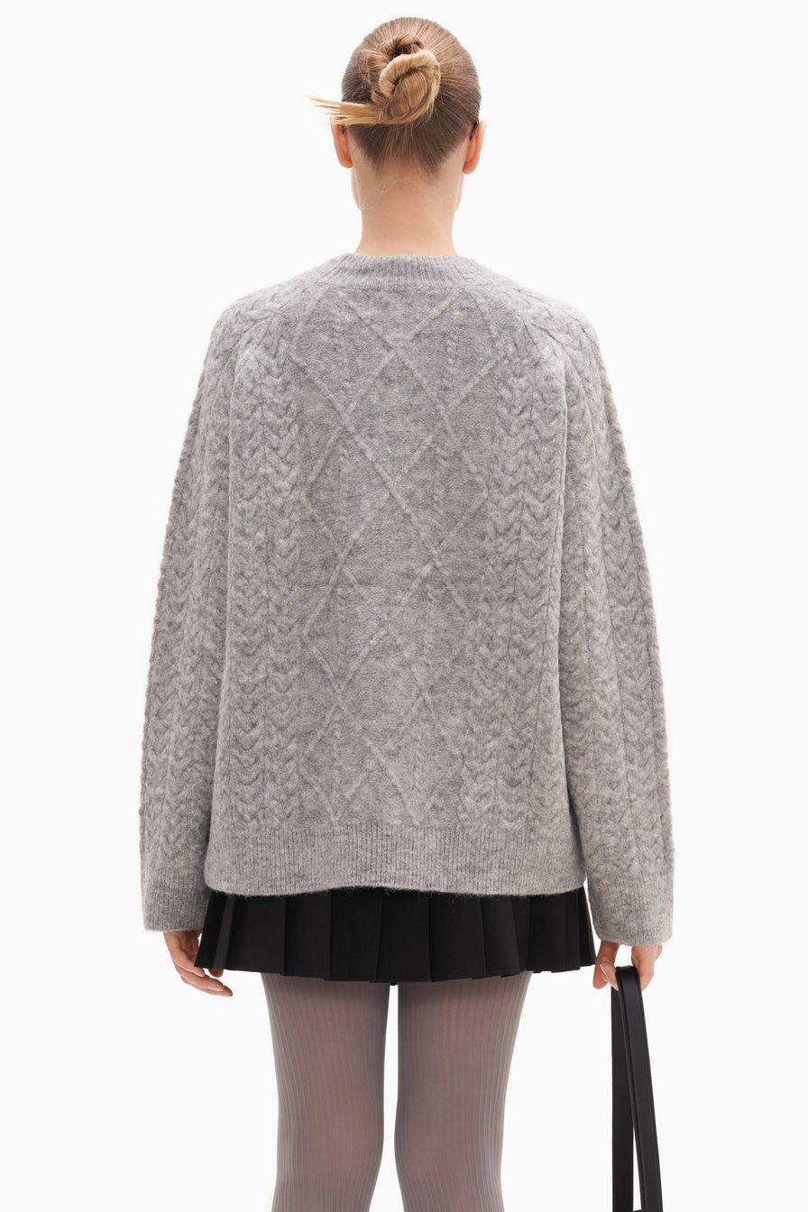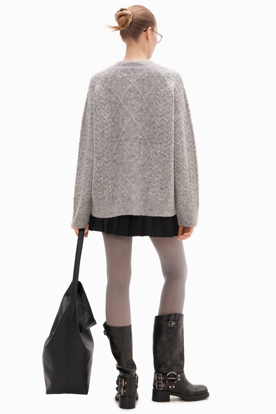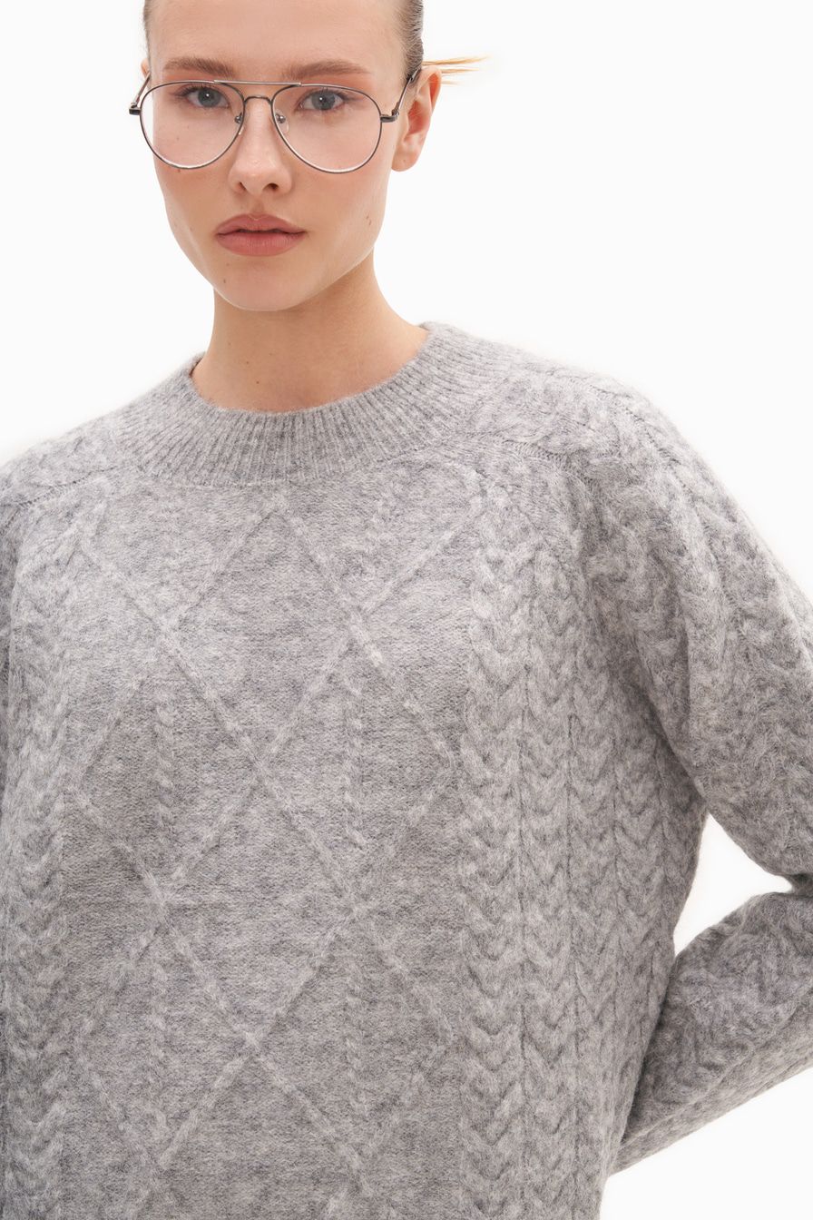 Серый джемпер из смесовой пряжи с добавлением овечьей и шерсти альпака – модель свободного кроя. Джемпер декорирован вязкой «косичка» и фактурным ромбовидным узором.