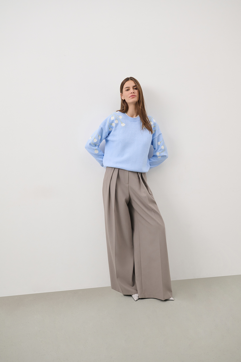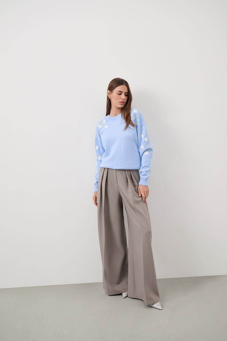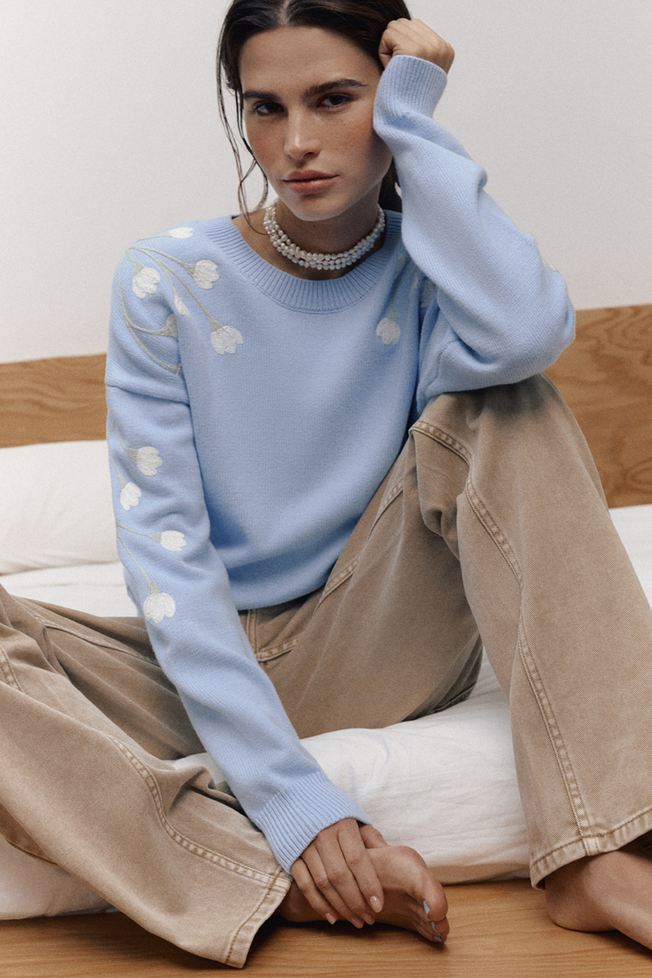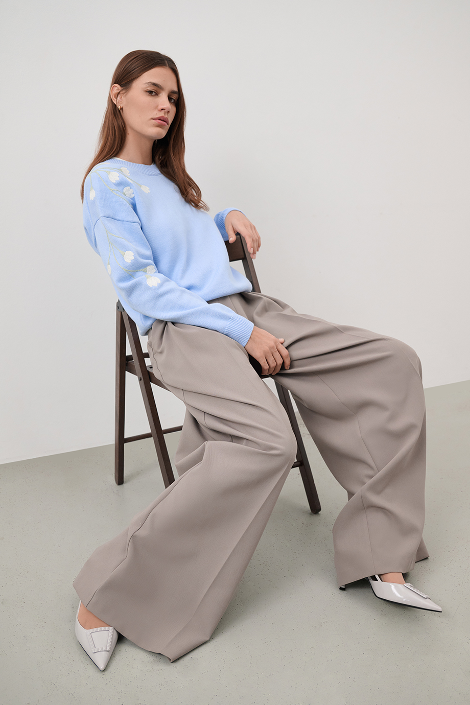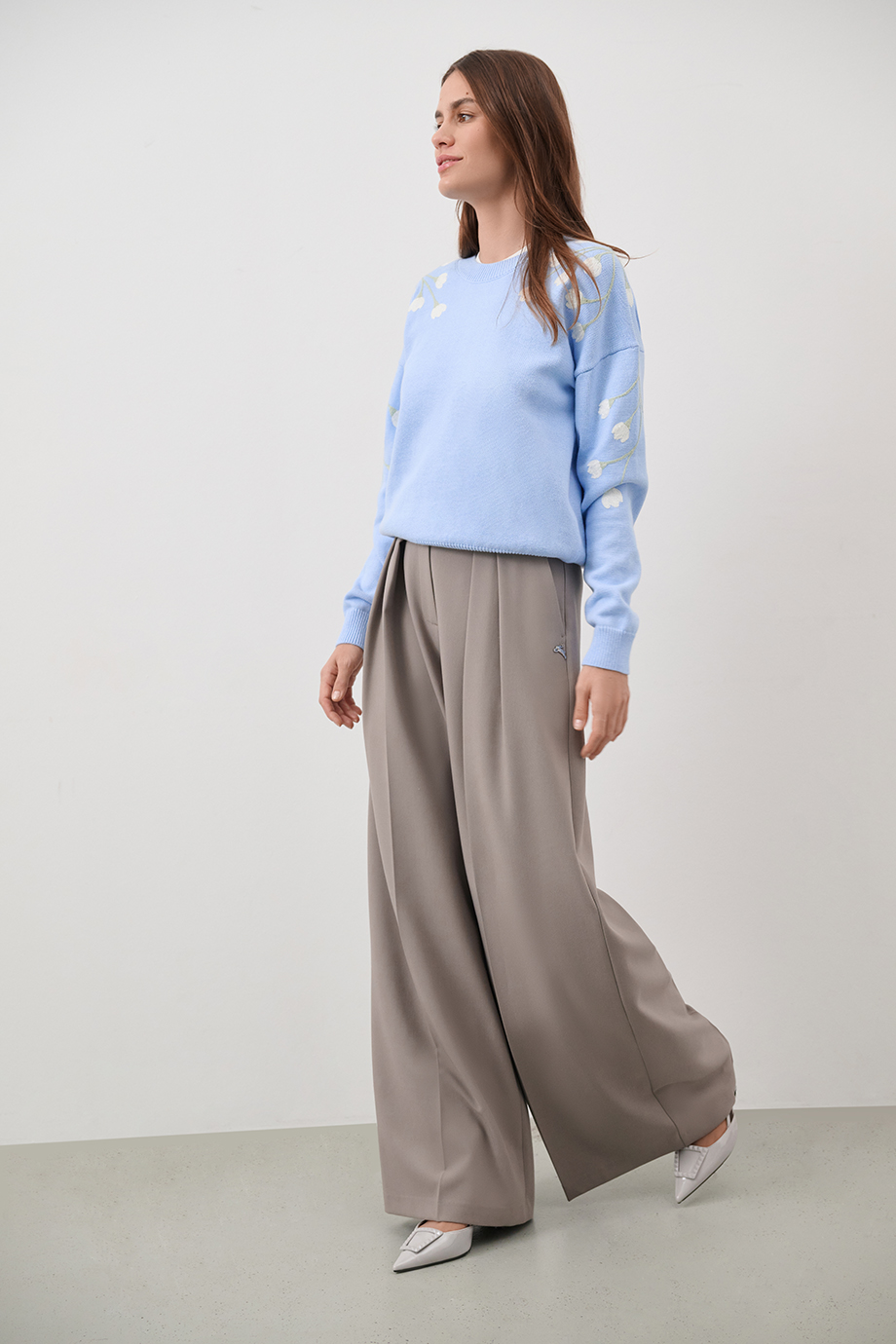 Женственный джемпер небесно-голубого оттенка выполнен из мягкого хлопка с добавлением кашемира. Модель прямого силуэта с эластичными манжетами на рукавах и изящной вышивкой подснежников на рукавах.