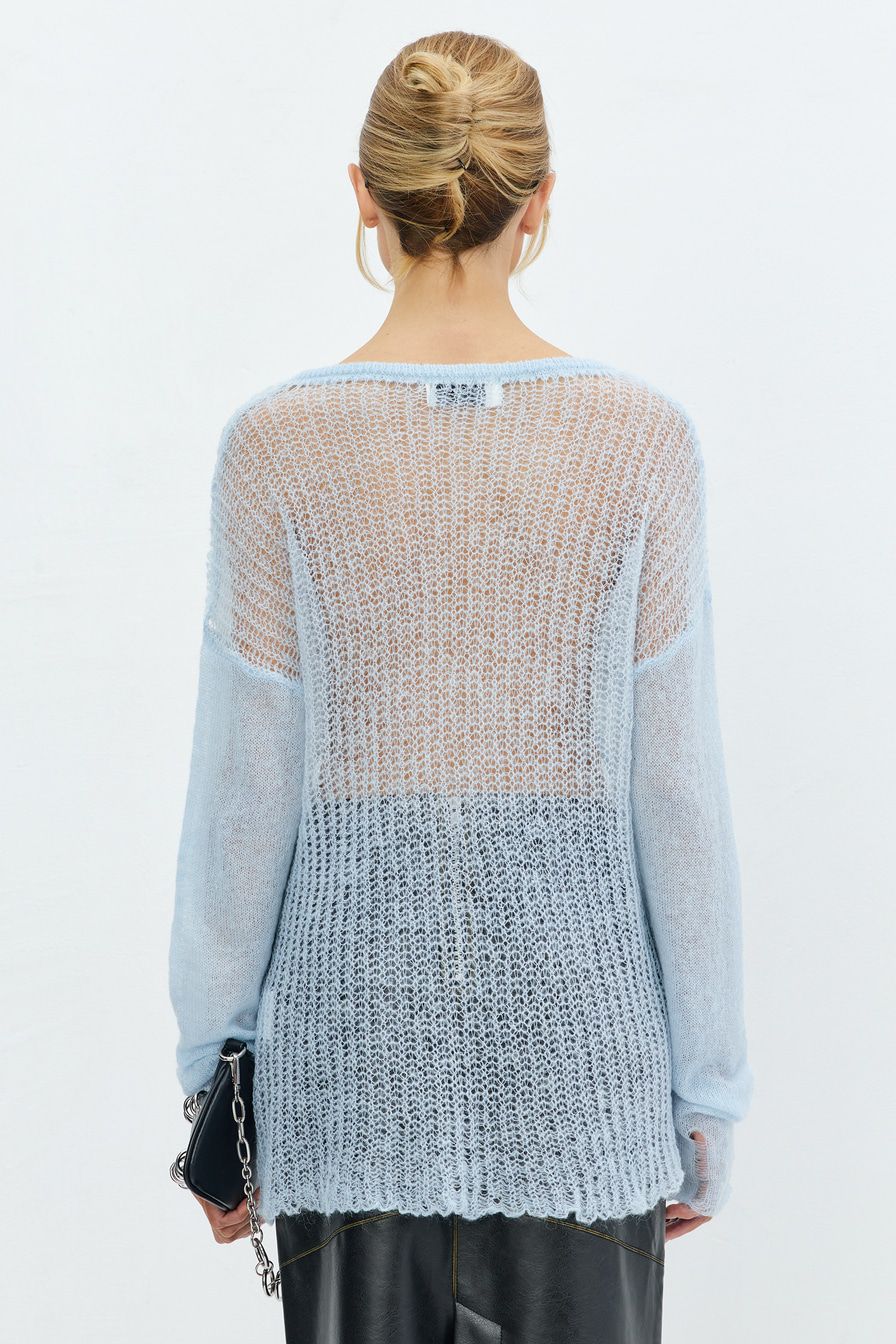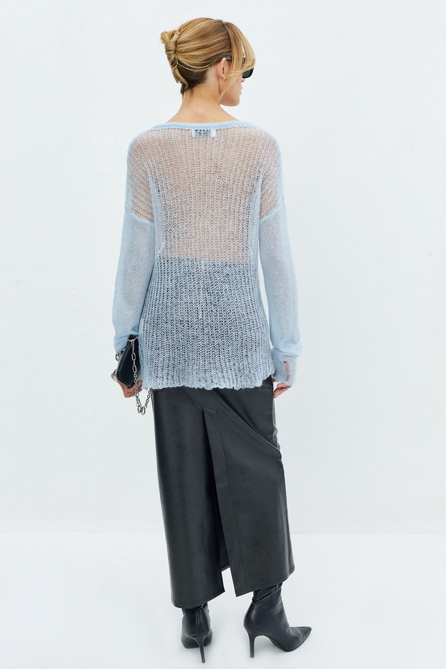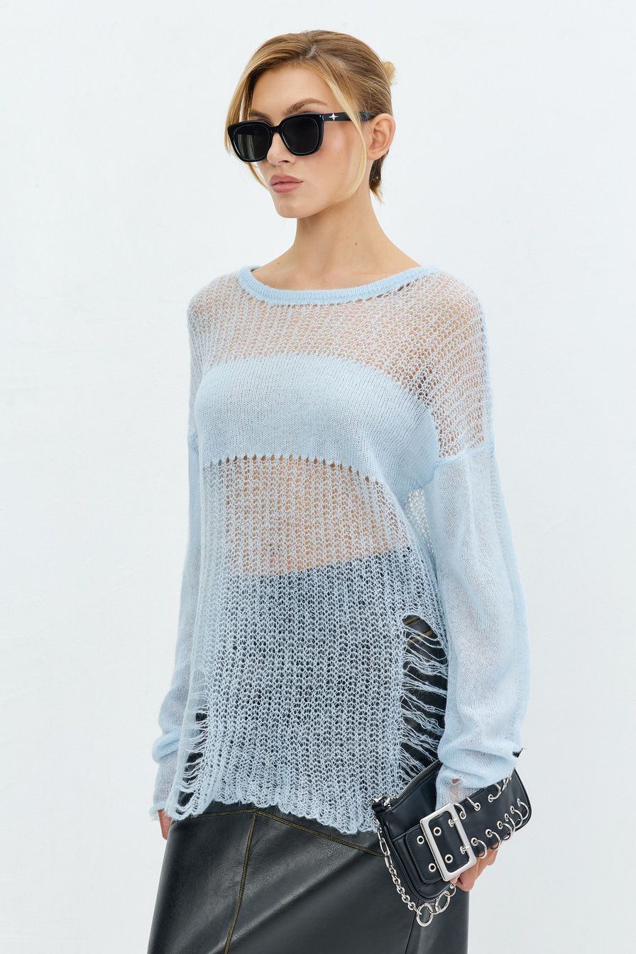 Полупрозрачный джемпер-паутинка из смесовой ткани с добавлением шерсти и мохера – модель свободного, удлиненного кроя. Джемпер выполнен в светло-голубом цвете.