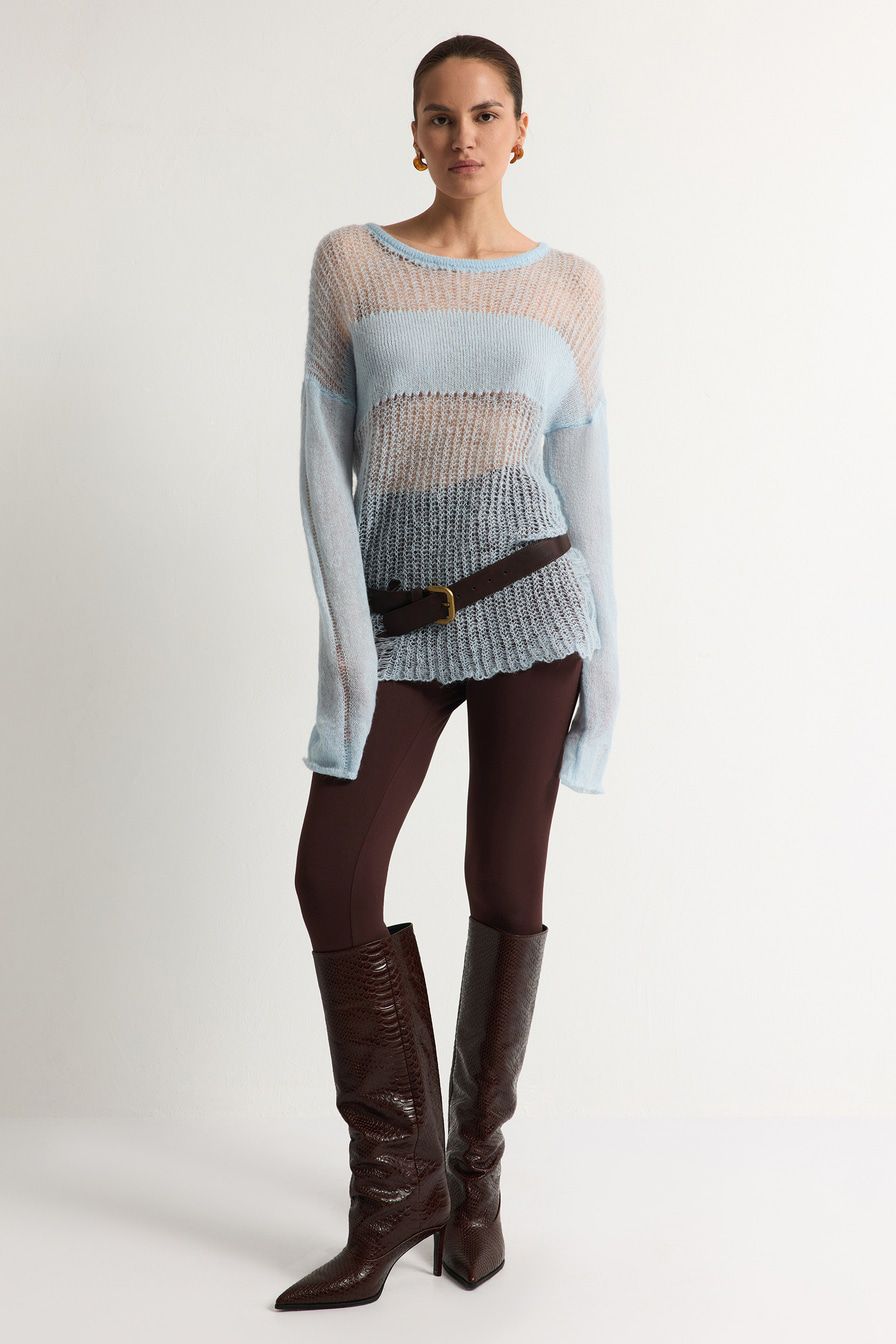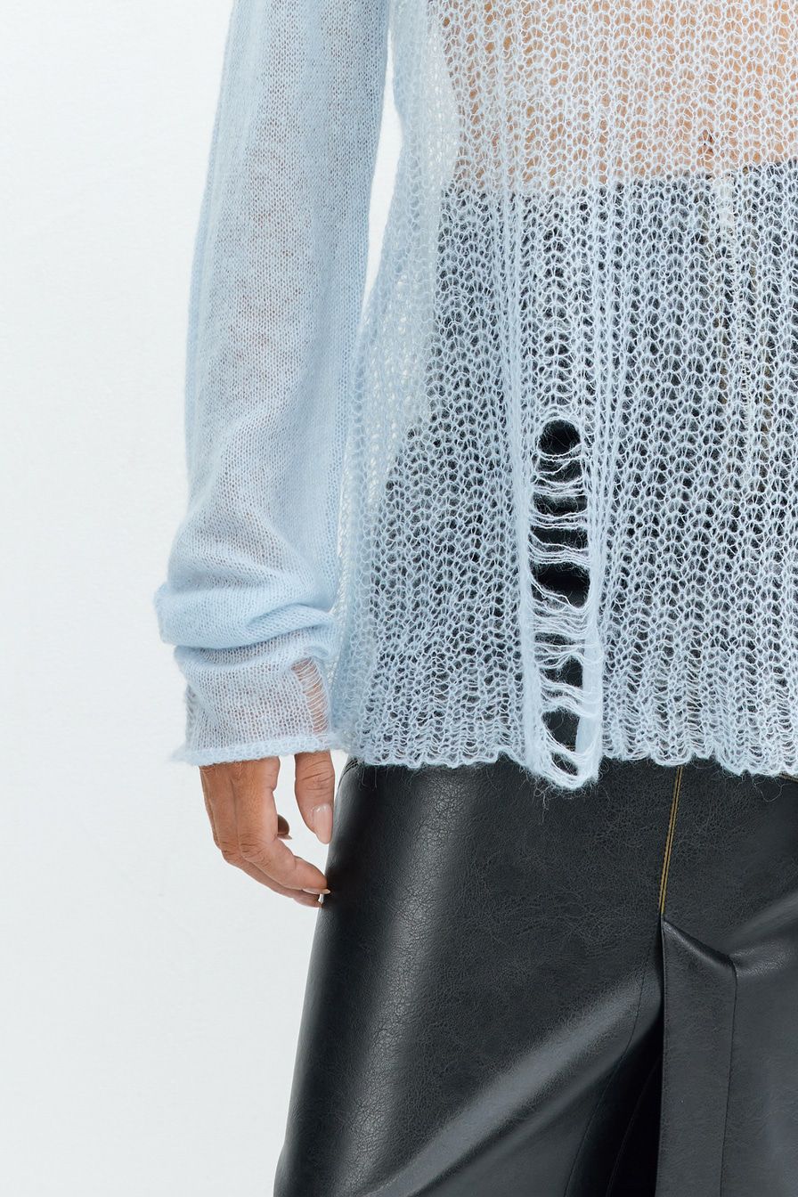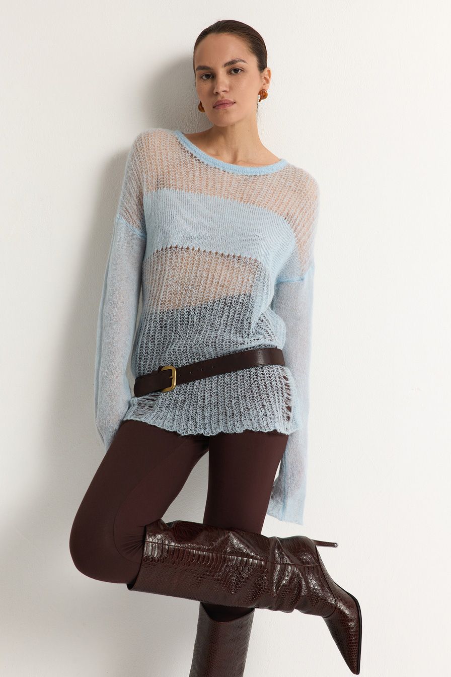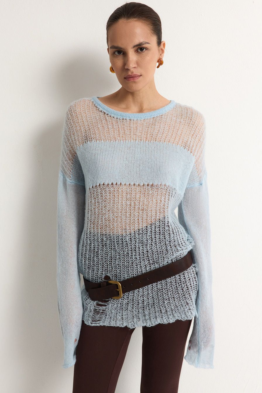 Полупрозрачный джемпер-паутинка из смесовой ткани с добавлением шерсти и мохера – модель свободного, удлиненного кроя. Джемпер выполнен в светло-голубом цвете.