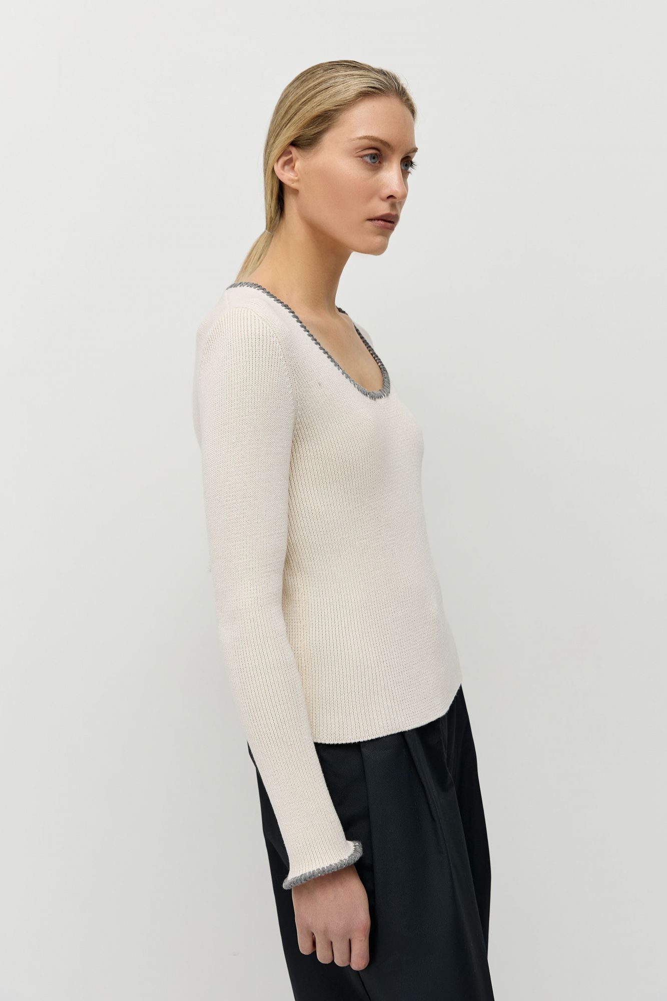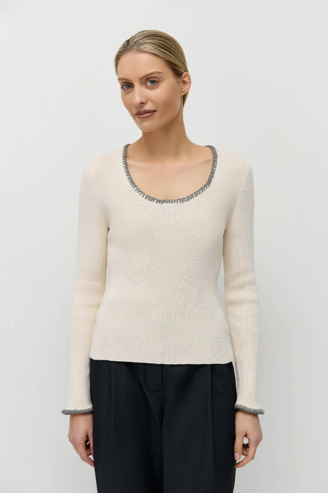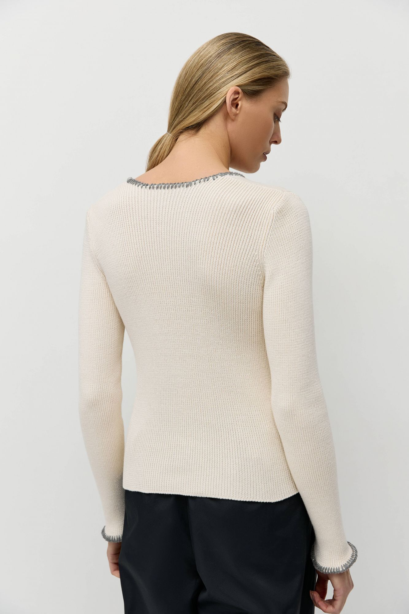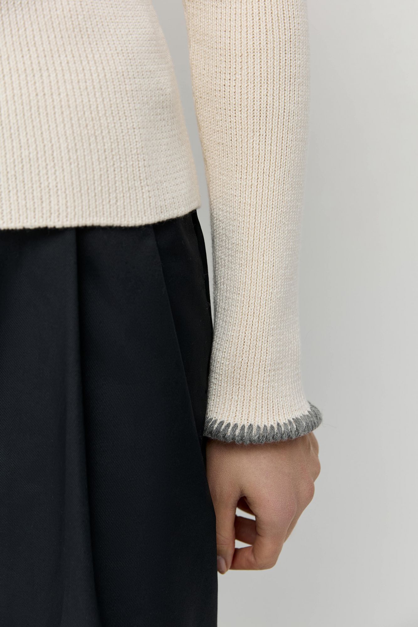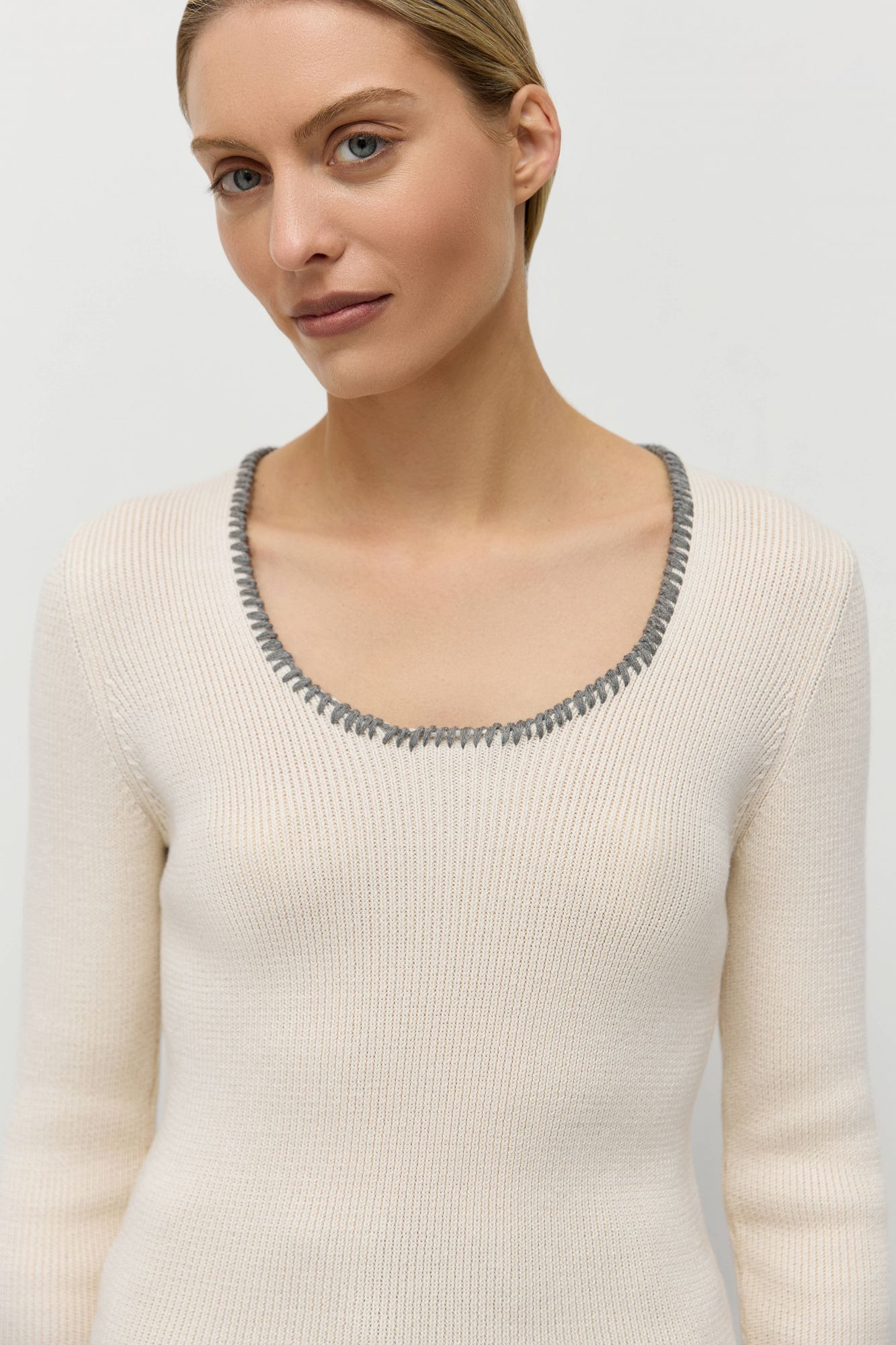 Джемпер прямого кроя связан в мелкий рубчик из натурального хлопка с легкой примесью акрила для стабильности и долговечности.