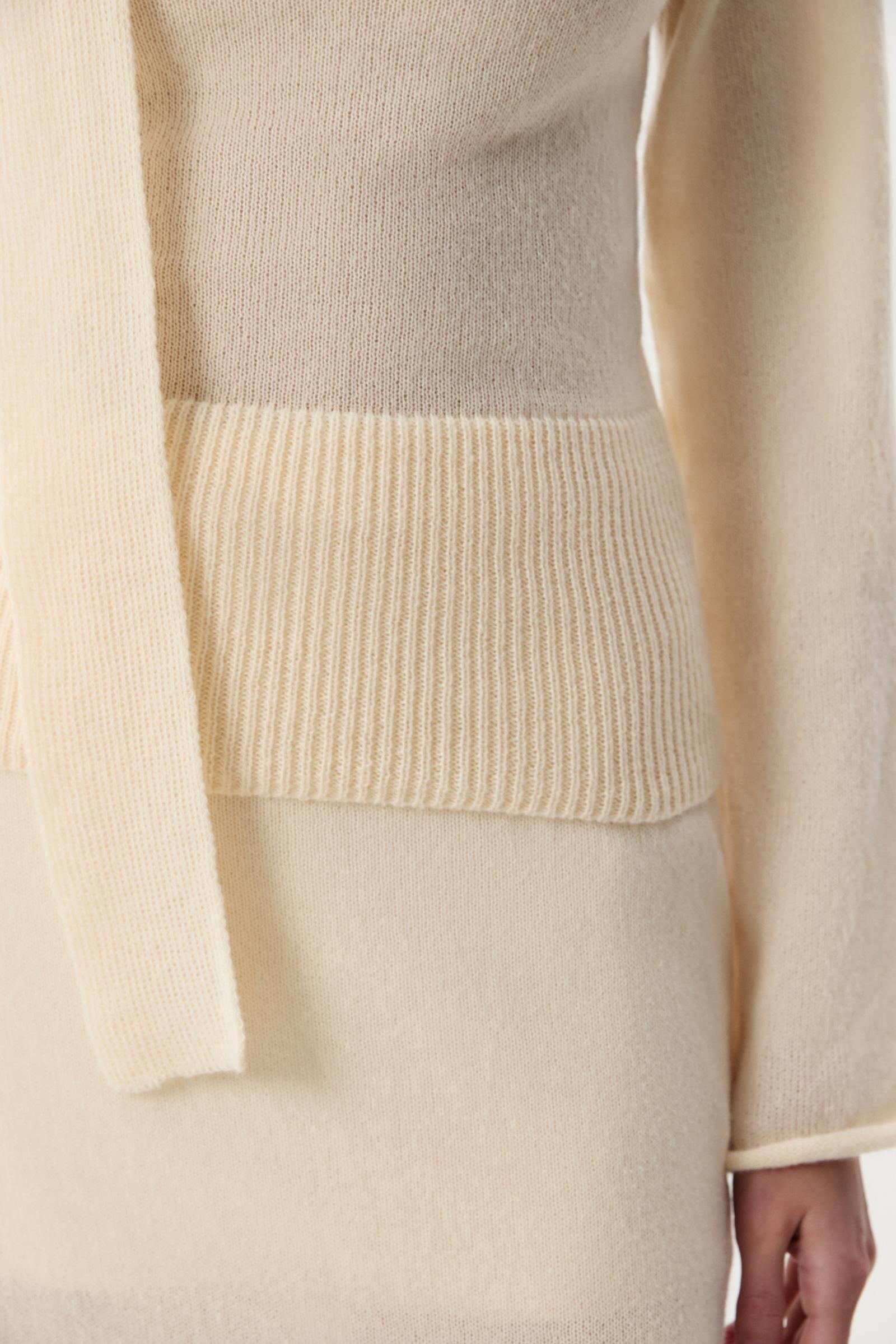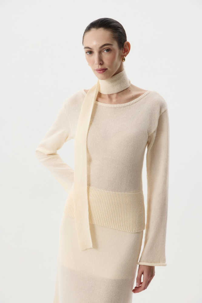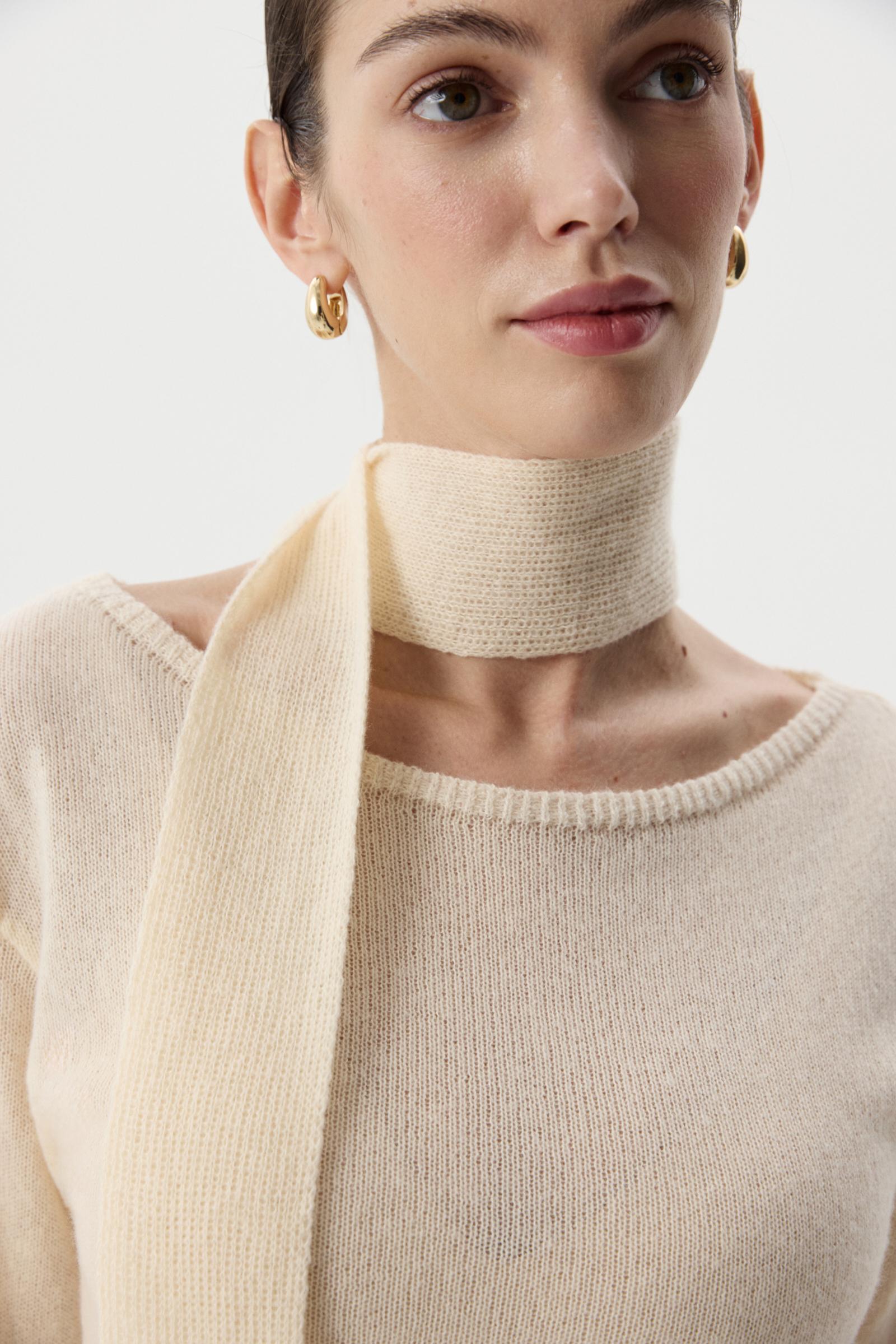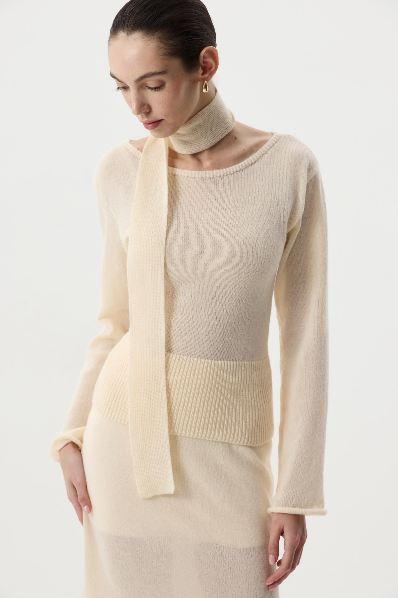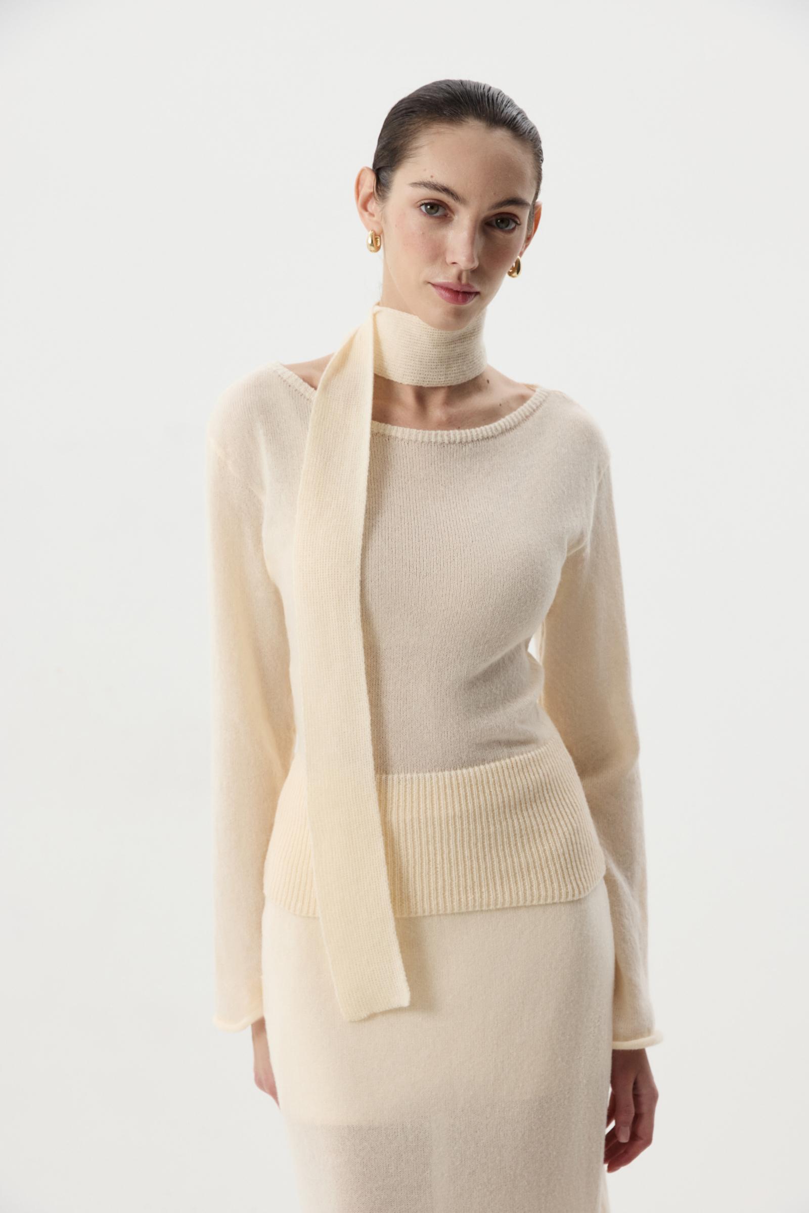 В комплекте с лонгсливом шарфик, позволяющий стилизовать изделие и дополнять свой образ женственным акцентом. Сочетайте лонгслив с юбкой из идентичной пряжи.