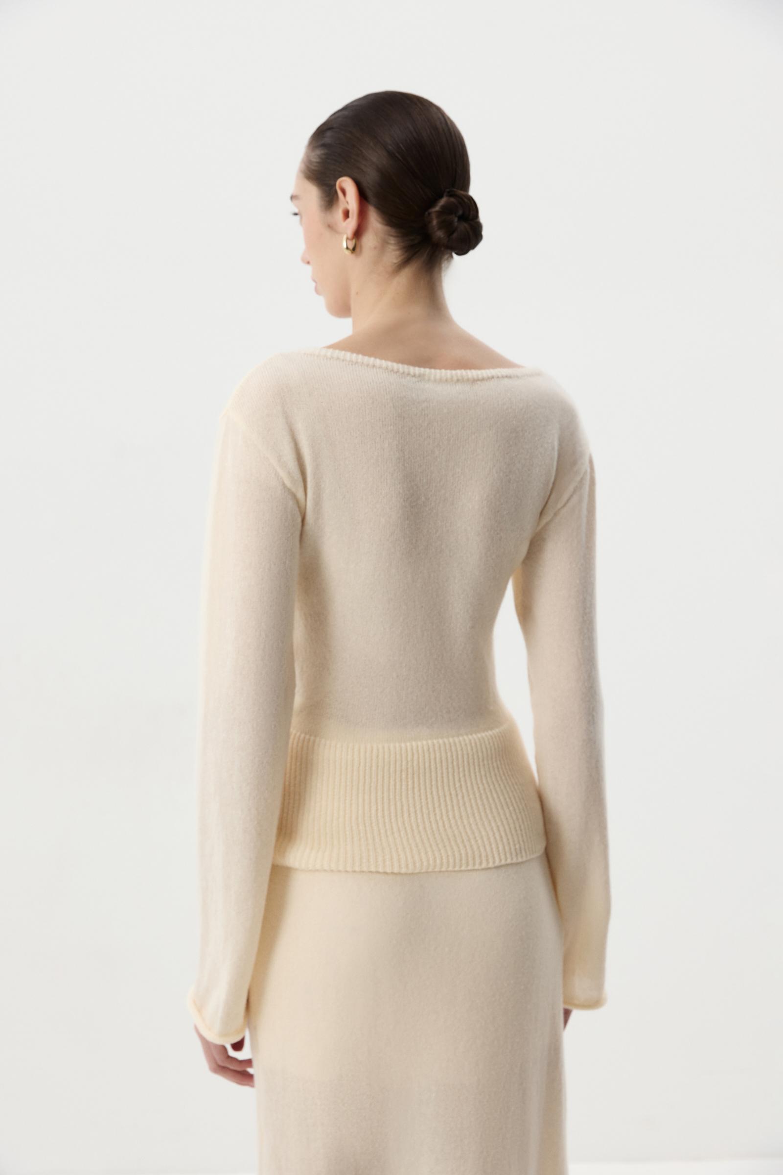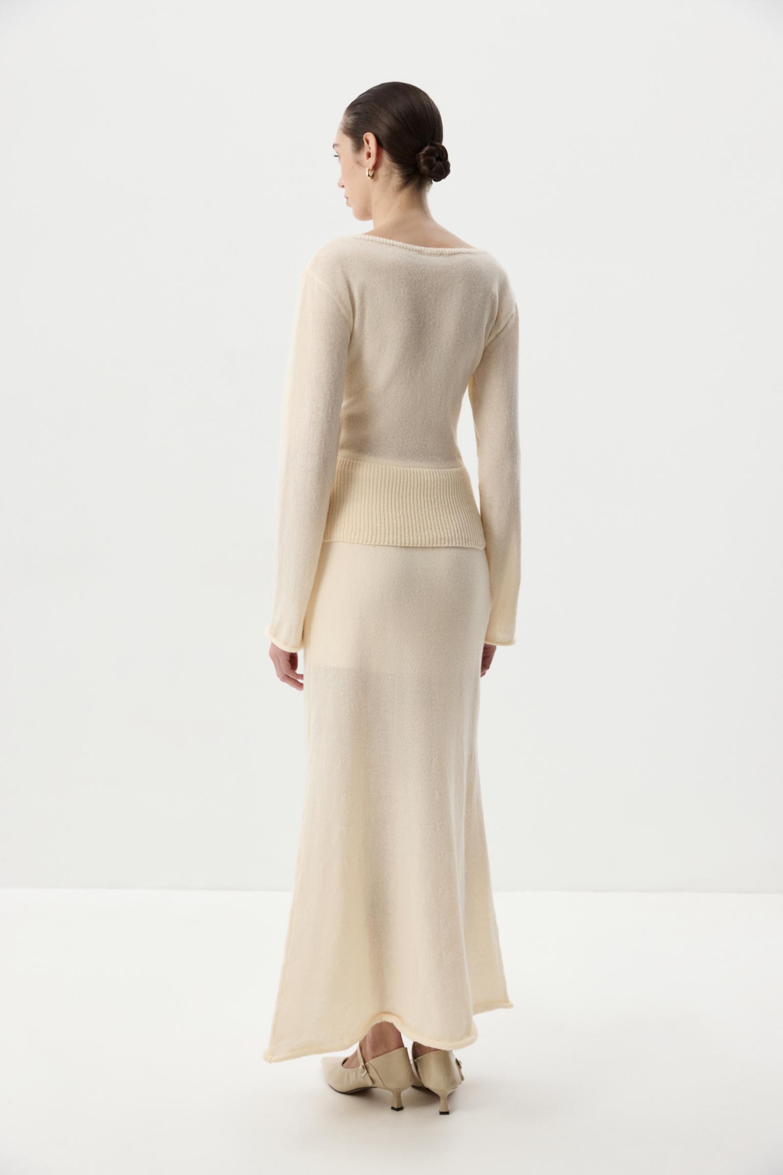 Ажурный лонгсив из мягкой пряжи с мохером в составе. Горловина лодка подчеркивает линию ключиц. По линии низа широкий рубчик, формирующий женственный силуэт.