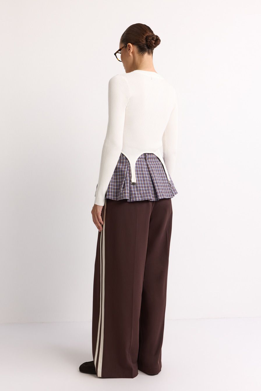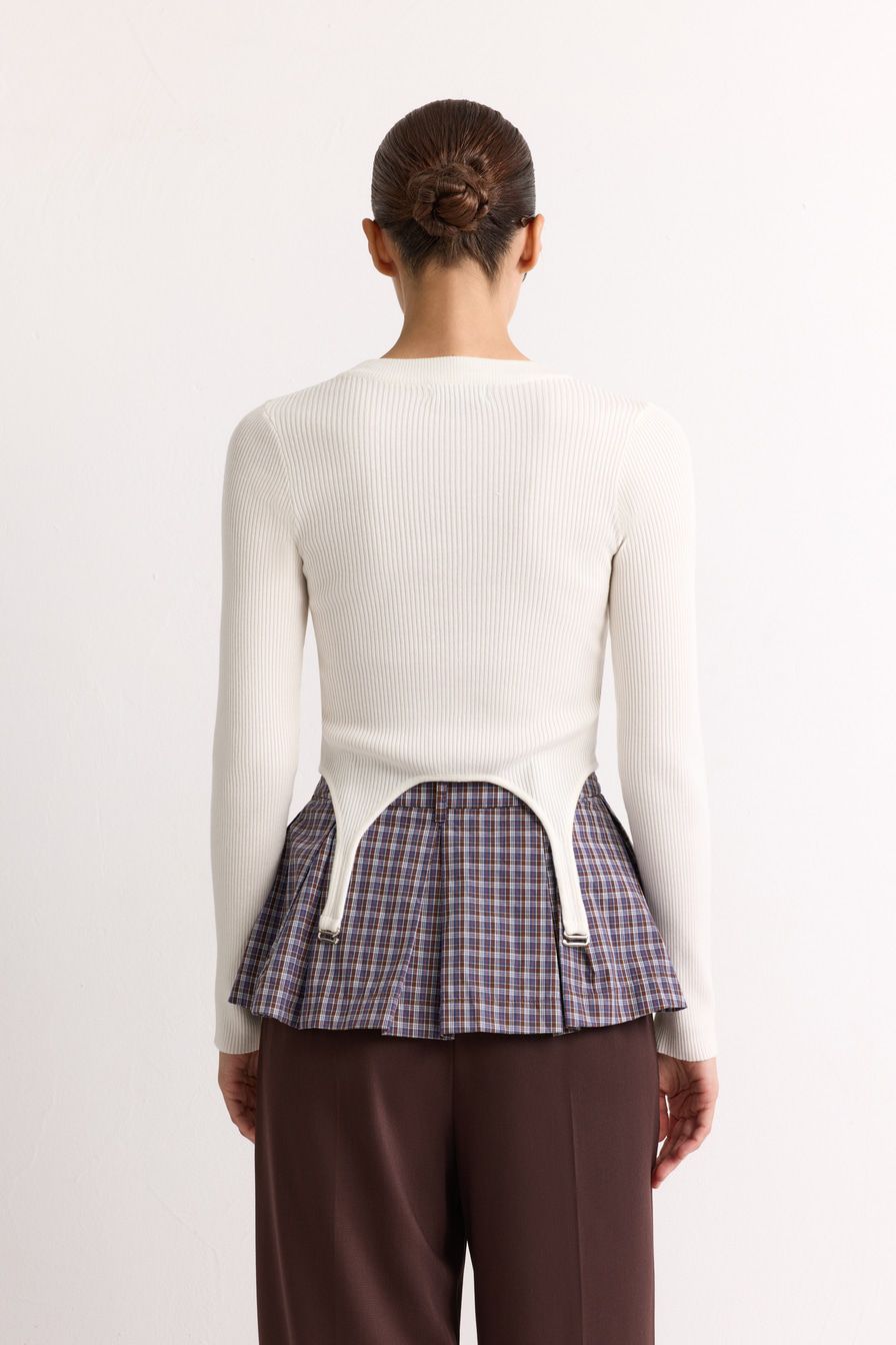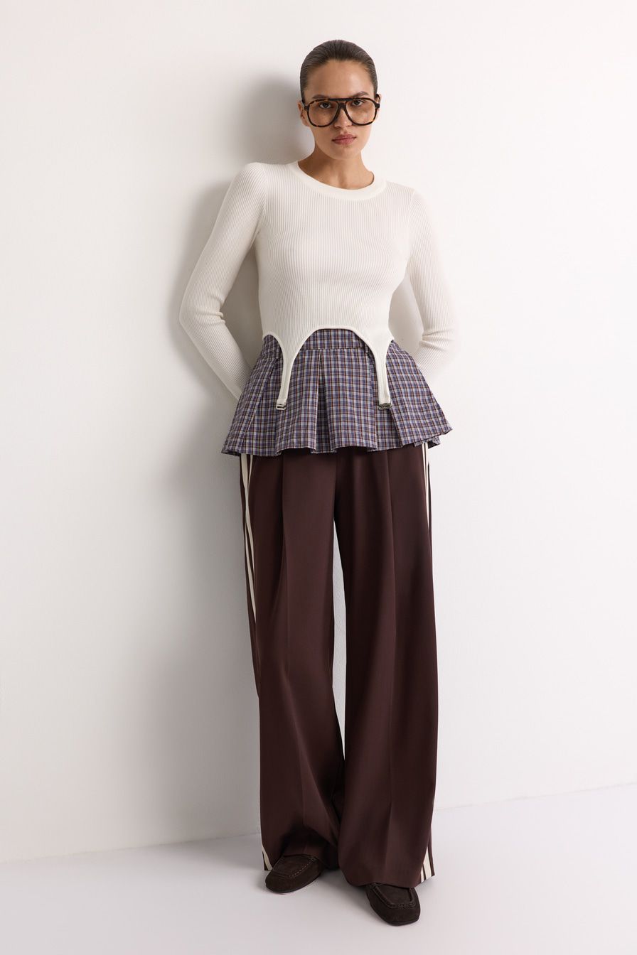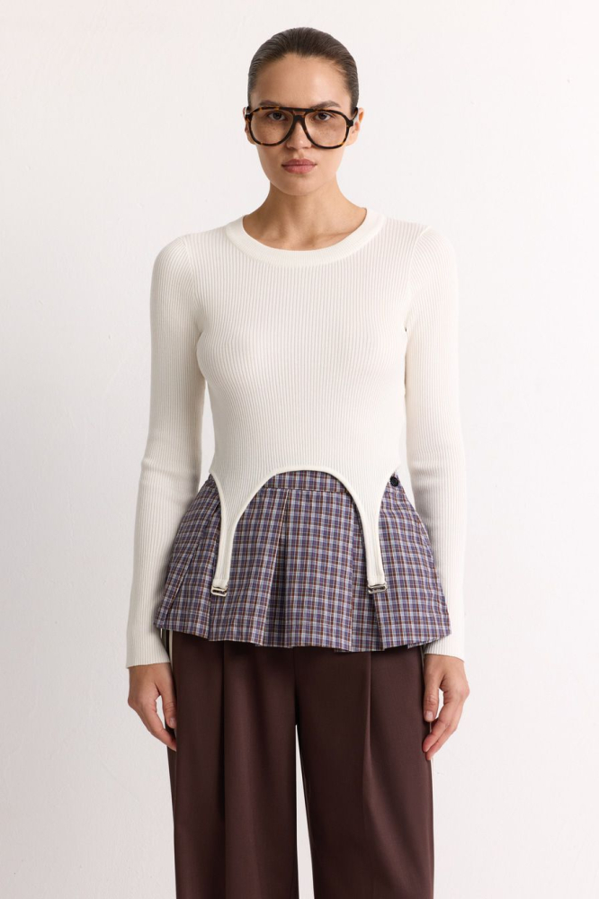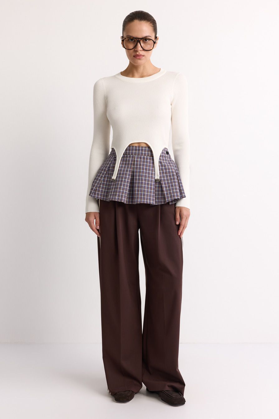 Укороченный облегающий джемпер выполнен из смесовой вискозы с фактурой в рубчик и дополнен декоративными лямками. В комплекте с джемпером идет юбка-баска со встречными складками и принтом «клетка».