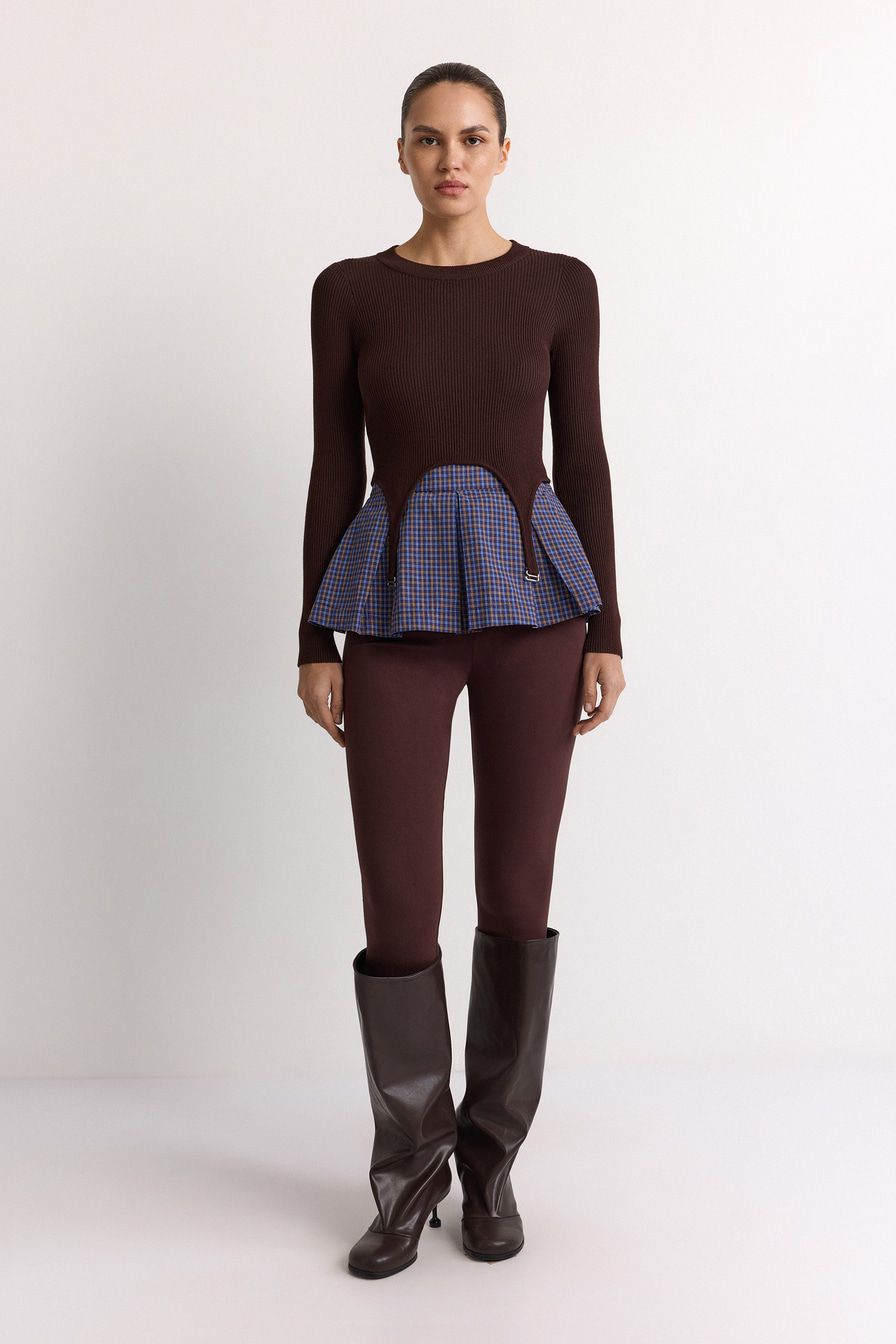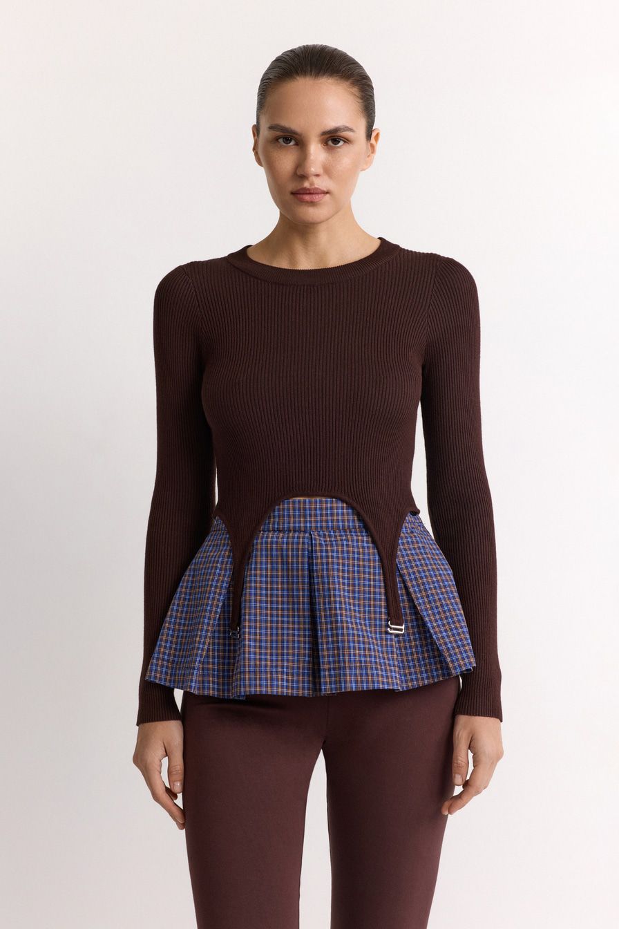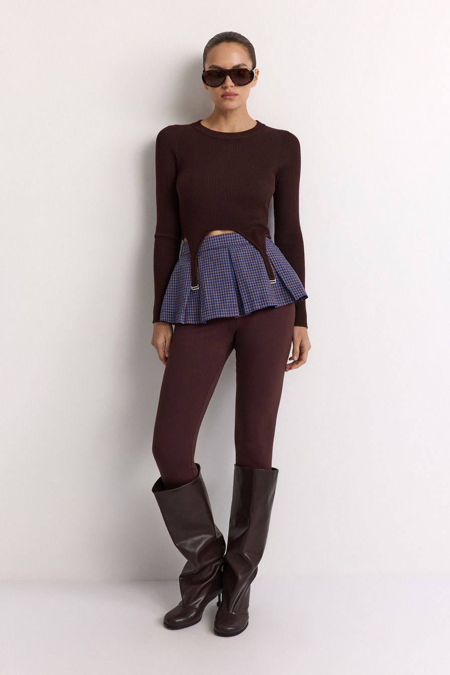 Укороченный облегающий джемпер выполнен из смесовой вискозы с фактурой в рубчик и дополнен декоративными лямками. В комплекте с джемпером идет юбка-баска со встречными складками и принтом «клетка».
